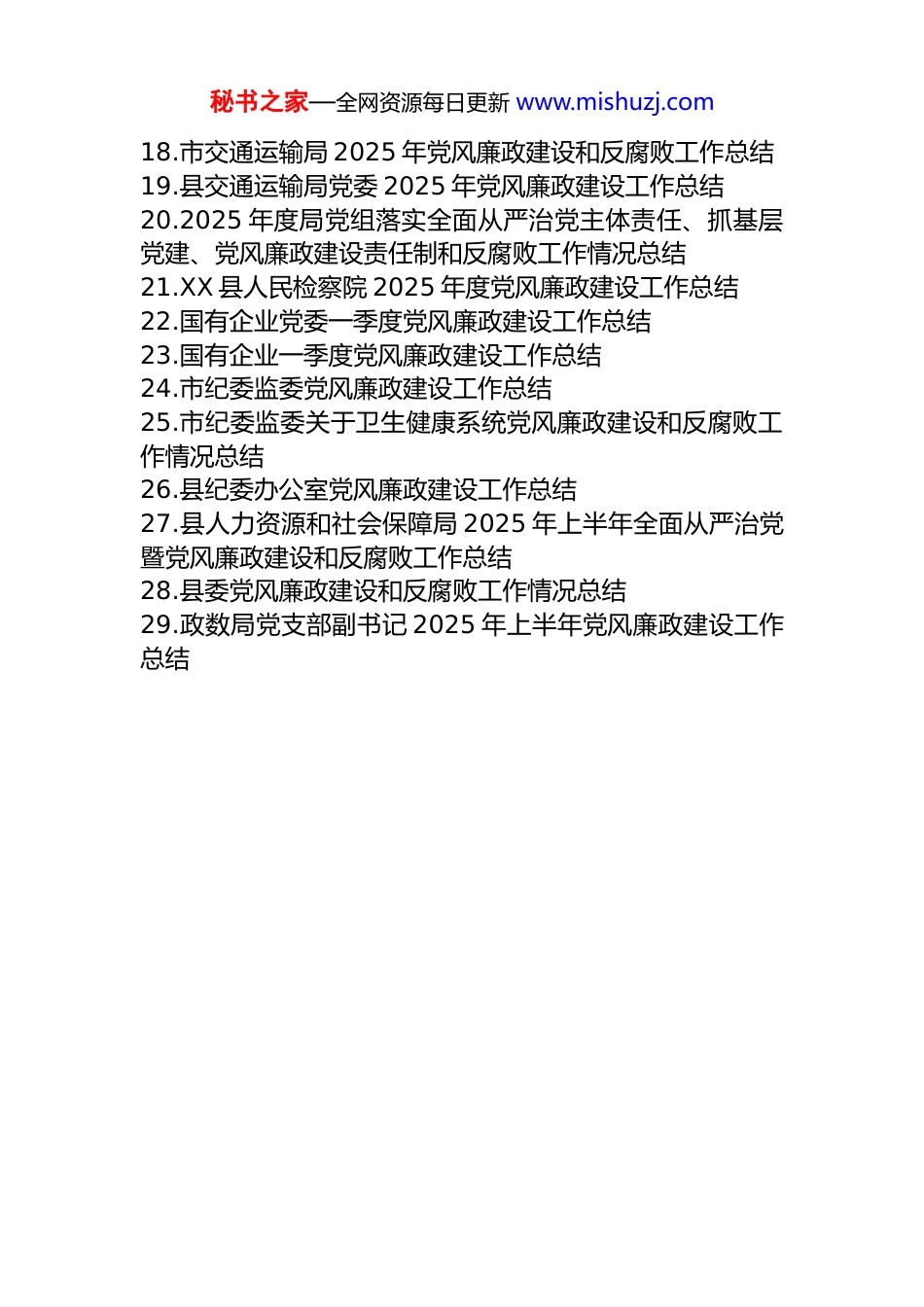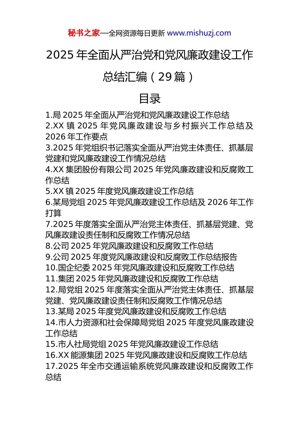 秘书之家—全网资源每日更新 www.mishuzj.com2025 年全面从严治党和党风廉政建设工作总结汇编(29 篇)目录1.局 2025 年全面从严治党和党风廉政建设工作总结2.XX 镇 2025 年党风廉政建设与乡村振兴工作总结及2026 年工作要点3.2025 年党组织书记落实全面从严治党主体责任、抓基层党建和党风廉政建设工作情况总结4.XX 集团股份有限公司 2025 年党风廉政建设和反腐败工作总结5.XX 镇 2025 年度党风廉政建设工作总结6.某局党组 2025 年党风廉政建设工作总结及 2026 年工作打算7.2025 年度落实全面从严治党主体责任、抓基层党建、党风廉政建设责任制和反腐败工作情况总结8.公司 2025 年党风廉政建设和反腐败工作总结9.公司 2025 年度党风廉政建设和反腐败工作总结报告10.国企纪委 2025 年党风廉政建设和反腐败工作总结11.集团 2025 年党风廉政建设和反腐败工作总结12.局党组 2025 年度落实全面从严治党主体责任、抓基层党建、党风廉政建设责任制和反腐败工作情况总结13.某局 2025 年度党风廉政建设和反腐败工作总结14.市人力资源和社会保障局党组 2025 年度党风廉政建设工作总结15.市人社局党组 2025 年党风廉政建设工作总结16.XX 能源集团 2025 年党风廉政建设和反腐败工作总结17.2025 年全市交通运输系统党风廉政建设和反腐败工作总结秘书之家—全网资源每日更新 www.mishuzj.com18.市交通运输局 2025 年党风廉政建设和反腐败工作总结19.县交通运输局党委 2025 年党风廉政建设工作总结20.2025 年度局党组落实全面从严治党主体责任、抓基层党建、党风廉政建设责任制和反腐败工作情况总结21.XX 县人民检察院 2025 年度党风廉政建设工作总结22.国有企业党委一季度党风廉政建设工作总结23.国有企业一季度党风廉政建设工作总结24.市纪委监委党风廉政建设工作总结25.市纪委监委关于卫生健康系统党风廉政建设和反腐败工作情况总结26.县纪委办公室党风廉政建设工作总结27.县人力资源和社会保障局 2025 年上半年全面从严治党暨党风廉政建设和反腐败工作总结28.县委党风廉政建设和反腐败工作情况总结29.政数局党支部副书记 2025 年上半年党风廉政建设工作总结秘书之家—全网资源每日更新 www.mishuzj.com局 2025 年全面从严治党和党风廉政建设工作总结一年来,局党组始终坚持以习近平新时代中国特色社会主义思想为指导,深入学习贯彻党的二十大和二十届历次全会精神,深刻领悟“两个确立”的决定性意义,坚决做到“两个维护”,坚决扛起全面从严治党主体责任,以党的政治建设为统领,以自我革命精神正风肃纪反腐,一体推进不敢腐、不能腐、不想腐,推动全面从严治党向纵深发展,为局各项事业在高质量发展的轨道上行稳致远提供了坚强有力的政治引领和政治保障。一、聚焦“两个维护”,在强化政治建设上彰显新高度(一)突出政治忠诚,把稳思想之舵。一是严格执行“第一议题”制度。我们坚持把学习贯彻习近平新时代中国特色社会主义思想作为首要政治任务,全年组织党组会“第一议题”学习 X 次,第一时间传达学习习近平总书记最新重要讲话和重要指示批示精神,紧密结合局实际研究贯彻落实举措,确保全局工作始终沿着总书记指引的正确方向前进。二是深化理论学习中心组引领。高标准组织党组理论学习中心组学习 X 次,围绕党的二十大精神、党章党规党纪等重点内容开展专题研讨 X 次,班子成员带头撰写心得体会 X 篇,以“关键少数”的示范带动,引领全体党员干部在学思践悟中筑牢信仰之基、补足精神之钙。三是强化政治监督具体化、精准化、常态化。我们紧紧围绕党中央关于经济社会发展、安全生产、民生保障等重大决策部署,制定专项监督检查方案 X 个,开展政治监督 X 轮次,发现并督促整改问题 X 个,有力推动了政令畅通、令秘书之家—全网资源每日更新 www.mishuzj.com行禁止。(二)严明政治纪律,筑牢规矩之堤。一是深入开展纪律教育。我们将政治纪律和政治规矩教育作为干部教育培训的必修课,组织党员干部深入学习《关于新形势下党内政治生活的若干准则》《中国共产党纪律处分条例》等党内法规,邀请市纪委监委专家...