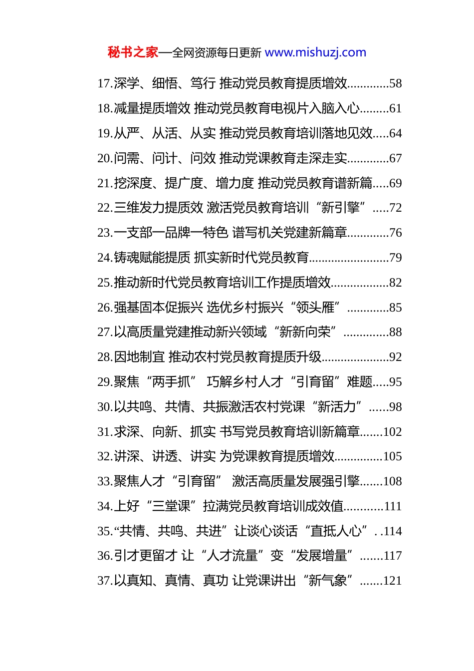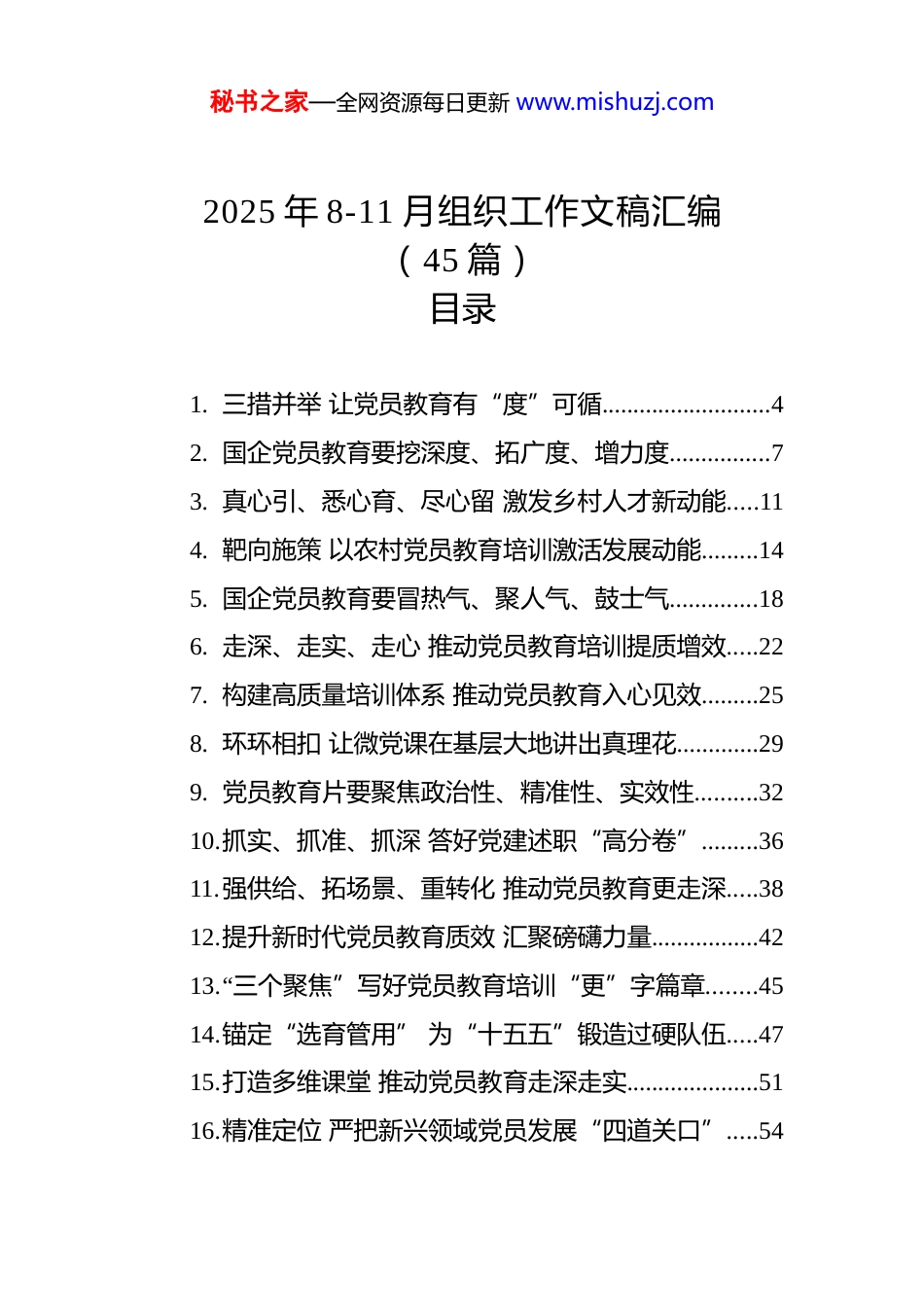 秘书之家—全网资源每日更新 www.mishuzj.com2025 年 8-11 月组织工作文稿汇编(45 篇)目录1. 三措并举 让党员教育有“度”可循...........................42. 国企党员教育要挖深度、拓广度、增力度................73. 真心引、悉心育、尽心留 激发乡村人才新动能.....114. 靶向施策 以农村党员教育培训激活发展动能.........145. 国企党员教育要冒热气、聚人气、鼓士气..............186. 走深、走实、走心 推动党员教育培训提质增效.....227. 构建高质量培训体系 推动党员教育入心见效.........258. 环环相扣 让微党课在基层大地讲出真理花.............299. 党员教育片要聚焦政治性、精准性、实效性..........3210.抓实、抓准、抓深 答好党建述职“高分卷”.........3611.强供给、拓场景、重转化 推动党员教育更走深.....3812.提升新时代党员教育质效 汇聚磅礴力量.................4213.“三个聚焦”写好党员教育培训“更”字篇章........4514.锚定“选育管用” 为“十五五”锻造过硬队伍.....4715.打造多维课堂 推动党员教育走深走实.....................5116.精准定位 严把新兴领域党员发展“四道关口”.....54秘书之家—全网资源每日更新 www.mishuzj.com17.深学、细悟、笃行 推动党员教育提质增效.............5818.减量提质增效 推动党员教育电视片入脑入心.........6119.从严、从活、从实 推动党员教育培训落地见效.....6420.问需、问计、问效 推动党课教育走深走实.............6721.挖深度、提广度、增力度 推动党员教育谱新篇.....6922.三维发力提质效 激活党员教育培训“新引擎”.....7223.一支部一品牌一特色 谱写机关党建新篇章.............7624.铸魂赋能提质 抓实新时代党员教育.........................7925.推动新时代党员教育培训工作提质增效..................8226.强基固本促振兴 选优乡村振兴“领头雁”.............8527.以高质量党建推动新兴领域“新新向荣”..............8828.因地制宜 推动农村党员教育提质升级.....................9229.聚焦“两手抓” 巧解乡村人才“引育留”难题.....9530.以共鸣、共情、共振激活农村党课“新活力”......9831.求深、向新、抓实 书写党员教育培训新篇章.......10232.讲深、讲透、讲实 为党课教育提质增效...............10533.聚焦人才“引育留” 激活高质量发展强引擎.......10834.上好“三堂课”拉满党员教育培训成效值............11135.“共情、共鸣、共进”让谈心谈话“直抵人心”. .11436.引才更留才 让“人才流量”变“发展增量”.......11737.以真知、真情、真功 让党课讲出“新气象”.......121秘书之家—全网资源每日更新 www.mishuzj.com38.三重举措破干部“不善为”....................................12439.与“实”俱进 让乡村人才“鸾翔凤集”...............12740.党员教育培训要“强根基、激活力、见实效”....13041.党员教育培训要有针对性、体验性、实效性........13342.精准发力 让农村党员教育培训提质增效...............13643.党员教育要强根基、求创新、重实效....................13944.以青苗培优为策 锻造新时代“年轻尖兵”...........14245.擦亮“党建红”推动乡村人才振兴........................145三措并举 让*员教育有“度”可循中共中央办公厅印发了《全国*员教育培训工作规划(2024—2028 年)》,并发出通知,要求各地区各部门结合实际认真贯彻落实。*员教育培训是*的建设基础性、经常性工作,关系*员队伍素质提升和*的事业薪火相传。各级*组织要把“实”的要求贯穿课程设置、教学组织和成果转化全过程,系统优化供给、精准对接需求、严格评估成效,努力打造与新时代新征程相匹配的高质量*员教育体系,为推进中国式现代化提供坚强组织保障。秘书之家—全网资源每日更新 www.mishuzj.com校准教学靶向,提升内容精细度。*员教育的出发点在“需”,着力点在“准”。坚持把学习贯彻**************思想作为开展教育培训的主题主线、首要任务和核心内容,构建“基础课+专题课+特色课”的梯度体系,既保证政治理论...