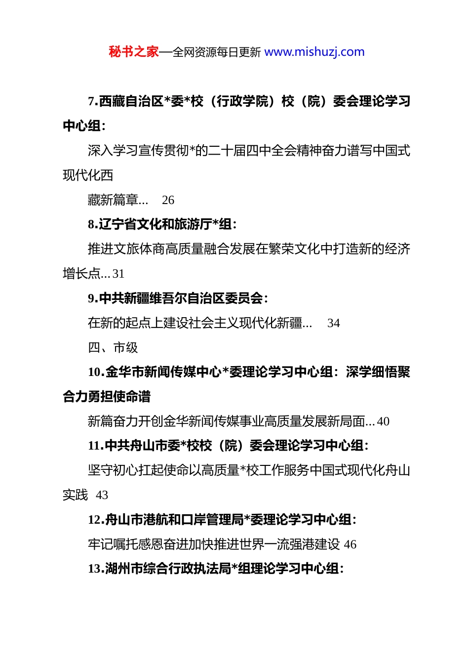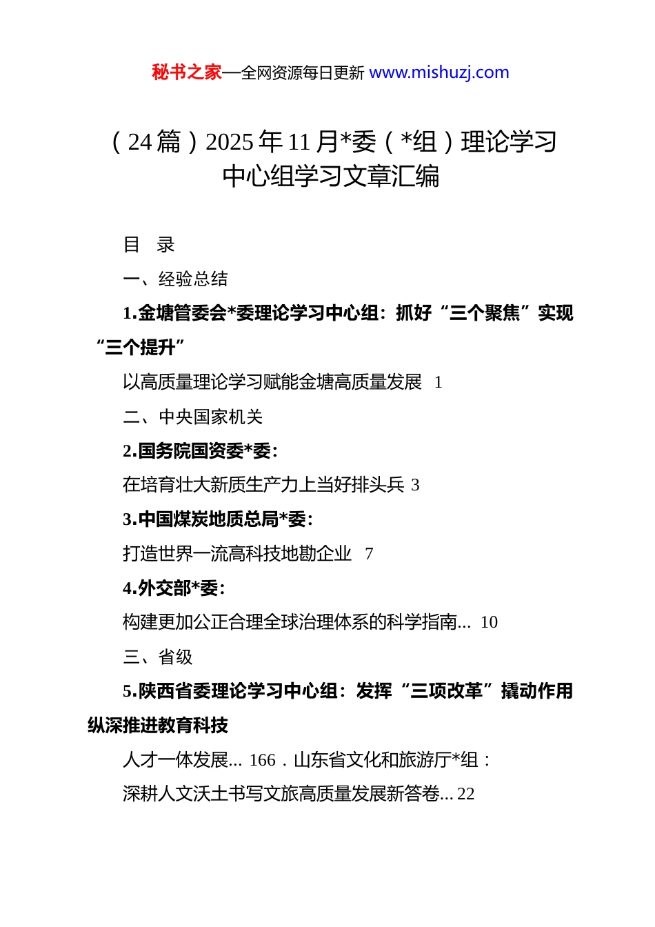 秘书之家—全网资源每日更新 www.mishuzj.com(24 篇)2025 年 11 月*委(*组)理论学习中心组学习文章汇编目录一、经验总结1.金塘管委会*委理论学习中心组:抓好“三个聚焦”实现“三个提升”以高质量理论学习赋能金塘高质量发展 1二、中央国家机关2.国务院国资委*委:在培育壮大新质生产力上当好排头兵 33.中国煤炭地质总局*委:打造世界一流高科技地勘企业 74.外交部*委:构建更加公正合理全球治理体系的科学指南… 10三、省级5.陕西省委理论学习中心组:发挥“三项改革”撬动作用纵深推进教育科技人才一体发展… 166.山东省文化和旅游厅*组:深耕人文沃土书写文旅高质量发展新答卷… 22秘书之家—全网资源每日更新 www.mishuzj.com7.西藏自治区*委*校(行政学院)校(院)委会理论学习中心组:深入学习宣传贯彻*的二十届四中全会精神奋力谱写中国式现代化西藏新篇章…268.辽宁省文化和旅游厅*组:推进文旅体商高质量融合发展在繁荣文化中打造新的经济增长点…319.中共新疆维吾尔自治区委员会:在新的起点上建设社会主义现代化新疆…34四、市级10.金华市新闻传媒中心*委理论学习中心组:深学细悟聚合力勇担使命谱新篇奋力开创金华新闻传媒事业高质量发展新局面…4011.中共舟山市委*校校(院)委会理论学习中心组:坚守初心扛起使命以高质量*校工作服务中国式现代化舟山实践 4312.舟山市港航和口岸管理局*委理论学习中心组:牢记嘱托感恩奋进加快推进世界一流强港建设 4613.湖州市综合行政执法局*组理论学习中心组:秘书之家—全网资源每日更新 www.mishuzj.com全面提升涉企行政执法质效助力打造企业最有感的法治化营商环境……4914.舟山市自然资源和规划局*委理论学习中心组:深化资源改革,助力擘画海洋经济发展新图景 5115.湖州市民政局*委理论学习中心组:学思践悟,谱写“在湖州感受暖心民政”新篇章…5416.湖州市政协机关*组理论学习中心组:抓住“两山”理念提出 20 周年重大契机为生态文明建设做好“四个凝聚”57五、县级17.普陀山-朱家尖管委会*委理论学习中心组:把握发展机遇努力开创新局面推动普朱功能区高质量发展行稳致远 5918 . 务 川 自 治县委理论学习中心组:坚持以铸牢中华民族共同体意识为主线全力推动务川文旅融合发展……61六、高校19.金华职业技术大学*委理论学习中心组:以产教融合新生态赋能职业本科高质量发展… 6520.金华开放大学*委理论学习中心组:秘书之家—全网资源每日更新 www.mishuzj.com打造全域泛在可及终身教育主平台筑强内陆开放枢纽城市人才硬支撑…68七、企业21.湖州银行*委理论学习中心组:深化“五联五融”推进*业融合 7122.湖州市城市集团*委理论学习中心组:润企无声惠民有形打造文明实践新样本 7523.中国煤炭科工*委:实施“六位一体”dj 提升工程引领保障企业高质量发展…7724.中国能建*委:文化建设为企业高质量发展注入精神动力80抓好“三个聚焦”实现“三个提升”以高质量理论学习赋能金塘高质量发展金塘管委会*委理论学习中心组(2025 年 11 月 11 日)金塘作为全市建设现代海洋城市的重要阵地,近年来,金塘管委会*委充分发挥中心组理论学习在推进经济社会发展中的先导引领作用,突出政治主题、深化思想认识、压实工作责任,抓好“三个聚焦”、实现“三个提升”,不断推动理论学习提秘书之家—全网资源每日更新 www.mishuzj.com质增效,为金塘高质量发展增添动能。聚焦关键少数,在示范领学上持续提升。坚持从政治高度抓理论学习,把学习贯彻**************思想作为首要政治任务和贯穿始终的主题主线,紧扣上级*委学习重点,紧密结合自身实际,严谨制定年度学习计划,把******重要讲话****批示精神作为必学内容,做到立场正确、方向不偏。坚持先学一步、学深一层、多悟一分,充分发挥“关键少数”示范引领作用,丰富学习内容,创新学习方式,促进学习转化,做到学习跟进、认识跟进、行动跟进。坚持开门学习,以深入贯彻中央八项规定精神学习教育为契机,把调查研究与学习教育、检视问题、整改落实紧密结合,推动解决实际问题。2025 年以来,金塘管委会*委理论学习中心组围绕***关于*...