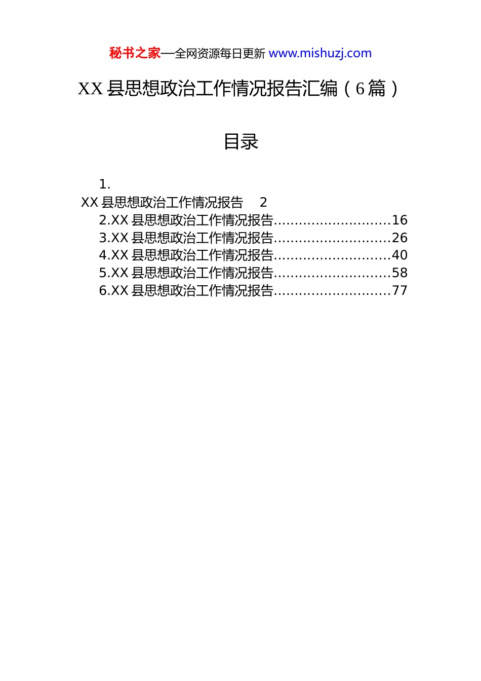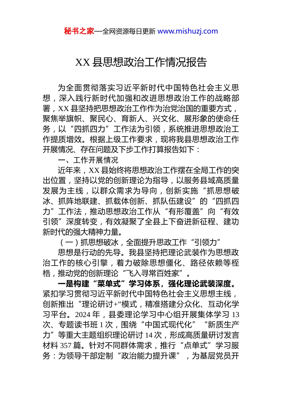 秘书之家—全网资源每日更新 www.mishuzj.comXX 县思想政治工作情况报告汇编(6 篇)目录1.XX 县思想政治工作情况报告22.XX 县思想政治工作情况报告............................163.XX 县思想政治工作情况报告............................264.XX 县思想政治工作情况报告............................405.XX 县思想政治工作情况报告............................586.XX 县思想政治工作情况报告............................77秘书之家—全网资源每日更新 www.mishuzj.comXX 县思想政治工作情况报告为全面贯彻落实习近平新时代中国特色社会主义思想,深入践行新时代加强和改进思想政治工作的战略部署,XX 县坚持把思想政治工作作为治党治国的重要方式,聚焦举旗帜、聚民心、育新人、兴文化、展形象的使命任务,以“四抓四力”工作法为引领,系统推进思想政治工作提质增效。根据上级工作要求,现将我县思想政治工作开展情况、存在问题及下步工作打算报告如下:一、工作开展情况近年来,XX 县始终将思想政治工作摆在全局工作的突出位置,坚持以党的创新理论为指导,以服务县域高质量发展为主线,以群众需求为导向,创新实施“抓思想破冰、抓阵地联建、抓载体创新、抓队伍建设”的“四抓四力”工作法,推动思想政治工作从“有形覆盖”向“有效引领”深度转变,有效凝聚了全县上下奋进新征程、建功新时代的强大精神力量。(一)抓思想破冰,全面提升思政工作“引领力”思想是行动的先导。我县坚持把理论武装作为思想政治工作的核心引擎,着力破除思想僵化、路径依赖等桎梏,推动党的创新理论“飞入寻常百姓家”。一是构建“菜单式”学习体系,强化理论武装深度。紧扣学习贯彻习近平新时代中国特色社会主义思想主线,创新推出“理论研讨+”模式,精准搭建分众化、互动化学习平台。2024 年,县委理论学习中心组开展集体学习 13次、专题读书班 1 次,围绕“中国式现代化”“新质生产力”等重大主题组织理论研讨 14 次,形成高质量研讨发言材料 357 篇。针对不同群体需求,推行“点单式”学习服务:为领导干部定制“政治能力提升课”,为基层党员开秘书之家—全网资源每日更新 www.mishuzj.com设“乡村振兴实践课”,为青年群体打造“青春建功微课堂”,确保理论学习精准滴灌、入脑入心。通过“关键少数”示范引领,带动全县党员干部筑牢信仰之基、补足精神之钙。二是打造全媒体传播矩阵,拓展理论覆盖广度。深度整合“声、屏、网、微、端”资源,构建“1+N”融媒体传播体系。依托“箐山融媒”县级平台,开设“理论云课堂”“聚焦两会”“箐山讲坛”等专题专栏,全年推送中央及省市县委决策部署、学习资料和动态资讯 212 期,阅读量超 15 万次。创新“互联网+宣讲”模式,以党的二十届三中全会精神、生态文明建设等为主题,开展集中宣讲 73场、网络直播宣讲 31 场,线上线下覆盖干部群众 7200 余人次。特别在“箐山融媒”APP 嵌入“理论随身听”功能,将政策解读转化为 3 分钟音频微课,方便群众利用碎片化时间学习,有效破解了基层理论传播“最后一公里”难题。三是培育特色宣讲品牌,增强理论阐释温度。构建“1+X”宣讲品牌矩阵,县委书记领衔组建县委宣讲团,开展党的二十届三中全会精神专题报告会 3 场,以“小切口”讲透“大道理”。同步激活群众性宣讲力量,打造“五老”银发宣讲团、“红领巾”少年宣讲队、“文明实践”先锋队等特色小分队 12 支,深入机关、企业、社区、农村、学校开展“炕头宣讲”“田间课堂”46 场次。如在带岭镇开展的“抗联故事会”,老党员用亲身经历讲述革命历史,让群众在泪光中感悟信仰力量;在实验小学组织的“红领巾说两会”,孩子们用童言童语解读国家政策,使理论宣传更具亲和力。全年宣讲受众超千人次,真正实现“理论宣讲”化为“思想旋桨”,推动党的声音“沉下去”、群众心声“浮上来”。(二)抓阵地联建,系统重塑思政工作“吸引力”阵地是思想政治工作的基础依托。我县坚持“小阵地大舞台”理念,通过资源整合、功能升级、品牌打造,将秘书之家—全网资源每日更新 www.mishuzj.com分散的文化场所转化为...