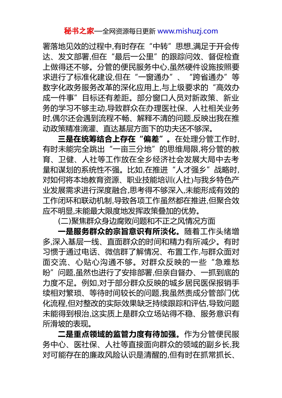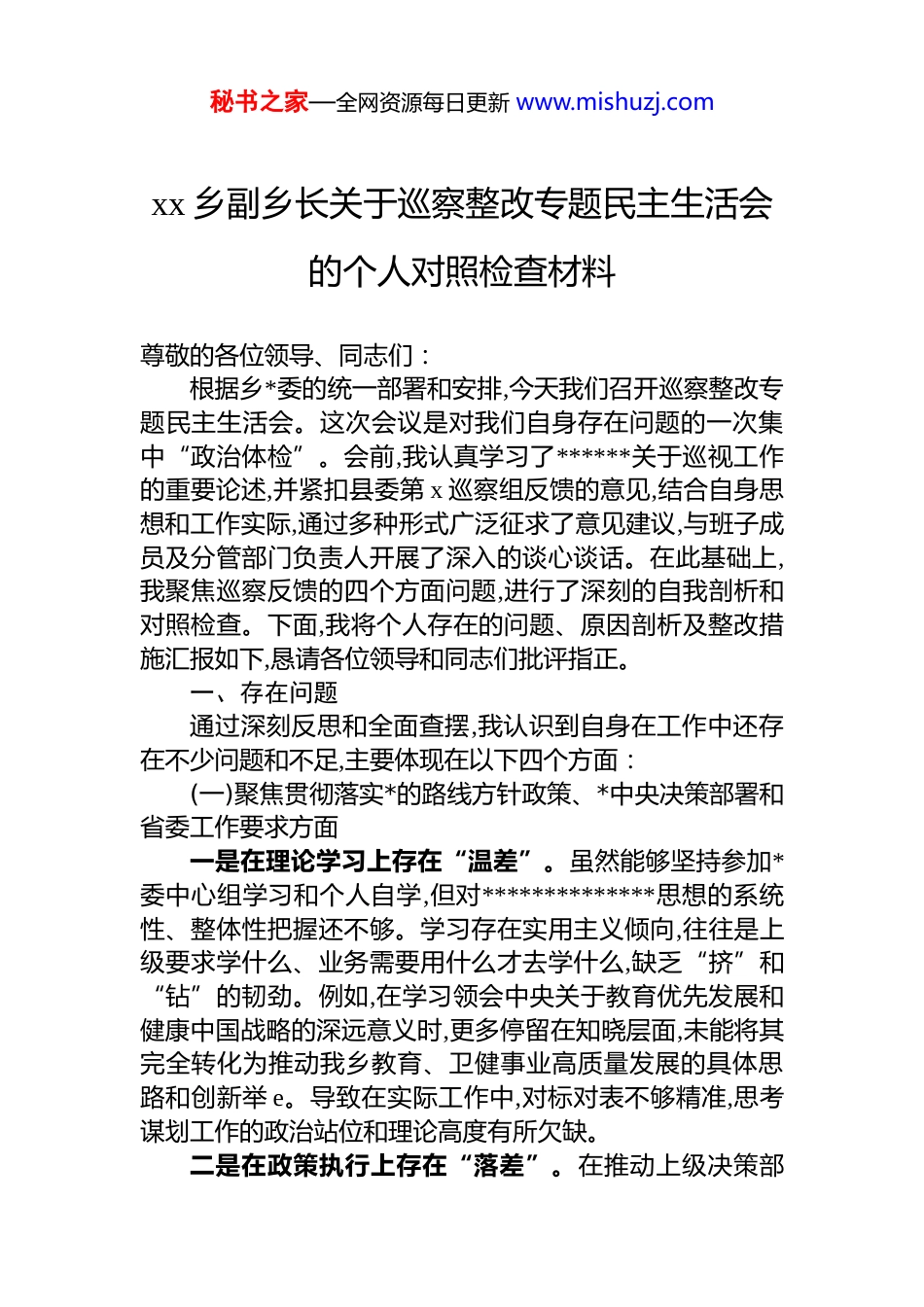 秘书之家—全网资源每日更新 www.mishuzj.comxx 乡副乡长关于巡察整改专题民主生活会的个人对照检查材料尊敬的各位领导、同志们:根据乡*委的统一部署和安排,今天我们召开巡察整改专题民主生活会。这次会议是对我们自身存在问题的一次集中“政治体检”。会前,我认真学习了******关于巡视工作的重要论述,并紧扣县委第 x 巡察组反馈的意见,结合自身思想和工作实际,通过多种形式广泛征求了意见建议,与班子成员及分管部门负责人开展了深入的谈心谈话。在此基础上,我聚焦巡察反馈的四个方面问题,进行了深刻的自我剖析和对照检查。下面,我将个人存在的问题、原因剖析及整改措施汇报如下,恳请各位领导和同志们批评指正。一、存在问题通过深刻反思和全面查摆,我认识到自身在工作中还存在不少问题和不足,主要体现在以下四个方面:(一)聚焦贯彻落实*的路线方针政策、*中央决策部署和省委工作要求方面一是在理论学习上存在“温差”。虽然能够坚持参加*委中心组学习和个人自学,但对**************思想的系统性、整体性把握还不够。学习存在实用主义倾向,往往是上级要求学什么、业务需要用什么才去学什么,缺乏“挤”和“钻”的韧劲。例如,在学习领会中央关于教育优先发展和健康中国战略的深远意义时,更多停留在知晓层面,未能将其完全转化为推动我乡教育、卫健事业高质量发展的具体思路和创新举 e。导致在实际工作中,对标对表不够精准,思考谋划工作的政治站位和理论高度有所欠缺。二是在政策执行上存在“落差”。在推动上级决策部秘书之家—全网资源每日更新 www.mishuzj.com署落地见效的过程中,有时存在“中转”思想,满足于开会传达、发文部署,但在“最后一公里”的跟踪问效、督促检查上做得还不够。分管的便民服务中心,虽然硬件设施按照要求进行了标准化建设,但在“一窗通办”、“跨省通办”等数字化政务服务改革的深化应用上,与上级要求的“高效办成一件事”目标还有差距。部分窗口人员对新政策、新业务的学习不够主动,导致群众在办理医社保、人社相关业务时,偶尔还会遇到流程不畅、解释不清的问题,反映出我在推动政策精准滴灌、直达基层方面下的功夫还不够深。三是在统筹结合上存在“偏差”。在处理分管工作时,有时未能完全跳出“一亩三分地”的思维局限,将分管的教育、卫健、人社等工作放在全乡经济社会发展大局中去考量和谋划的系统性不强。比如,在推进“人才强乡”战略时,对如何将本地教育资源、职业技能培训(人社)与我乡特色产业发展需求进行深度融合,思考得不够深入,未能形成有效的工作闭环和联动机制,导致各项工作虽然都在推进,但聚合效应不明显,未能最大限度地发挥政策叠加的优势。(二)聚焦群众身边腐败问题和不正之风情况方面一是服务群众的宗旨意识有所淡化。随着工作头绪增多,深入基层一线、直面群众的时间和精力有所减少。有时习惯于通过电话、微信群了解情况、布置工作,与群众面对面交流、心贴心沟通不够。对群众反映的一些“急难愁盼”问题,虽然也进行了安排部署,但亲自督办、一抓到底的力度不足。例如,对于部分群众反映的城乡居民医保报销手续相对繁琐、等待时间较长的问题,我虽然责成分管部门优化流程,但对整改的实际效果缺乏持续跟踪和评估,导致问题未能得到根治,这实质上是群众立场站得不稳、服务意识有所滑坡的表现。二是重点领域的监管力度有待加强。作为分管便民服务中心、医社保、人社等直接面向群众的领域的副乡长,我对可能存在的廉政风险认识是清醒的,但有时在抓常抓长、秘书之家—全网资源每日更新 www.mishuzj.com防微杜渐方面还存在薄弱环节。对便民服务中心窗口工作人员的日常工作纪律、服务态度等监督检查不够频繁,存在“信任代替监督”的情况。在对困难群众救助、就业补助等惠民资金的发放和使用监管上,更多依赖于分管部门的自查和报告,主动深入核查的力度不够,对可能存在的“微腐败”和不正之风,警惕性还需进一步提高。三是纠治形式主义、官僚主义不够彻底。在工作中,有时还存在以文件落实文件、以会议落实会议的现象。比如,在安排部署安全生产、疫情防控等工作时,下发的文件和方案不少,但对各村、各单位是否真正结合实际、创造性地开展工作,督导和检查...