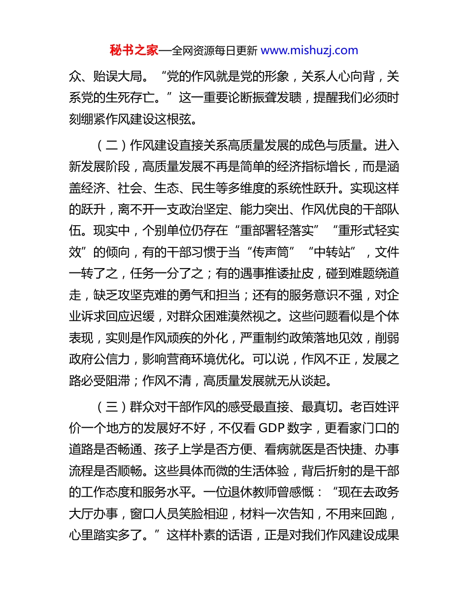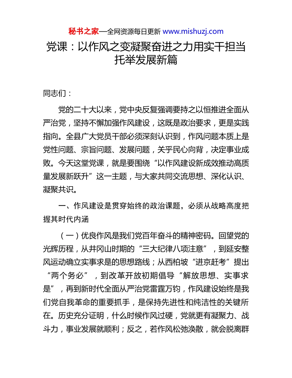 秘书之家—全网资源每日更新 www.mishuzj.com党课:以作风之变凝聚奋进之力用实干担当托举发展新篇同志们:党的二十大以来,党中央反复强调要持之以恒推进全面从严治党,坚持不懈加强作风建设,这既是政治要求,更是实践指向。全县广大党员干部必须深刻认识到,作风问题本质上是党性问题、宗旨问题、发展问题,关乎民心向背,决定事业成败。今天这堂党课,就是要围绕“以作风建设新成效推动高质量发展新跃升”这一主题,与大家共同交流思想、深化认识、凝聚共识。一、作风建设是贯穿始终的政治课题,必须从战略高度把握其时代内涵(一)优良作风是我们党百年奋斗的精神密码。回望党的光辉历程,从井冈山时期的“三大纪律八项注意”,到延安整风运动确立实事求是的思想路线;从西柏坡“进京赶考”提出“两个务必”,到改革开放初期倡导“解放思想、实事求是”,再到新时代全面从严治党雷霆万钧,作风建设始终是我们党自我革命的重要抓手,是保持先进性和纯洁性的关键所在。历史充分证明,什么时候作风过硬,党就更有凝聚力、战斗力,事业发展就顺利;反之,若作风松弛涣散,就会脱离群秘书之家—全网资源每日更新 www.mishuzj.com众、贻误大局。“党的作风就是党的形象,关系人心向背,关系党的生死存亡。”这一重要论断振聋发聩,提醒我们必须时刻绷紧作风建设这根弦。(二)作风建设直接关系高质量发展的成色与质量。进入新发展阶段,高质量发展不再是简单的经济指标增长,而是涵盖经济、社会、生态、民生等多维度的系统性跃升。实现这样的跃升,离不开一支政治坚定、能力突出、作风优良的干部队伍。现实中,个别单位仍存在“重部署轻落实”“重形式轻实效”的倾向,有的干部习惯于当“传声筒”“中转站”,文件一转了之,任务一分了之;有的遇事推诿扯皮,碰到难题绕道走,缺乏攻坚克难的勇气和担当;还有的服务意识不强,对企业诉求回应迟缓,对群众困难漠然视之。这些问题看似是个体表现,实则是作风顽疾的外化,严重制约政策落地见效,削弱政府公信力,影响营商环境优化。可以说,作风不正,发展之路必受阻滞;作风不清,高质量发展就无从谈起。(三)群众对干部作风的感受最直接、最真切。老百姓评价一个地方的发展好不好,不仅看 GDP 数字,更看家门口的道路是否畅通、孩子上学是否方便、看病就医是否快捷、办事流程是否顺畅。这些具体而微的生活体验,背后折射的是干部的工作态度和服务水平。一位退休教师曾感慨:“现在去政务大厅办事,窗口人员笑脸相迎,材料一次告知,不用来回跑,心里踏实多了。”这样朴素的话语,正是对我们作风建设成果秘书之家—全网资源每日更新 www.mishuzj.com最真实的肯定。相反,如果群众反映的问题长期得不到回应,合理诉求被敷衍塞责,哪怕经济发展再快,也难以赢得真心拥护。因此,作风建设不是抽象概念,而是体现在每一次接待来访、每一份审批办理、每一项惠民政策落实之中,它连接着党心与民心,承载着信任与期待。二、对标新形势新要求,准确识别当前作风建设中的突出问题(一)思想层面仍需进一步破除惯性思维。一是存在“路径依赖”现象。部分干部习惯于按老办法办事,面对新形势新任务缺乏创新意识,在工作中满足于“过得去”,不愿动脑筋想办法,导致一些改革举措停留在纸面,未能转化为实际成效。二是存在“本位主义”倾向。有的部门只顾自己“一亩三分地”,协调配合意识不强,跨领域、跨层级事项推进缓慢,形成“中梗阻”。三是存在“畏难情绪”。面对复杂矛盾和历史遗留问题,个别干部怕担责任、怕惹麻烦,宁可“不干事”也不愿“干错事”,缺乏应有的斗争精神和担当魄力。(二)工作落实中仍有“虚浮空”现象。一是调研不够深入。有的干部下基层走马观花,坐在车上转、隔着玻璃看,听汇报多、问群众少,掌握情况不全面,制定政策脱离实际。某乡镇在推进农村改厕过程中,未充分征求村民意见,统一安装型号不符合使用习惯,结果建成后闲置率高,造成资源浪费。秘书之家—全网资源每日更新 www.mishuzj.com二是执行打折扣。上级决策部署到了基层出现“层层衰减”,有的选择性落实、象征性推进,甚至搞“上有政策、下有对策...