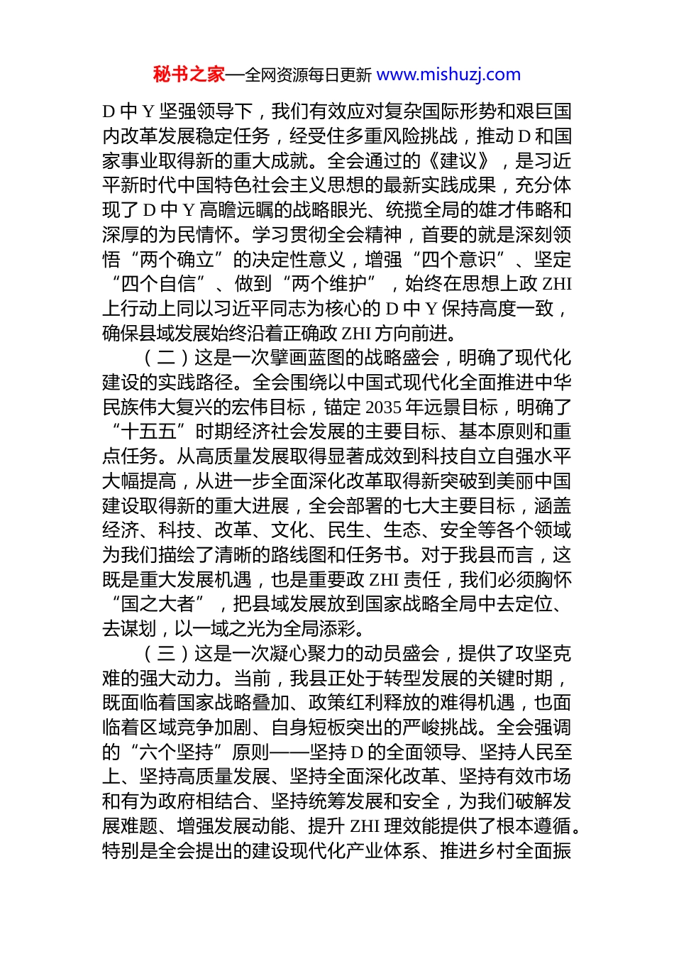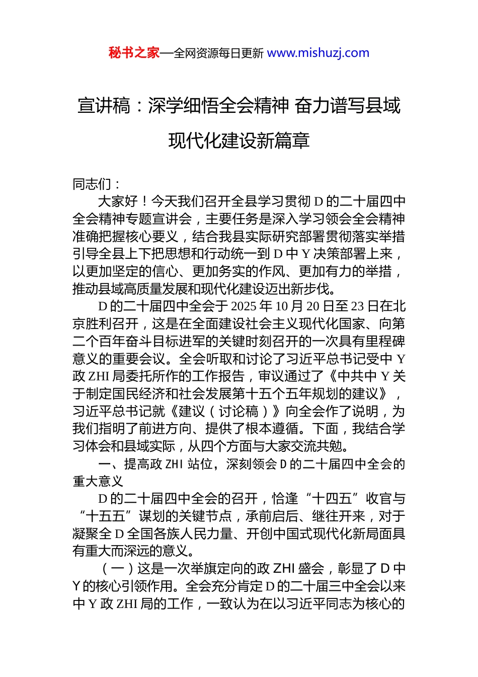 秘书之家—全网资源每日更新 www.mishuzj.com宣讲稿:深学细悟全会精神 奋力谱写县域现代化建设新篇章同志们:大家好!今天我们召开全县学习贯彻 D 的二十届四中全会精神专题宣讲会,主要任务是深入学习领会全会精神准确把握核心要义,结合我县实际研究部署贯彻落实举措引导全县上下把思想和行动统一到 D 中 Y 决策部署上来,以更加坚定的信心、更加务实的作风、更加有力的举措,推动县域高质量发展和现代化建设迈出新步伐。D 的二十届四中全会于 2025 年 10 月 20 日至 23 日在北京胜利召开,这是在全面建设社会主义现代化国家、向第二个百年奋斗目标进军的关键时刻召开的一次具有里程碑意义的重要会议。全会听取和讨论了习近平总书记受中 Y政 ZHI 局委托所作的工作报告,审议通过了《中共中 Y 关于制定国民经济和社会发展第十五个五年规划的建议》,习近平总书记就《建议(讨论稿)》向全会作了说明,为我们指明了前进方向、提供了根本遵循。下面,我结合学习体会和县域实际,从四个方面与大家交流共勉。一、提高政 ZHI 站位,深刻领会 D 的二十届四中全会的重大意义D 的二十届四中全会的召开,恰逢“十四五”收官与“十五五”谋划的关键节点,承前启后、继往开来,对于凝聚全 D 全国各族人民力量、开创中国式现代化新局面具有重大而深远的意义。(一)这是一次举旗定向的政 ZHI 盛会,彰显了 D 中Y 的核心引领作用。全会充分肯定 D 的二十届三中全会以来中 Y 政 ZHI 局的工作,一致认为在以习近平同志为核心的秘书之家—全网资源每日更新 www.mishuzj.comD 中 Y 坚强领导下,我们有效应对复杂国际形势和艰巨国内改革发展稳定任务,经受住多重风险挑战,推动 D 和国家事业取得新的重大成就。全会通过的《建议》,是习近平新时代中国特色社会主义思想的最新实践成果,充分体现了 D 中 Y 高瞻远瞩的战略眼光、统揽全局的雄才伟略和深厚的为民情怀。学习贯彻全会精神,首要的就是深刻领悟“两个确立”的决定性意义,增强“四个意识”、坚定“四个自信”、做到“两个维护”,始终在思想上政 ZHI上行动上同以习近平同志为核心的 D 中 Y 保持高度一致,确保县域发展始终沿着正确政 ZHI 方向前进。(二)这是一次擘画蓝图的战略盛会,明确了现代化建设的实践路径。全会围绕以中国式现代化全面推进中华民族伟大复兴的宏伟目标,锚定 2035 年远景目标,明确了“十五五”时期经济社会发展的主要目标、基本原则和重点任务。从高质量发展取得显著成效到科技自立自强水平大幅提高,从进一步全面深化改革取得新突破到美丽中国建设取得新的重大进展,全会部署的七大主要目标,涵盖经济、科技、改革、文化、民生、生态、安全等各个领域为我们描绘了清晰的路线图和任务书。对于我县而言,这既是重大发展机遇,也是重要政 ZHI 责任,我们必须胸怀“国之大者”,把县域发展放到国家战略全局中去定位、去谋划,以一域之光为全局添彩。(三)这是一次凝心聚力的动员盛会,提供了攻坚克难的强大动力。当前,我县正处于转型发展的关键时期,既面临着国家战略叠加、政策红利释放的难得机遇,也面临着区域竞争加剧、自身短板突出的严峻挑战。全会强调的“六个坚持”原则——坚持 D 的全面领导、坚持人民至上、坚持高质量发展、坚持全面深化改革、坚持有效市场和有为政府相结合、坚持统筹发展和安全,为我们破解发展难题、增强发展动能、提升 ZHI 理效能提供了根本遵循。特别是全会提出的建设现代化产业体系、推进乡村全面振秘书之家—全网资源每日更新 www.mishuzj.com兴、加强基层 ZHI 理、增进民生福祉等部署,与我县发展实际高度契合,为我们指明了工作着力点,必将凝聚起全县上下团结奋斗的强大合力。二、精准把握核心,深刻理解 D 的二十届四中全会精神的丰富内涵D 的二十届四中全会精神内涵丰富、博大精深,我们要原原本本学、全面系统学、联系实际学,准确把握其核心要义和实践要求,真正做到学深悟透、融会贯通。(一)准确把握“十五五”时期的重大原则,筑牢发展根基。全会深刻总结五年规划编制实施的宝贵经验,提出的...