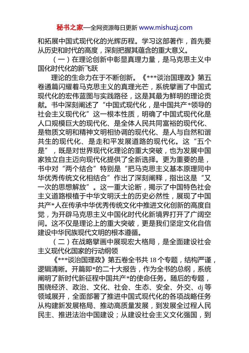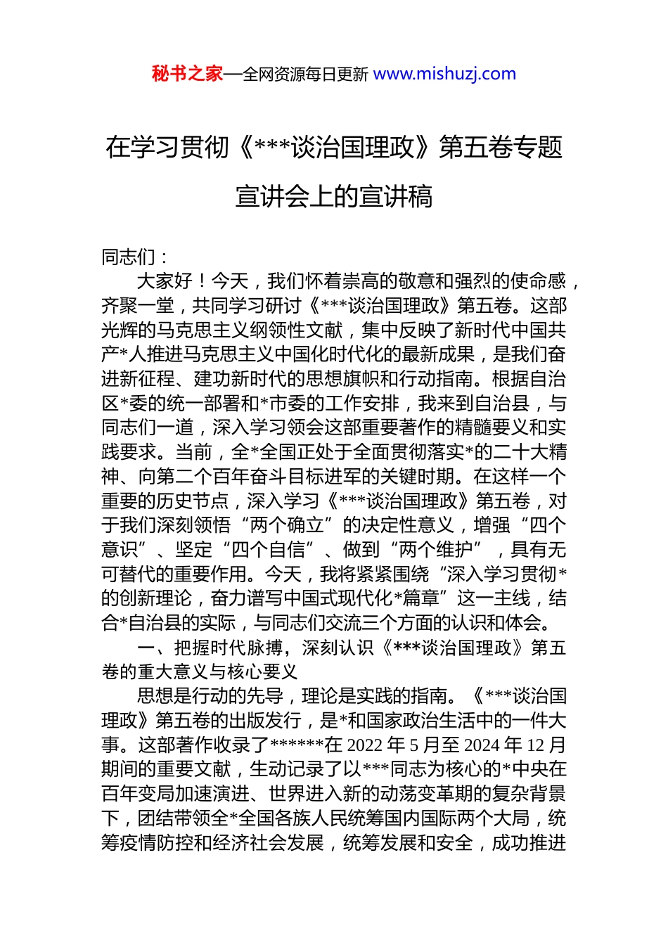 秘书之家—全网资源每日更新 www.mishuzj.com在学习贯彻《***谈治国理政》第五卷专题宣讲会上的宣讲稿同志们:大家好!今天,我们怀着崇高的敬意和强烈的使命感,齐聚一堂,共同学习研讨《***谈治国理政》第五卷。这部光辉的马克思主义纲领性文献,集中反映了新时代中国共产*人推进马克思主义中国化时代化的最新成果,是我们奋进新征程、建功新时代的思想旗帜和行动指南。根据自治区*委的统一部署和*市委的工作安排,我来到自治县,与同志们一道,深入学习领会这部重要著作的精髓要义和实践要求。当前,全*全国正处于全面贯彻落实*的二十大精神、向第二个百年奋斗目标进军的关键时期。在这样一个重要的历史节点,深入学习《***谈治国理政》第五卷,对于我们深刻领悟“两个确立”的决定性意义,增强“四个意识”、坚定“四个自信”、做到“两个维护”,具有无可替代的重要作用。今天,我将紧紧围绕“深入学习贯彻*的创新理论,奋力谱写中国式现代化*篇章”这一主线,结合*自治县的实际,与同志们交流三个方面的认识和体会。一、把握时代脉搏,深刻认识《***谈治国理政》第五卷的重大意义与核心要义思想是行动的先导,理论是实践的指南。《***谈治国理政》第五卷的出版发行,是*和国家政治生活中的一件大事。这部著作收录了******在 2022 年 5 月至 2024 年 12 月期间的重要文献,生动记录了以***同志为核心的*中央在百年变局加速演进、世界进入新的动荡变革期的复杂背景下,团结带领全*全国各族人民统筹国内国际两个大局,统筹疫情防控和经济社会发展,统筹发展和安全,成功推进秘书之家—全网资源每日更新 www.mishuzj.com和拓展中国式现代化的光辉历程。学习这部著作,首先要从历史和时代的高度,深刻把握其蕴含的重大意义。(一)在理论创新中彰显真理力量,是马克思主义中国化时代化的新飞跃理论的生命力在于不断创新。《***谈治国理政》第五卷通篇闪耀着马克思主义的真理光芒,系统擘画了中国式现代化的宏伟蓝图与实践路径,这是其最为鲜明的理论贡献。书中深刻阐述了“中国式现代化,是中国共产*领导的社会主义现代化”这一根本性质,明确了中国式现代化是人口规模巨大的现代化、是全体人民共同富裕的现代化、是物质文明和精神文明相协调的现代化、是人与自然和谐共生的现代化、是走和平发展道路的现代化。这“五个是”,既是对世界现代化理论的重大突破,也为发展中国家独立自主迈向现代化提供了全新选择。更为重要的是,书中对“两个结合”特别是“把马克思主义基本原理同中华优秀传统文化相结合”作出了深刻阐释,指出这是“又一次的思想解放”。这一重大论断,揭示了中国特色社会主义道路根植于中华文明沃土的历史必然性,展现了中国共产*人在传承中华优秀传统文化中推进文化创新的高度自觉,为开辟马克思主义中国化时代化新境界打开了广阔空间。这不仅是理论上的重大突破,更是我们坚定文化自信建设中华民族现代文明的根本遵循。(二)在战略擘画中展现宏大格局,是全面建设社会主义现代化国家的行动纲领《***谈治国理政》第五卷全书共 18 个专题,结构严谨,逻辑清晰。开篇即*的二十大报告,作为全书的总纲,系统阐明了新时代新征程中国共产*的使命任务。随后的专题,围绕经济、政治、文化、社会、生态、安全、外交、dj 等领域展开,全面部署了推进中国式现代化的各项战略任务从构建新发展格局、推动高质量发展,到发展全过程人民民主、推进法治中国建设;从建设社会主义文化强国,到秘书之家—全网资源每日更新 www.mishuzj.com增进民生福祉、提高人民生活品质;从推动绿色发展、促进人与自然和谐共生,到坚定不移贯彻总体国家安全观;再到开创中国特色大国外交新局面,直至最后强调“把*的自我革命进行到底”这一系列战略部署,构成了相互联系相互促进的有机整体。它清晰地回答了“建设什么样的社会主义现代化强国、怎样建设社会主义现代化强国”这一时代课题,为我们各项工作提供了精准的“路线图”和“施工图”。(三)在风险应对中彰显斗争精神,是应对各种风险挑战的制胜法宝当今世界,百年未有之大变局加速演进,我国发展进入战略机遇和风险挑战并...