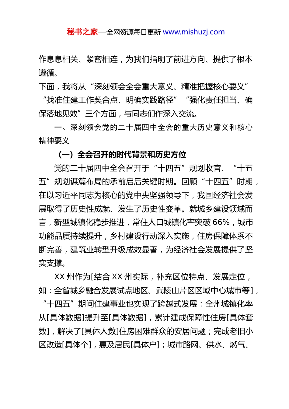 秘书之家—全网资源每日更新 www.mishuzj.com深学笃行党的二十届四中全会精神奋力谱写 XX 州住建事业高质量发展新篇章——XX 州住建局局长专题宣讲稿同志们:大家好!今天,我们召开全局系统专题宣讲会,核心任务是深入学习、全面解读党的二十届四中全会精神,精准把握全会对城乡建设工作提出的新部署、新要求,推动全局干部职工进一步统一思想、凝聚共识、激发干劲,把学习成果转化为推动 XX 州住建事业高质量发展的实际行动,为全州“十四五”规划圆满收官、“十五五”规划谋篇布局筑牢住建根基。党的二十届四中全会是在我国全面建设社会主义现代化国家新征程的关键节点召开的一次十分重要的会议。全会审议通过的《中共中央关于制定国民经济和社会发展第十五个五年规划的建议》(以下简称《建议》),立足“两个一百年”奋斗目标的历史交汇点,深刻分析了新时代新征程我国发展面临的国际国内形势,明确了未来五年经济社会发展的指导思想、主要目标、重点任务和重大举措,是指导我们今后一个时期各项工作的纲领性文件。特别是全会将“推动房地产高质量发展”“加快农业农村现代化”“建设创新、宜居、美丽、韧性、文明、智慧的现代化人民城市”等内容纳入战略部署,与住建工秘书之家—全网资源每日更新 www.mishuzj.com作息息相关、紧密相连,为我们指明了前进方向、提供了根本遵循。下面,我将从“深刻领会全会重大意义、精准把握核心要义”“找准住建工作契合点、明确实践路径”“强化责任担当、确保落地见效”三个方面,与同志们作深入交流。一、深刻领会党的二十届四中全会的重大历史意义和核心精神要义(一)全会召开的时代背景和历史方位党的二十届四中全会召开于“十四五”规划收官、“十五五”规划谋篇布局的承前启后关键时期。回顾“十四五”时期,在以习近平同志为核心的党中央坚强领导下,我国经济社会发展取得了历史性成就、发生了历史性变革。就城乡建设领域而言,新型城镇化稳步推进,常住人口城镇化率突破 66%,城市功能品质持续提升,乡村建设行动深入实施,住房保障体系不断完善,建筑业转型升级成效显著,为经济社会发展提供了坚实支撑。XX 州作为[结合 XX 州实际,补充区位特点、发展定位,如:全省城乡融合发展试点地区、武陵山片区区域中心城市等],“十四五”期间住建事业也实现了跨越式发展:全州城镇化率从[具体数据]提升至[具体数据],累计建成保障性住房[具体套数],解决了[具体人数]住房困难群众的安居问题;完成老旧小区改造[具体个],惠及居民[具体户];城市路网、供水、燃气、秘书之家—全网资源每日更新 www.mishuzj.com污水处理等基础设施不断完善,建成区绿化覆盖率达到[具体比例];农村危房改造、人居环境整治扎实推进,[具体个数]行政村实现生活垃圾集中处理,城乡面貌发生了翻天覆地的变化。当前,我们正处在世界百年未有之大变局加速演进、我国发展进入战略机遇和风险挑战并存时期。从国际看,全球经济复苏乏力,地缘政治冲突加剧,能源资源安全、粮食安全等问题突出,对我国城乡建设的外部环境带来了诸多不确定性。从国内看,我国经济已由高速增长阶段转向高质量发展阶段,社会主要矛盾已经转化为人民日益增长的美好生活需要和不平衡不充分的发展之间的矛盾,城乡发展不平衡、区域发展不协调、城市治理精细化水平不高、房地产市场平稳运行压力较大等问题仍然存在,这些都对住建工作提出了新的更高要求。党的二十届四中全会的召开,正是在这样的时代背景下,为我们把脉定向、谋篇布局,明确了未来五年发展的“路线图”和“任务书”。全会通过的《建议》,既立足当前解决突出问题,又着眼长远谋划战略布局,既强调高质量发展的核心地位,又突出以人民为中心的发展思想,既注重顶层设计的系统性,又兼顾基层实践的可操作性,对于我们破解发展难题、应对风险挑战、推动住建事业再上新台阶,具有重大而深远的意义。(二)全会的重大政治意义、理论意义和实践意义重大政治意义:全会是一次凝聚共识、团结奋进的重要会秘书之家—全网资源每日更新 www.mishuzj.com议。全会坚定拥护“两个确立”、坚决做到“两个维护”,始终把党的领...