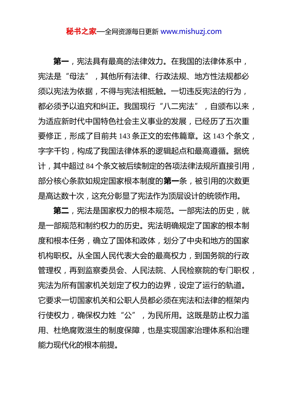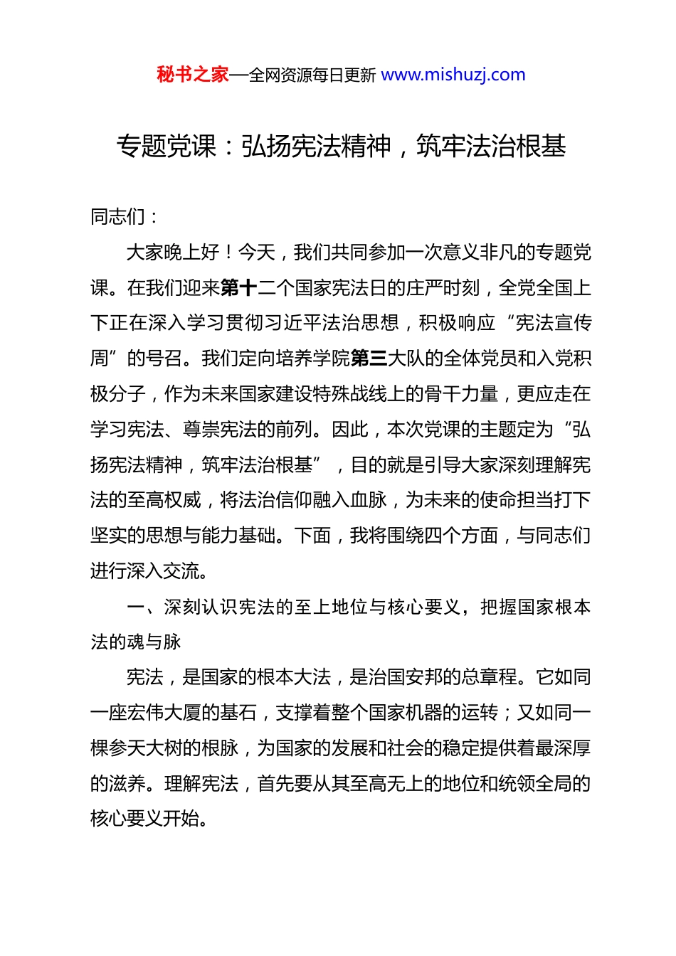 秘书之家—全网资源每日更新 www.mishuzj.com专题党课:弘扬宪法精神,筑牢法治根基 同志们:大家晚上好!今天,我们共同参加一次意义非凡的专题党课。在我们迎来第十二个国家宪法日的庄严时刻,全党全国上下正在深入学习贯彻习近平法治思想,积极响应“宪法宣传周”的号召。我们定向培养学院第三大队的全体党员和入党积极分子,作为未来国家建设特殊战线上的骨干力量,更应走在学习宪法、尊崇宪法的前列。因此,本次党课的主题定为“弘扬宪法精神,筑牢法治根基”,目的就是引导大家深刻理解宪法的至高权威,将法治信仰融入血脉,为未来的使命担当打下坚实的思想与能力基础。下面,我将围绕四个方面,与同志们进行深入交流。一、深刻认识宪法的至上地位与核心要义,把握国家根本法的魂与脉宪法,是国家的根本大法,是治国安邦的总章程。它如同一座宏伟大厦的基石,支撑着整个国家机器的运转;又如同一棵参天大树的根脉,为国家的发展和社会的稳定提供着最深厚的滋养。理解宪法,首先要从其至高无上的地位和统领全局的核心要义开始。秘书之家—全网资源每日更新 www.mishuzj.com第一,宪法具有最高的法律效力。在我国的法律体系中,宪法是“母法”,其他所有法律、行政法规、地方性法规都必须以宪法为依据,不得与宪法相抵触。一切违反宪法的行为,都必须予以追究和纠正。我国现行“八二宪法”,自颁布以来,为适应新时代中国特色社会主义事业的发展,已经历了五次重要修正,形成了目前共 143 条正文的宏伟篇章。这 143 个条文,字字千钧,构成了我国法律体系的逻辑起点和最高遵循。据统计,其中超过 84 个条文被后续制定的各项法律法规所直接引用,部分核心条款如规定国家根本制度的第一条,被引用的次数更是高达数十次,这充分彰显了宪法作为顶层设计的统领作用。第二,宪法是国家权力的根本规范。一部宪法的历史,就是一部规范和制约权力的历史。宪法明确规定了国家的根本制度和根本任务,确立了国体和政体,划分了中央和地方的国家机构职权。从全国人民代表大会的最高权力,到国务院的行政管理权,再到监察委员会、人民法院、人民检察院的专门职权,宪法为所有国家机关划定了权力的边界,设定了运行的轨道。它要求一切国家机关和公职人员都必须在宪法和法律的框架内行使权力,确保权力姓“公”,为民所用。这既是防止权力滥用、杜绝腐败滋生的制度保障,也是实现国家治理体系和治理能力现代化的根本前提。秘书之家—全网资源每日更新 www.mishuzj.com第三,宪法是公民权利的根本保障书。宪法不仅规定了国家权力的运行,更庄严宣告和保障了公民的基本权利和自由。从平等的权利,到选举权和被选举权;从言论、出版、集会、结社的自由,到人身自由、人格尊严不受侵犯;从劳动、休息、受教育的权利,到对国家机关和国家工作人员提出批评、建议、申诉、控告或者检举的权利,宪法以国家根本大法的形式,将人民当家作主的地位予以确认和巩固。当然,权利与义务是统一的。宪法在保障我们权利的同时,也规定了我们作为公民必须履行的义务,如维护国家统一和民族团结、遵守宪法和法律、依法纳税等。这种权利与义务的辩证统一,构成了现代法治社会公民身份的核心内涵。因此,对宪法的认识,绝不能停留在一部普通法律文件的层面。它是我们党治国理政的根本遵循,是国家长治久安的制度基石,是全体人民共同意志的集中体现。每一位同志,特别是我们党员同志,都必须从内心深处树立对宪法的敬畏之心,深刻理解其作为国家“定海神针”的重大意义。二、全面领会宪法精神的时代内涵与实践要求,投身法治中国建设的伟大征程进入新时代,以习近平同志为核心的党中央将全面依法治国纳入“四个全面”战略布局,以前所未有的高度和力度推进秘书之家—全网资源每日更新 www.mishuzj.com法治中国建设。在这一伟大历史进程中,弘扬宪法精神,被赋予了更加深刻的时代内涵和更加紧迫的实践要求。习近平总书记提出的“科学立法、严格执法、公正司法、全民守法”十六字方针,正是宪法精神在当代中国的生动展开和具体实践。第一,坚持“科学立法”,不断完善以宪法为核心的中国特色社会主义法律体系...