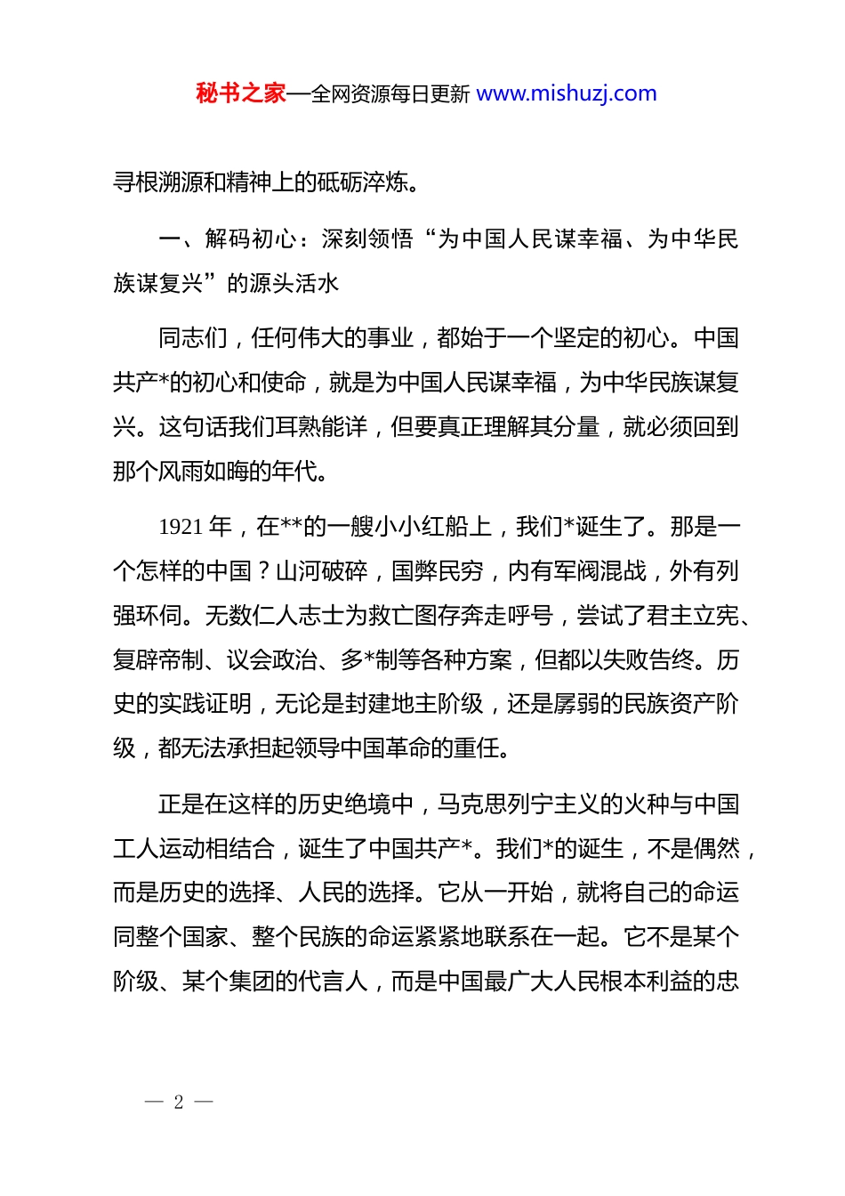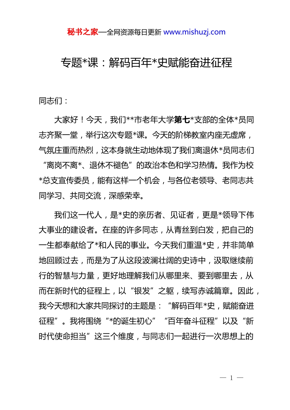 秘书之家—全网资源每日更新 www.mishuzj.com专题*课:解码百年*史赋能奋进征程同志们:大家好!今天,我们**市老年大学第七*支部的全体*员同志齐聚一堂,举行这次专题*课。今天的阶梯教室内座无虚席,气氛庄重而热烈,这本身就生动地体现了我们离退休*员同志们“离岗不离*、退休不褪色”的政治本色和学习热情。我作为校*总支宣传委员,能有这样一个机会,与各位老领导、老同志共同学习、共同交流,深感荣幸。我们这一代人,是*史的亲历者、见证者,更是*领导下伟大事业的建设者。在座的许多同志,从青丝到白发,把自己的一生都奉献给了*和人民的事业。今天我们重温*史,并非简单地回顾过去,而是为了从这段波澜壮阔的史诗中,汲取继续前行的智慧与力量,更好地理解我们从哪里来、要到哪里去,从而在新时代的征程上,以“银发”之躯,续写赤诚篇章。因此,我今天想和大家共同探讨的主题是:“解码百年*史,赋能奋进征程”。我将围绕“*的诞生初心”“百年奋斗征程”以及“新时代使命担当”这三个维度,与同志们一起进行一次思想上的— 1 —秘书之家—全网资源每日更新 www.mishuzj.com寻根溯源和精神上的砥砺淬炼。一、解码初心:深刻领悟“为中国人民谋幸福、为中华民族谋复兴”的源头活水同志们,任何伟大的事业,都始于一个坚定的初心。中国共产*的初心和使命,就是为中国人民谋幸福,为中华民族谋复兴。这句话我们耳熟能详,但要真正理解其分量,就必须回到那个风雨如晦的年代。1921 年,在**的一艘小小红船上,我们*诞生了。那是一个怎样的中国?山河破碎,国弊民穷,内有军阀混战,外有列强环伺。无数仁人志士为救亡图存奔走呼号,尝试了君主立宪、复辟帝制、议会政治、多*制等各种方案,但都以失败告终。历史的实践证明,无论是封建地主阶级,还是孱弱的民族资产阶级,都无法承担起领导中国革命的重任。正是在这样的历史绝境中,马克思列宁主义的火种与中国工人运动相结合,诞生了中国共产*。我们*的诞生,不是偶然,而是历史的选择、人民的选择。它从一开始,就将自己的命运同整个国家、整个民族的命运紧紧地联系在一起。它不是某个阶级、某个集团的代言人,而是中国最广大人民根本利益的忠— 2 —秘书之家—全网资源每日更新 www.mishuzj.com实代表。这个“初心”,决定了我们*与以往任何政治力量的根本不同。它不是为了少数人的权位与私利,而是为了亿万苍生的解放与福祉。这份初心,是具体的、鲜活的,它体现在井冈山上“三大纪律、六项注意”的秋毫无犯,体现在长征路上“半条被子”的军民鱼水情深,体现在延安窑洞里“为人民服务”的根本宗旨。我们**市是一片具有光荣革命传统的红色热土。解码初心,我们不能不回望那段发生在我们脚下这片土地上的峥嵘岁月。当年,新四军在**重建军部,无数英雄儿女在这里浴血奋战,为民奉献。他们为什么能在这里扎下根、站稳脚跟?根本原因就在于他们始终践行着*的初心使命,与人民群众血肉相连。在艰苦卓绝的抗战环境中,新四军将士们自己开荒种地,自己纺纱织布,与老百姓同甘共苦。他们严守纪律,保护群众利益,赢得了人民的衷心拥护。正是有了人民这个最坚实的靠山,新四军才能在敌人的重重“清乡”、“扫荡”中屹立不倒,并不断发展壮大。今天我们讲“铁军精神”,其时代内涵是“对*忠诚、无私奉献、敢为人先”。这份精神的根脉,就深植于这片土地上共产*人对初心的坚守。对*忠诚,就是对人民的忠诚;无私奉献,— 3 —秘书之家—全网资源每日更新 www.mishuzj.com就是为人民的利益奉献一切;敢为人先,就是为了人民的解放事业敢于斗争、敢于胜利。可以说,一部新四军在**的斗争史,就是一部共产*人践行初心使命的生动教科书。当我们今天再次解码这份初心时,感受到的不应仅仅是历史的厚重,更应该是一种融入血脉的价值认同和行动自觉。二、解码征程:系统把握“站起来、富起来、强起来”的奋斗逻辑同志们,从 1921 年到 2025 年,我们*团结带领人民走过了104 年的光辉历程。这 104 年,是一部不断战胜艰难险阻、创造人间奇迹的奋斗史。如果说“初心”是我们出发的起点,那么“征程”就是我们走向辉煌的足迹...