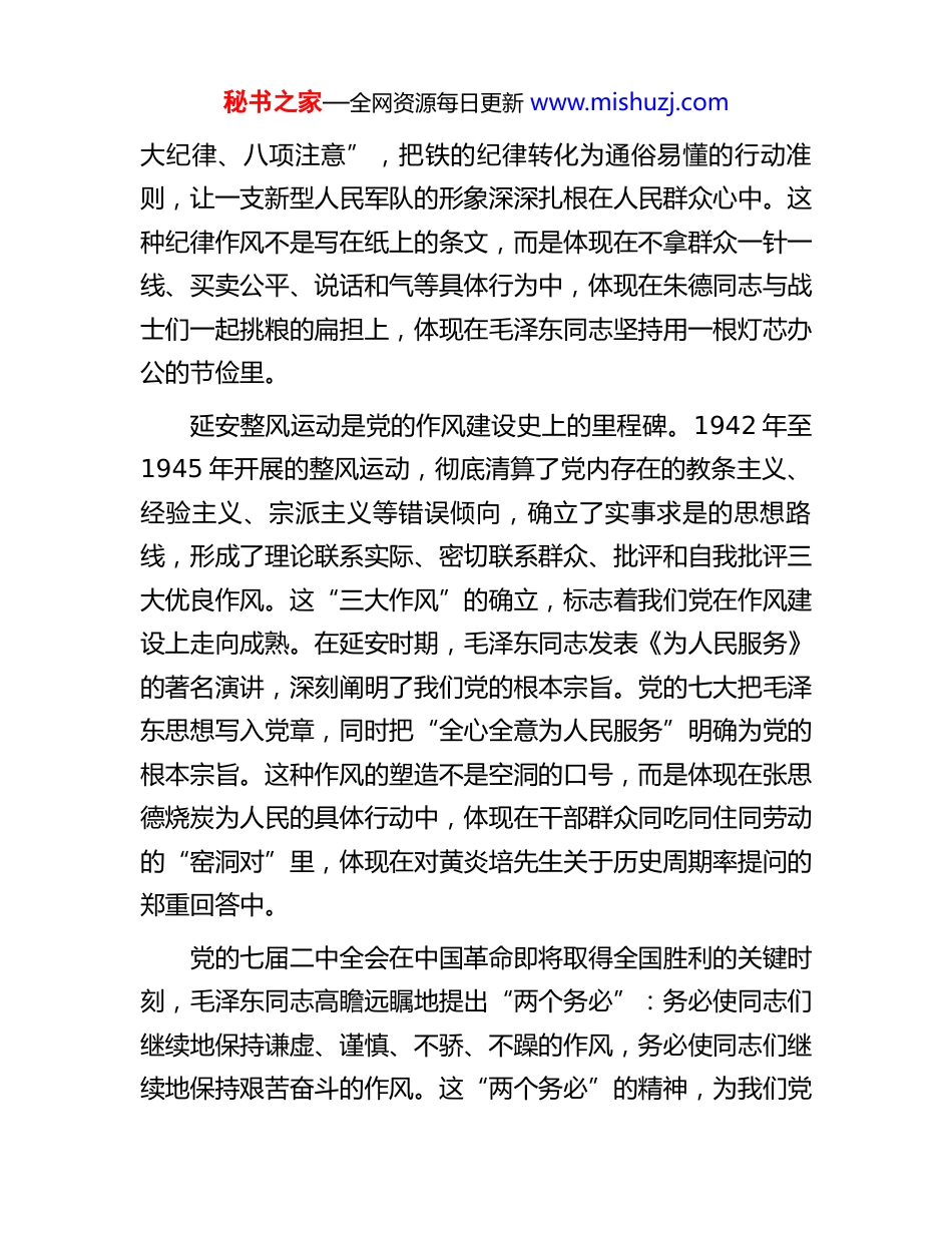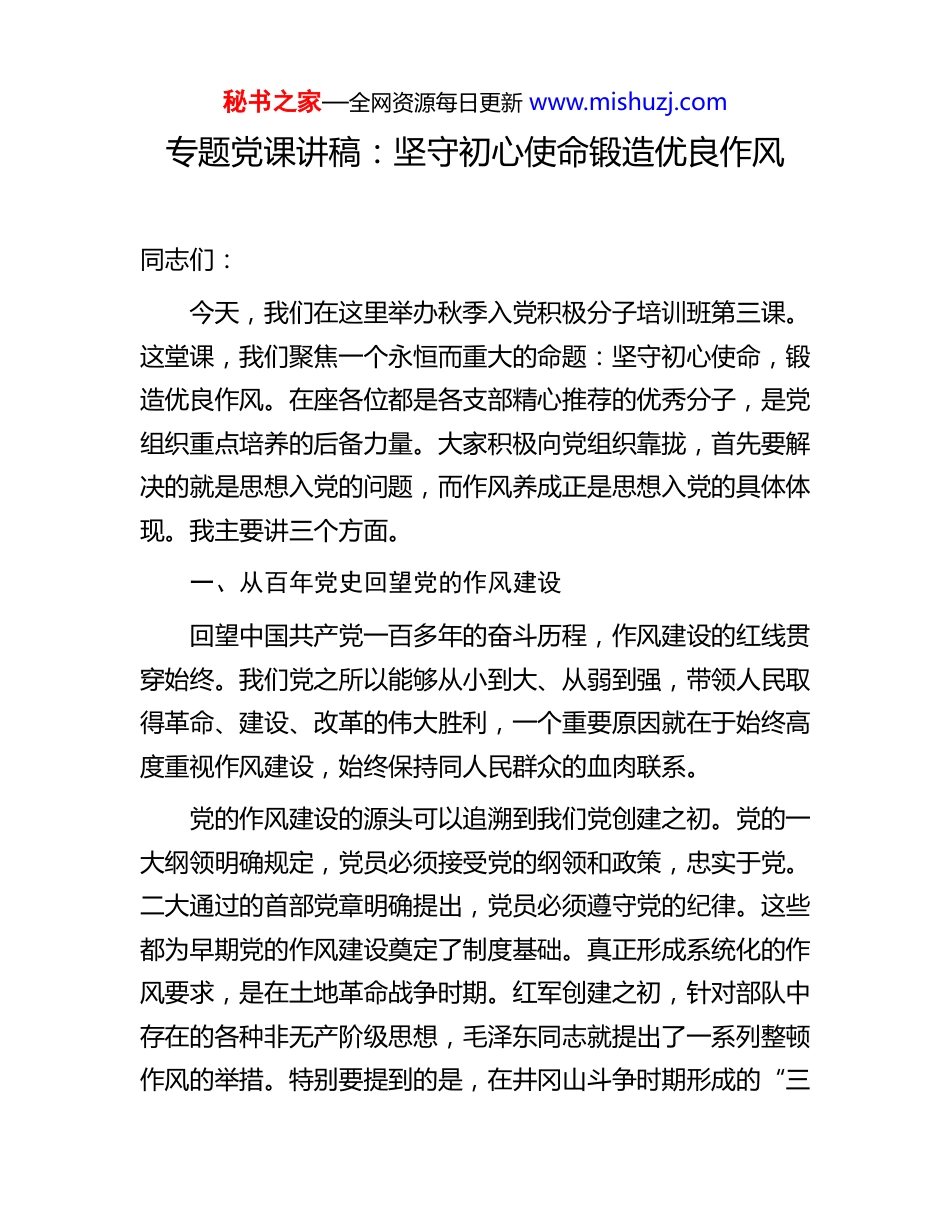 秘书之家—全网资源每日更新 www.mishuzj.com专题党课讲稿:坚守初心使命锻造优良作风同志们:今天,我们在这里举办秋季入党积极分子培训班第三课。这堂课,我们聚焦一个永恒而重大的命题:坚守初心使命,锻造优良作风。在座各位都是各支部精心推荐的优秀分子,是党组织重点培养的后备力量。大家积极向党组织靠拢,首先要解决的就是思想入党的问题,而作风养成正是思想入党的具体体现。我主要讲三个方面。一、从百年党史回望党的作风建设回望中国共产党一百多年的奋斗历程,作风建设的红线贯穿始终。我们党之所以能够从小到大、从弱到强,带领人民取得革命、建设、改革的伟大胜利,一个重要原因就在于始终高度重视作风建设,始终保持同人民群众的血肉联系。党的作风建设的源头可以追溯到我们党创建之初。党的一大纲领明确规定,党员必须接受党的纲领和政策,忠实于党。二大通过的首部党章明确提出,党员必须遵守党的纪律。这些都为早期党的作风建设奠定了制度基础。真正形成系统化的作风要求,是在土地革命战争时期。红军创建之初,针对部队中存在的各种非无产阶级思想,毛泽东同志就提出了一系列整顿作风的举措。特别要提到的是,在井冈山斗争时期形成的“三秘书之家—全网资源每日更新 www.mishuzj.com大纪律、八项注意”,把铁的纪律转化为通俗易懂的行动准则,让一支新型人民军队的形象深深扎根在人民群众心中。这种纪律作风不是写在纸上的条文,而是体现在不拿群众一针一线、买卖公平、说话和气等具体行为中,体现在朱德同志与战士们一起挑粮的扁担上,体现在毛泽东同志坚持用一根灯芯办公的节俭里。延安整风运动是党的作风建设史上的里程碑。1942 年至1945 年开展的整风运动,彻底清算了党内存在的教条主义、经验主义、宗派主义等错误倾向,确立了实事求是的思想路线,形成了理论联系实际、密切联系群众、批评和自我批评三大优良作风。这“三大作风”的确立,标志着我们党在作风建设上走向成熟。在延安时期,毛泽东同志发表《为人民服务》的著名演讲,深刻阐明了我们党的根本宗旨。党的七大把毛泽东思想写入党章,同时把“全心全意为人民服务”明确为党的根本宗旨。这种作风的塑造不是空洞的口号,而是体现在张思德烧炭为人民的具体行动中,体现在干部群众同吃同住同劳动的“窑洞对”里,体现在对黄炎培先生关于历史周期率提问的郑重回答中。党的七届二中全会在中国革命即将取得全国胜利的关键时刻,毛泽东同志高瞻远瞩地提出“两个务必”:务必使同志们继续地保持谦虚、谨慎、不骄、不躁的作风,务必使同志们继续地保持艰苦奋斗的作风。这“两个务必”的精神,为我们党秘书之家—全网资源每日更新 www.mishuzj.com在执政条件下如何拒腐防变、保持先进性提供了根本遵循。从西柏坡“进京赶考”的比喻,到新中国成立后开展的“三反”“五反”运动,再到改革开放初期关于“执政党的党风问题是有关党的生死存亡的问题”的重大论断,我们党对作风建设的认识不断深化,实践持续推进。进入新时代,以习近平同志为核心的党中央以强烈的历史担当和巨大的政治勇气,把作风建设作为全面从严治党的切入点和突破口。以钉钉子精神纠治“四风”,刹住了一些长期没有刹住的歪风,纠治了一些多年未除的顽瘴痼疾。党的二十大报告明确提出,要坚持以严的基调强化正风肃纪,持续深化纠治“四风”。这些决策部署,体现了我们党对作风建设规律性认识的深化,展现了党中央驰而不息推进作风建设的坚定决心。二、深刻认识党的作风建设重大意义作风问题绝非小事小节,而是关系党的形象、关系人心向背、关系党的生死存亡的重大政治问题。对一名入党积极分子而言,必须深刻理解作风建设的极端重要性。第一,作风问题本质是党性问题。党性是作风的内在根据,作风是党性的外在表现。党性纯洁则作风端正,党性不纯则作风不正。那些形式主义、官僚主义、享乐主义和奢靡之风,根源都在于理想信念动摇、宗旨意识淡薄。现实中,个别秘书之家—全网资源每日更新 www.mishuzj.com党员干部热衷于表面文章,文山会海、过度留痕,看似忙忙碌碌,实则脱离实际;有的对群众疾苦漠不关心,推诿扯皮、敷衍塞责,把“...