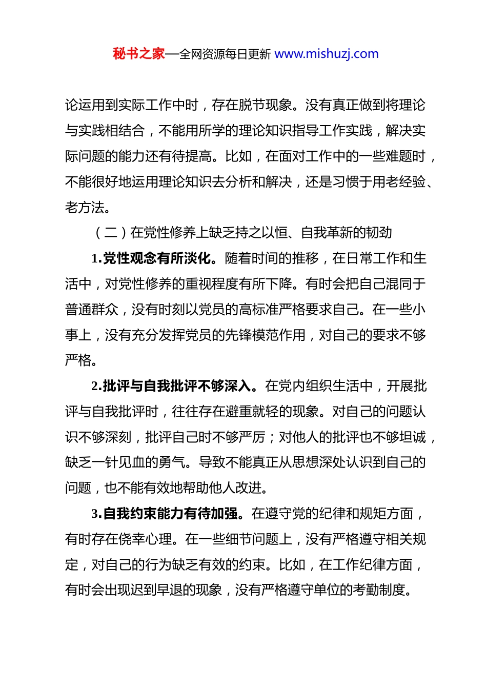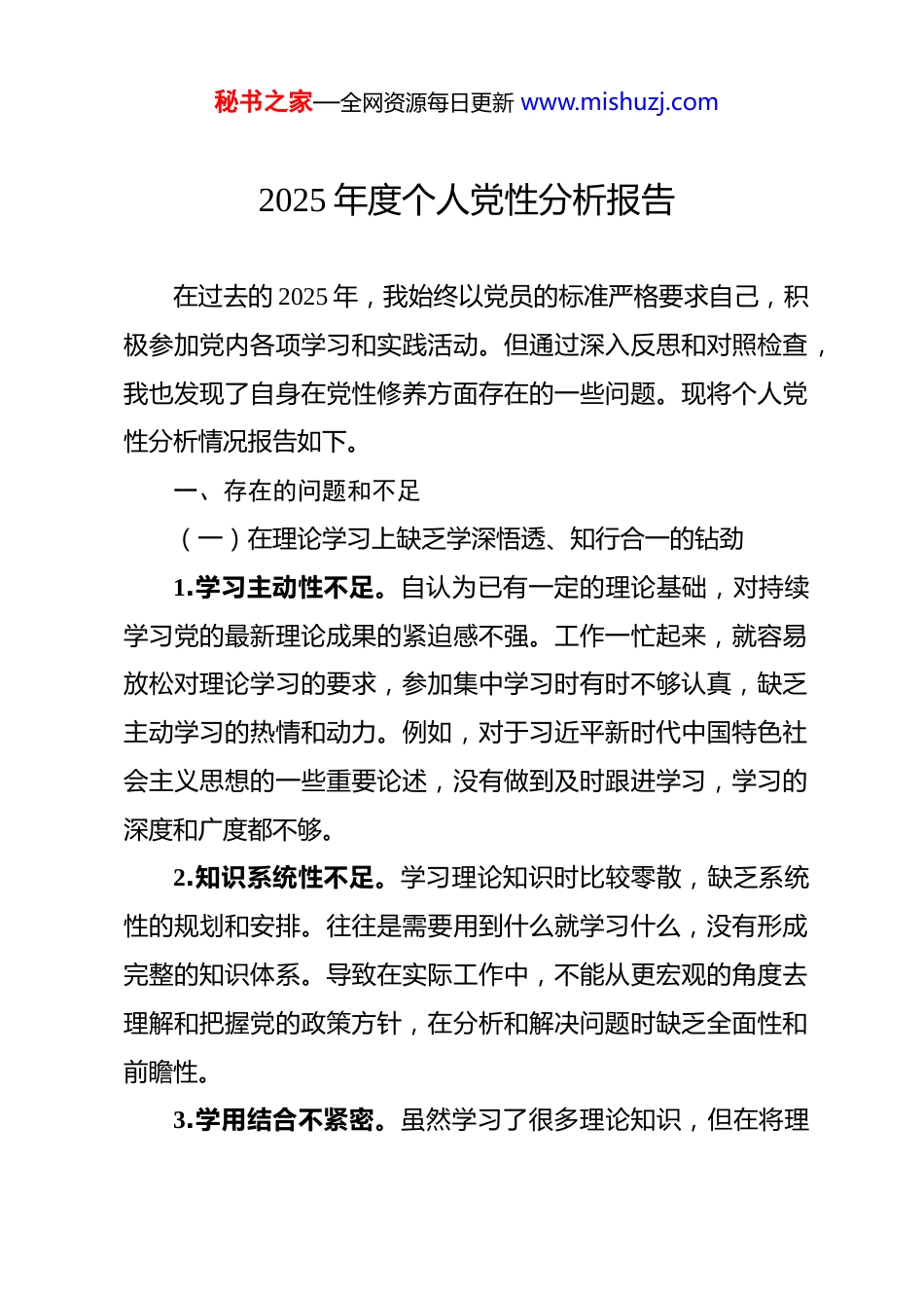 秘书之家—全网资源每日更新 www.mishuzj.com2025 年度个人党性分析报告 在过去的 2025 年,我始终以党员的标准严格要求自己,积极参加党内各项学习和实践活动。但通过深入反思和对照检查,我也发现了自身在党性修养方面存在的一些问题。现将个人党性分析情况报告如下。一、存在的问题和不足(一)在理论学习上缺乏学深悟透、知行合一的钻劲1.学习主动性不足。自认为已有一定的理论基础,对持续学习党的最新理论成果的紧迫感不强。工作一忙起来,就容易放松对理论学习的要求,参加集中学习时有时不够认真,缺乏主动学习的热情和动力。例如,对于习近平新时代中国特色社会主义思想的一些重要论述,没有做到及时跟进学习,学习的深度和广度都不够。2.知识系统性不足。学习理论知识时比较零散,缺乏系统性的规划和安排。往往是需要用到什么就学习什么,没有形成完整的知识体系。导致在实际工作中,不能从更宏观的角度去理解和把握党的政策方针,在分析和解决问题时缺乏全面性和前瞻性。3.学用结合不紧密。虽然学习了很多理论知识,但在将理秘书之家—全网资源每日更新 www.mishuzj.com论运用到实际工作中时,存在脱节现象。没有真正做到将理论与实践相结合,不能用所学的理论知识指导工作实践,解决实际问题的能力还有待提高。比如,在面对工作中的一些难题时,不能很好地运用理论知识去分析和解决,还是习惯于用老经验、老方法。(二)在党性修养上缺乏持之以恒、自我革新的韧劲1.党性观念有所淡化。随着时间的推移,在日常工作和生活中,对党性修养的重视程度有所下降。有时会把自己混同于普通群众,没有时刻以党员的高标准严格要求自己。在一些小事上,没有充分发挥党员的先锋模范作用,对自己的要求不够严格。2.批评与自我批评不够深入。在党内组织生活中,开展批评与自我批评时,往往存在避重就轻的现象。对自己的问题认识不够深刻,批评自己时不够严厉;对他人的批评也不够坦诚,缺乏一针见血的勇气。导致不能真正从思想深处认识到自己的问题,也不能有效地帮助他人改进。3.自我约束能力有待加强。在遵守党的纪律和规矩方面,有时存在侥幸心理。在一些细节问题上,没有严格遵守相关规定,对自己的行为缺乏有效的约束。比如,在工作纪律方面,有时会出现迟到早退的现象,没有严格遵守单位的考勤制度。秘书之家—全网资源每日更新 www.mishuzj.com(三)在工作作风上缺乏真抓实干、勇于担当的干劲1.工作执行力不够强。对于上级安排的工作任务,有时存在拖延现象,不能及时、高效地完成。在工作中,缺乏雷厉风行的工作作风,对一些工作的推进力度不够,导致工作进度缓慢。例如,在某项重点工作中,没有按照时间节点完成任务,影响了整体工作的进展。2.担当意识不够强。在面对工作中的困难和挑战时,有时会存在畏难情绪,不敢主动承担责任。缺乏勇于担当的精神,遇到问题时习惯于推诿扯皮,不能积极主动地去解决问题。比如,在处理一些复杂的工作问题时,没有充分发挥自己的主观能动性,而是等待领导的指示和安排。3.创新意识不够强。在工作中,习惯于按照传统的方式和方法开展工作,缺乏创新思维和创新能力。对新的工作理念和方法接受较慢,不能及时适应新形势、新任务的要求。在解决工作中的问题时,缺乏创新的思路和举措,导致工作效果不够理想。二、原因分析(一)理想信念根基不牢。对理论学习的重要性认识不足,没有把理论学习作为提高自身素质和党性修养的重要途径。缺乏对马克思主义、中国特色社会主义的坚定信仰,没有真正从秘书之家—全网资源每日更新 www.mishuzj.com思想深处树立起正确的世界观、人生观和价值观。在工作和生活中,不能始终保持对党的忠诚,对党的事业缺乏高度的责任感和使命感。(二)党性锻炼不够经常。在日常工作和生活中,没有把党性锻炼作为一项长期的、经常性的任务来抓。参加党内组织生活不够认真,对党的纪律和规矩的学习不够深入,缺乏自我反省和自我约束的意识。在面对各种诱惑和挑战时,不能始终保持清醒的头脑,容易受到不良思想的影响。(三)宗旨意识有所淡薄。在工作中,没有始终把人民群众的利益放在首位,没有真正做到全心全意...