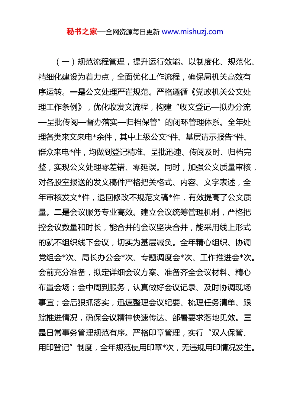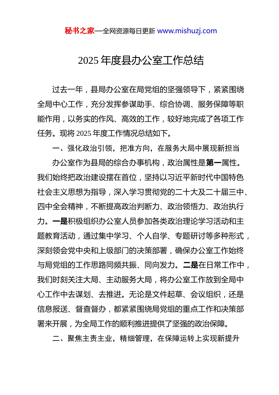 秘书之家—全网资源每日更新 www.mishuzj.com2025 年度县办公室工作总结 过去一年,县局办公室在局党组的坚强领导下,紧紧围绕全局中心工作,充分发挥参谋助手、综合协调、服务保障等职能作用,以务实的作风、高效的工作,较好地完成了各项工作任务。现将 2025 年度工作情况总结如下。一、强化政治引领,把准方向,在服务大局中展现新担当办公室作为县局的综合办事机构,政治属性是第一属性。我们始终把政治建设摆在首位,坚持以习近平新时代中国特色社会主义思想为指导,深入学习贯彻党的二十大及二十届三中、四中全会精神,不断提高政治判断力、政治领悟力、政治执行力。一是积极组织办公室人员参加各类政治理论学习活动和主题教育活动,通过集中学习、个人自学、专题研讨等多种形式,深刻领会党中央和上级部门的决策部署,确保办公室工作始终与局党组的工作思路同频共振、同向发力。二是在日常工作中,我们时刻关注大局、主动服务大局,将办公室工作放到全局中心工作中去谋划、去推进。无论是文件起草、会议组织,还是信息报送、督查督办,都紧紧围绕局党组的重点工作和决策部署来开展,为全局工作的顺利推进提供了坚强的政治保障。二、聚焦主责主业,精细管理,在保障运转上实现新提升秘书之家—全网资源每日更新 www.mishuzj.com(一)规范流程管理,提升运行效能。以制度化、规范化、精细化建设为着力点,全面优化工作流程,确保局机关高效有序运转。一是公文处理严谨规范。严格遵循《党政机关公文处理工作条例》,优化收发文流程,构建“收文登记—拟办分流—呈批传阅—督办落实—归档保管”的闭环管理体系。全年处理各类来文来电*余件,其中上级公文*件、基层请示报告*件、群众来电*件,均做到登记精准、呈批迅速、传阅及时、归档完整,实现公文处理零差错、零延误。同时,加强公文质量审核,对各股室报送的发文稿件严格把关格式、内容、文字表述,全年审核发文*件,退回修改不规范文稿*件,有效提高了公文质量。二是会议服务专业高效。建立会议统筹管理机制,严格把控会议数量和时长,能合并的会议坚决合并,能采用线上形式的就不组织线下会议,切实为基层减负。全年精心组织、协调党组会*次、局长办公会*次、专题调度会*次、工作推进会*次。会前充分准备,拟定详细会议方案、准备齐全会议材料、精心布置会场;会中周到服务,认真做好会议记录、及时协调现场事宜;会后狠抓落实,迅速整理会议纪要、梳理任务清单、跟踪推进情况,确保会议精神快速传达、部署要求落地见效。三是日常事务管理规范有序。严格印章管理,实行“双人保管、用印登记”制度,全年规范使用印章*次,无违规用印情况发生。秘书之家—全网资源每日更新 www.mishuzj.com加强档案管理,对年度文书、照片、视频等档案资料进行科学分类整理、细致编号归档,共归档档案*卷,查阅利用*人次,做到管理规范、查阅便捷。修订完善《机关值班制度》《考勤管理制度》《公务接待管理办法》等*项内部制度,进一步明确工作标准和流程,推动机关管理提质增效。(二)强化督查督办,狠抓工作落实。建立“台账管理、精准督办、闭环落实”的督查工作机制,以强有力的督查推动各项决策部署落地生根。一是建账明责,清晰任务。围绕局年度重点工作(如重点项目建设推进、营商环境优化提升、民生实事落实等)、领导批示交办事项、上级督导反馈问题整改等,建立专项督查台账*个,明确责任股室、责任人和完成时限,实行“销号管理”,确保每项工作有人抓、有人管、有结果。二是精准发力,聚焦重点。聚焦重点项目推进,对*个重大产业项目、*个基础设施建设项目等,实行“周调度、月通报”,全年开展专项督查*余次,下发督办通知单*余份,推动多个项目提前*个月竣工投用。聚焦群众急难愁盼问题,配合相关股室深入开展市场价格监管、消费者权益保护、行政审批效率提升等民生领域专项整治,累计检查企业和商户*家,发现并整改问题*个,有效维护了市场秩序和群众合法权益。三是闭环管理,确保成效。坚持“事事有回音、件件有着落”,对每一项督办事秘书之家—全网资源每日更新 www.mishuzj.com项,定期跟踪进展情况,及时向局...