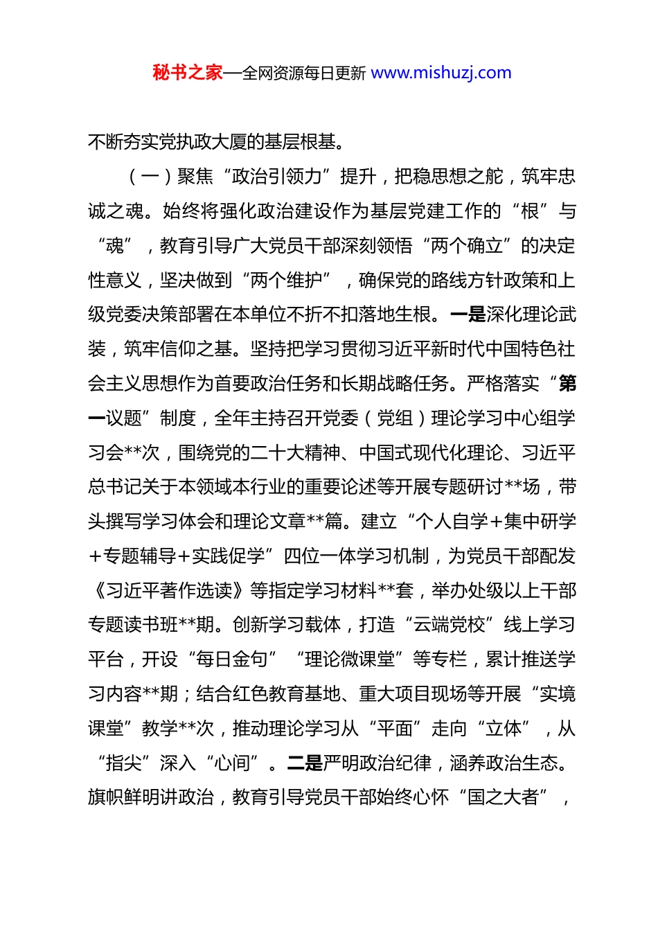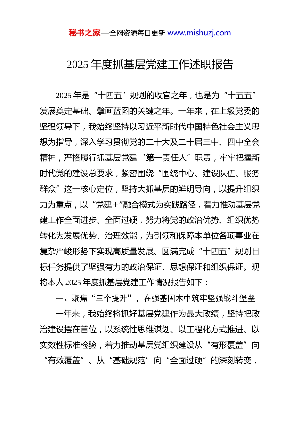秘书之家—全网资源每日更新 www.mishuzj.com2025 年度抓基层党建工作述职报告 2025 年是“十四五”规划的收官之年,也是为“十五五”发展奠定基础、擘画蓝图的关键之年。一年来,在上级党委的坚强领导下,我始终坚持以习近平新时代中国特色社会主义思想为指导,深入学习贯彻党的二十大及二十届三中、四中全会精神,严格履行抓基层党建“第一责任人”职责,牢牢把握新时代党的建设总要求,紧密围绕“围绕中心、建设队伍、服务群众”这一核心定位,坚持大抓基层的鲜明导向,以提升组织力为重点,以“党建+”融合模式为实践路径,着力推动基层党建工作全面进步、全面过硬,努力将党的政治优势、组织优势转化为发展优势、治理效能,为引领和保障本单位各项事业在复杂严峻形势下实现高质量发展、圆满完成“十四五”规划目标任务提供了坚强有力的政治保证、思想保证和组织保证。现将本人 2025 年度抓基层党建工作情况报告如下:一、聚焦“三个提升”,在强基固本中筑牢坚强战斗堡垒一年来,我始终将抓好基层党建作为最大政绩,坚持把政治建设摆在首位,以系统性思维谋划、以工程化方式推进、以实效性标准检验,着力推动基层党组织建设从“有形覆盖”向“有效覆盖”、从“基础规范”向“全面过硬”的深刻转变,秘书之家—全网资源每日更新 www.mishuzj.com不断夯实党执政大厦的基层根基。(一)聚焦“政治引领力”提升,把稳思想之舵,筑牢忠诚之魂。始终将强化政治建设作为基层党建工作的“根”与“魂”,教育引导广大党员干部深刻领悟“两个确立”的决定性意义,坚决做到“两个维护”,确保党的路线方针政策和上级党委决策部署在本单位不折不扣落地生根。一是深化理论武装,筑牢信仰之基。坚持把学习贯彻习近平新时代中国特色社会主义思想作为首要政治任务和长期战略任务。严格落实“第一议题”制度,全年主持召开党委(党组)理论学习中心组学习会**次,围绕党的二十大精神、中国式现代化理论、习近平总书记关于本领域本行业的重要论述等开展专题研讨**场,带头撰写学习体会和理论文章**篇。建立“个人自学+集中研学+专题辅导+实践促学”四位一体学习机制,为党员干部配发《习近平著作选读》等指定学习材料**套,举办处级以上干部专题读书班**期。创新学习载体,打造“云端党校”线上学习平台,开设“每日金句”“理论微课堂”等专栏,累计推送学习内容**期;结合红色教育基地、重大项目现场等开展“实境课堂”教学**次,推动理论学习从“平面”走向“立体”,从“指尖”深入“心间”。二是严明政治纪律,涵养政治生态。旗帜鲜明讲政治,教育引导党员干部始终心怀“国之大者”,秘书之家—全网资源每日更新 www.mishuzj.com不断提高政治判断力、政治领悟力、政治执行力。严格执行《关于新形势下党内政治生活的若干准则》,高质量召开年度民主生活会和组织生活会,严肃认真开展批评和自我批评。严格落实民主集中制,健全完善党委(党组)议事规则和决策程序,全年召开党委(党组)会议研究“三重一大”事项**项。加强政治忠诚教育和党性锻炼,组织开展“重温入党誓词、重忆入党经历、重问入党初心”主题党日活动**场,举办“对党忠诚”主题演讲比赛和知识竞赛**场。加强对党员干部政治表现的日常考察和监督管理,坚决同各种违背党的原则、违反党规党纪的言行作斗争,营造了风清气正的良好政治生态。三是强化政治担当,推动决策落实。坚持把贯彻落实习近平总书记重要指示批示精神和党中央决策部署作为最重大政治任务,建立闭环管理机制,制定专项落实方案,明确责任分工和时限要求,加强跟踪督办和效果评估。围绕服务国家重大战略、推动高质量发展、防范化解重大风险等中心工作,设立党员攻坚专班**个,引导党员干部在关键时刻冲锋在前、勇挑重担。全年围绕上级重大决策部署开展专项督查**次,确保政令畅通、令行禁止,切实把“两个维护”体现在坚决贯彻党中央决策部署的行动上,体现在履职尽责、做好本职工作的实效上。(二)聚焦“组织体系力”提升,夯实基层之基,锻造坚秘书之家—全网资源每日更新 www.mishuzj.com强核心。牢固树立“党的一切工作到支部”的鲜明导向,以提...