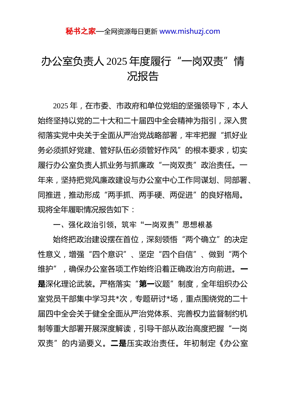 秘书之家—全网资源每日更新 www.mishuzj.com办公室负责人 2025 年度履行“一岗双责”情况报告 2025 年,在市委、市政府和单位党组的坚强领导下,本人始终坚持以党的二十大和二十届四中全会精神为指引,深入贯彻落实党中央关于全面从严治党战略部署,牢牢把握“抓好业务必须抓好党建、管好队伍必须管好作风”的根本要求,切实履行办公室负责人抓业务与抓廉政“一岗双责”政治责任。一年来,坚持把党风廉政建设与办公室中心工作同谋划、同部署、同推进,推动形成“两手抓、两手硬、两促进”的良好格局。现将全年履职情况报告如下:一、强化政治引领,筑牢“一岗双责”思想根基始终把政治建设摆在首位,深刻领悟“两个确立”的决定性意义,增强“四个意识”、坚定“四个自信”、做到“两个维护”,确保办公室各项工作始终沿着正确政治方向前进。一是深化理论武装。严格落实“第一议题”制度,全年组织办公室党员干部集中学习共*次,专题研讨*场,重点围绕党的二十届四中全会关于健全全面从严治党体系、完善权力监督制约机制等重大部署开展深度解读,引导干部从政治高度把握“一岗双责”的内涵要义。二是压实政治责任。年初制定《办公室秘书之家—全网资源每日更新 www.mishuzj.com2025 年党风廉政建设责任清单》,明确本人作为第一责任人需承担的*项具体任务,并与各科室负责人签订《廉洁履职承诺书》*份,将责任细化到岗、落实到人。三是严肃党内政治生活。带头落实“三会一课”、组织生活会、民主评议党员等制度,全年讲授廉政党课*次,开展谈心谈话*人次,对苗头性、倾向性问题及时提醒纠偏,确保干部队伍政治过硬、作风优良。二、聚焦主责主业,推动业务工作与廉政建设深度融合坚持把“一岗双责”融入办公室运转全过程,以高效服务保障全局工作,以严实作风防范廉政风险,实现业务提升与廉政建设互促共进。一是提升参谋辅政质效。围绕市委、市政府中心工作,牵头起草综合性文稿*篇,其中*篇获市领导批示肯定;组织筹备重要会议*场、重大活动*次,做到零差错、零疏漏。在文件流转、信息报送、督查督办等环节,严格执行保密纪律和工作规范,全年未发生泄密或延误事件。二是优化综合协调效能。建立跨部门协作“首接负责制”,推动解决基层反映强烈的“多头报送”“重复填表”等问题*项;牵头修订《办公室工作规程》《公文处理实施细则》等制度*项,进一步压缩自由裁量空间,堵塞管理漏洞。三是强化后勤保障监管。针对办公用房、公务用车、政府采购等高风险领域,推行“阳光操作”机制。全年审核办公设备采购项目*个,节约财政资金*万秘书之家—全网资源每日更新 www.mishuzj.com元;公务用车运行费用同比下降*%,办公用房使用合规率达100%。三、紧盯关键环节,织密廉政风险防控网络坚持问题导向,聚焦办公室权力运行中的薄弱点、风险点健全制度、强化监督、狠抓执行,切实把权力关进制度笼子。一是排查廉政风险。组织各科室开展廉政风险点动态排查,梳理出文件审批、印章管理、经费报销、接待安排等*类*项风险点,逐一制定防控措施。例如,针对印章使用,实行“申请—审核—登记—监用”四步闭环管理,全年用印*次,无一违规。二是规范权力运行。严格执行“三重一大”事项集体决策制度,凡涉及大额资金使用、重要人事建议、重大活动安排等事项,均提交主任办公会集体研究,全年召开主任办公会*次,议定事项*项,决策过程全程留痕、可查可溯。三是加强日常监督。依托“智慧办公”平台,对公文流转时效、会议通知响应、任务交办进度等进行实时监测,对超期未办结事项自动预警*次;配合派驻纪检监察组开展专项检查*次,对发现的*个问题立行立改,整改完成率 100%。四、严明纪律规矩,涵养风清气正的政治生态始终把纪律和规矩挺在前面,以严的基调、严的措施、严的氛围推动作风建设常态化长效化。一是抓实警示教育。组织秘书之家—全网资源每日更新 www.mishuzj.com观看《持续发力纵深推进》等警示教育片*部,通报典型案例*起,赴廉政教育基地开展现场教学*次,引导干部知敬畏、存戒惧、守底线。针对办公室接触面广、信息敏感等特点,重点强调“八小时外”行为规范,严禁利用...