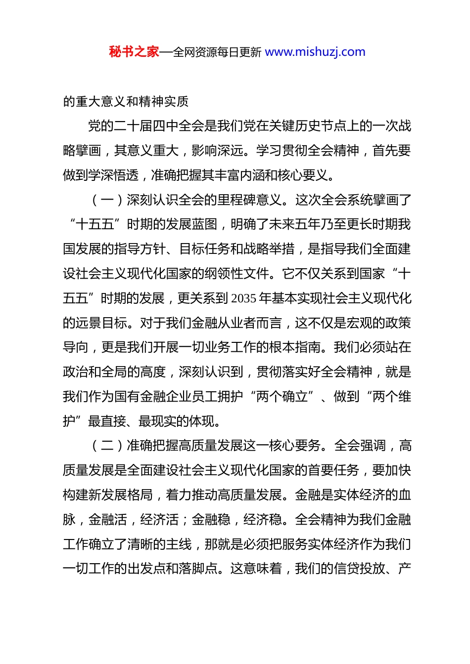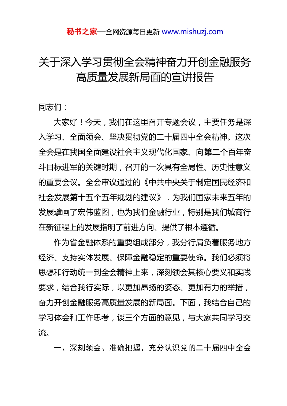 秘书之家—全网资源每日更新 www.mishuzj.com关于深入学习贯彻全会精神奋力开创金融服务高质量发展新局面的宣讲报告 同志们:大家好!今天,我们在这里召开专题会议,主要任务是深入学习、全面领会、坚决贯彻党的二十届四中全会精神。这次全会是在我国全面建设社会主义现代化国家、向第二个百年奋斗目标进军的关键时期,召开的一次具有全局性、历史性意义的重要会议。全会审议通过的《中共中央关于制定国民经济和社会发展第十五个五年规划的建议》,为我们国家未来五年的发展擘画了宏伟蓝图,也为我们金融行业,特别是我们城商行在新征程上的发展指明了前进方向、提供了根本遵循。作为省金融体系的重要组成部分,我分行肩负着服务地方经济、支持实体发展、保障金融稳定的重要使命。我们必须将思想和行动统一到全会精神上来,深刻领会其核心要义和实践要求,结合我行实际,以更加昂扬的姿态、更加有力的举措,奋力开创金融服务高质量发展的新局面。下面,我结合自己的学习体会和工作思考,谈三个方面的意见,与大家共同学习交流。一、深刻领会、准确把握,充分认识党的二十届四中全会秘书之家—全网资源每日更新 www.mishuzj.com的重大意义和精神实质党的二十届四中全会是我们党在关键历史节点上的一次战略擘画,其意义重大,影响深远。学习贯彻全会精神,首先要做到学深悟透,准确把握其丰富内涵和核心要义。(一)深刻认识全会的里程碑意义。这次全会系统擘画了“十五五”时期的发展蓝图,明确了未来五年乃至更长时期我国发展的指导方针、目标任务和战略举措,是指导我们全面建设社会主义现代化国家的纲领性文件。它不仅关系到国家“十五五”时期的发展,更关系到 2035 年基本实现社会主义现代化的远景目标。对于我们金融从业者而言,这不仅是宏观的政策导向,更是我们开展一切业务工作的根本指南。我们必须站在政治和全局的高度,深刻认识到,贯彻落实好全会精神,就是我们作为国有金融企业员工拥护“两个确立”、做到“两个维护”最直接、最现实的体现。(二)准确把握高质量发展这一核心要务。全会强调,高质量发展是全面建设社会主义现代化国家的首要任务,要加快构建新发展格局,着力推动高质量发展。金融是实体经济的血脉,金融活,经济活;金融稳,经济稳。全会精神为我们金融工作确立了清晰的主线,那就是必须把服务实体经济作为我们一切工作的出发点和落脚点。这意味着,我们的信贷投放、产秘书之家—全网资源每日更新 www.mishuzj.com品创新、服务模式都必须围绕如何更好地支持实体经济,特别是支持**省的转型发展和现代化建设来展开。我们不能搞脱实向虚的资金空转,更不能偏离服务地方的根本宗旨。(三)重点领会全面深化改革与国家治理现代化的战略部署。全会强调,要继续全面深化改革,推进国家治理体系和治理能力现代化。金融治理是国家治理体系的重要组成部分。这对我们银行业提出了更高的要求。一方面,我们要持续深化自身的体制机制改革,完善现代金融企业制度,提升内部治理水平,使我们的经营管理更加科学、高效、规范。另一方面,我们要主动融入国家治理现代化大局,在防范化解金融风险、维护区域金融稳定、打击金融犯罪等方面发挥应有作用,筑牢金融安全的防线,当好地方金融的“稳定器”和“压舱石”。二、紧密结合、狠抓落实,以全会精神引领分行高质量发展再上新台阶学习的目的在于运用。我们必须将全会精神与我行改革发展的实践紧密结合起来,找准切入点和着力点,将宏伟蓝图转化为我们分行具体的“施工图”和“实景画”。截至 2025 年 11月末,在全体员工的共同努力下,我分行资产总额已历史性地突破 850 亿元,各项存款余额达到 780 亿元,贷款余额超过 600亿元,不良贷款率坚定地控制在 1.3%以下,资产质量持续向好,秘书之家—全网资源每日更新 www.mishuzj.com主要经营指标在**地区同业中名列前茅。这些成绩来之不易,但对照全会提出的新要求,我们仍有巨大的提升空间。下一步,我们要重点在以下几个方面下功夫:(一)聚焦主责主业,在服务实体经济中展现新担当。全会精神要求我们把发展的着力点放在实体经济上。作为**省自己的...
