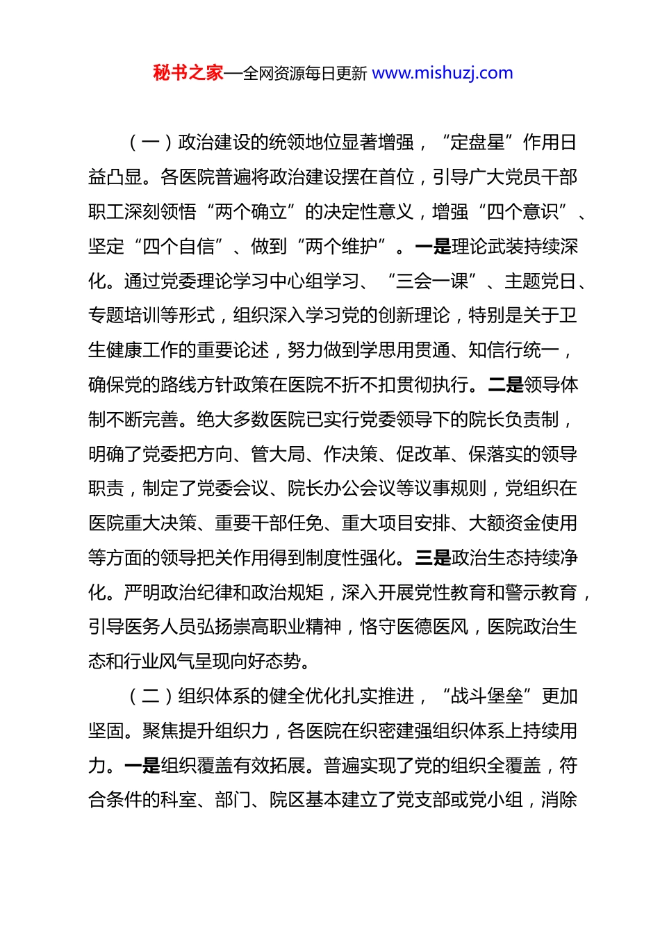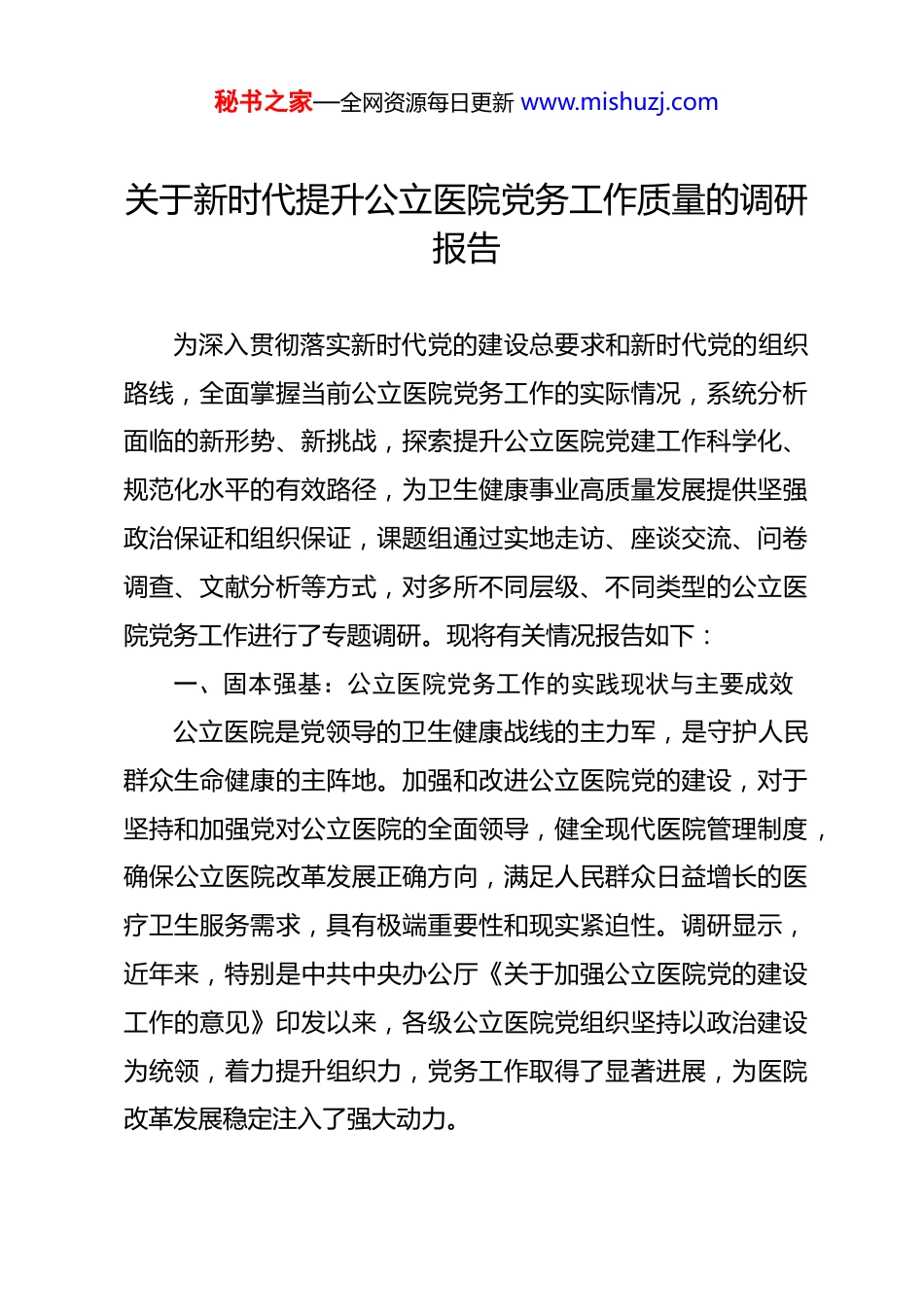 秘书之家—全网资源每日更新 www.mishuzj.com关于新时代提升公立医院党务工作质量的调研报告 为深入贯彻落实新时代党的建设总要求和新时代党的组织路线,全面掌握当前公立医院党务工作的实际情况,系统分析面临的新形势、新挑战,探索提升公立医院党建工作科学化、规范化水平的有效路径,为卫生健康事业高质量发展提供坚强政治保证和组织保证,课题组通过实地走访、座谈交流、问卷调查、文献分析等方式,对多所不同层级、不同类型的公立医院党务工作进行了专题调研。现将有关情况报告如下:一、固本强基:公立医院党务工作的实践现状与主要成效公立医院是党领导的卫生健康战线的主力军,是守护人民群众生命健康的主阵地。加强和改进公立医院党的建设,对于坚持和加强党对公立医院的全面领导,健全现代医院管理制度,确保公立医院改革发展正确方向,满足人民群众日益增长的医疗卫生服务需求,具有极端重要性和现实紧迫性。调研显示,近年来,特别是中共中央办公厅《关于加强公立医院党的建设工作的意见》印发以来,各级公立医院党组织坚持以政治建设为统领,着力提升组织力,党务工作取得了显著进展,为医院改革发展稳定注入了强大动力。秘书之家—全网资源每日更新 www.mishuzj.com(一)政治建设的统领地位显著增强,“定盘星”作用日益凸显。各医院普遍将政治建设摆在首位,引导广大党员干部职工深刻领悟“两个确立”的决定性意义,增强“四个意识”、坚定“四个自信”、做到“两个维护”。一是理论武装持续深化。通过党委理论学习中心组学习、“三会一课”、主题党日、专题培训等形式,组织深入学习党的创新理论,特别是关于卫生健康工作的重要论述,努力做到学思用贯通、知信行统一,确保党的路线方针政策在医院不折不扣贯彻执行。二是领导体制不断完善。绝大多数医院已实行党委领导下的院长负责制,明确了党委把方向、管大局、作决策、促改革、保落实的领导职责,制定了党委会议、院长办公会议等议事规则,党组织在医院重大决策、重要干部任免、重大项目安排、大额资金使用等方面的领导把关作用得到制度性强化。三是政治生态持续净化。严明政治纪律和政治规矩,深入开展党性教育和警示教育,引导医务人员弘扬崇高职业精神,恪守医德医风,医院政治生态和行业风气呈现向好态势。(二)组织体系的健全优化扎实推进,“战斗堡垒”更加坚固。聚焦提升组织力,各医院在织密建强组织体系上持续用力。一是组织覆盖有效拓展。普遍实现了党的组织全覆盖,符合条件的科室、部门、院区基本建立了党支部或党小组,消除秘书之家—全网资源每日更新 www.mishuzj.com了党建空白点。积极探索在重大项目组、援外医疗队、疫情防控临时机构等建立临时党组织,确保党的工作全覆盖。二是支部建设标准化规范化水平提升。扎实推进党支部标准化规范化建设,许多医院制定了支部工作手册、考核细则,规范了组织生活、党员发展、党费收缴使用管理等基础工作,“三会一课”质量得到改善,主题党日活动形式内容不断丰富。三是带头人队伍选优配强。注重选拔政治强、业务精、作风好、善管理的党员干部担任党支部书记,推行“双带头人”培育工程,临床医技科室党支部书记普遍由科室负责人或业务骨干担任,党建与业务融合有了更好的组织基础。(三)党建与业务融合的探索不断深入,“双轮驱动”格局初步形成。围绕中心、服务大局是党建工作的出发点和落脚点。各医院积极探索党建与业务工作深度融合的有效机制。一是在重大任务中彰显组织力量。在新冠肺炎疫情防控、脱贫攻坚对口帮扶、援疆援藏、应急抢险救援等重大任务中,各级党组织迅速动员,党员冲锋在前,发挥了中流砥柱作用,让党旗在卫生健康一线高高飘扬。二是在服务改善中体现党的宗旨。广泛开展“党员先锋岗”、“党员责任区”、“承诺践诺”等活动,推动党员在改善医疗服务、优化就医流程、开展义诊科普、参与医院管理等方面发挥先锋模范作用,着力解决群众看秘书之家—全网资源每日更新 www.mishuzj.com病就医急难愁盼问题。三是在学科人才建设中强化政治引领。党组织在人才引进、培养、使用中加强政治把关和思想引导,注重在高知群体、青年骨干...