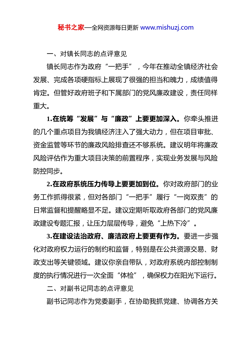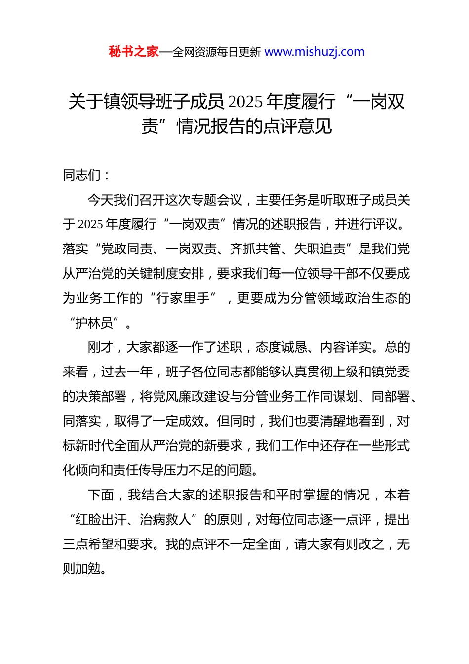 秘书之家—全网资源每日更新 www.mishuzj.com关于镇领导班子成员 2025 年度履行“一岗双责”情况报告的点评意见 同志们:今天我们召开这次专题会议,主要任务是听取班子成员关于 2025 年度履行“一岗双责”情况的述职报告,并进行评议。落实“党政同责、一岗双责、齐抓共管、失职追责”是我们党从严治党的关键制度安排,要求我们每一位领导干部不仅要成为业务工作的“行家里手”,更要成为分管领域政治生态的“护林员”。刚才,大家都逐一作了述职,态度诚恳、内容详实。总的来看,过去一年,班子各位同志都能够认真贯彻上级和镇党委的决策部署,将党风廉政建设与分管业务工作同谋划、同部署、同落实,取得了一定成效。但同时,我们也要清醒地看到,对标新时代全面从严治党的新要求,我们工作中还存在一些形式化倾向和责任传导压力不足的问题。下面,我结合大家的述职报告和平时掌握的情况,本着“红脸出汗、治病救人”的原则,对每位同志逐一点评,提出三点希望和要求。我的点评不一定全面,请大家有则改之,无则加勉。秘书之家—全网资源每日更新 www.mishuzj.com一、对镇长同志的点评意见镇长同志作为政府“一把手”,今年在推动全镇经济社会发展、完成各项硬指标上展现了很强的担当和魄力,成绩值得肯定。但管好政府班子和下属部门的党风廉政建设,责任同样重大。1.在统筹“发展”与“廉政”上要更加深入。你牵头推进的几个重点项目为我镇经济注入了强大动力,但在项目审批、资金监管等环节的廉政风险排查还不够系统。建议明年将廉政风险评估作为重大项目决策的前置程序,实现业务发展与风险防控同步。2.在政府系统压力传导上要更加到位。你对政府部门的业务工作抓得很紧,但对各部门“一把手”履行“一岗双责”的日常监督和提醒略显不足。建议定期听取政府各部门的党风廉政建设专题汇报,让压力层层传导,避免“上热下冷”。3.在建设法治政府、廉洁政府上要更有作为。要进一步强化对政府权力运行的制约和监督,特别是在公共资源交易、财政支出等关键领域。建议你亲自带队,对政府系统内部控制制度的执行情况进行一次全面“体检”,确保权力在阳光下运行。二、对副书记同志的点评意见副书记同志作为党委副手,在协助我抓党建、协调各方关秘书之家—全网资源每日更新 www.mishuzj.com系上发挥了重要作用,特别是在推动基层党组织标准化建设方面成效显著。1.在党建工作创新上要敢于突破。今年的党建工作规定动作做得很好,但在结合我镇实际、打造特色党建品牌上亮点不多。建议明年围绕“党建引领乡村振兴”主题,策划一两个有影响力的载体和活动,将党建活力转化为发展动力。2.在干部队伍日常监管上要抓早抓小。你分管党群,对干部的思想动态掌握比较全面,但有时存在“老好人”思想,批评教育不够“辣味”。建议多运用谈心谈话、提醒函询等方式,发现苗头性、倾向性问题及时咬耳扯袖,防止小问题演变成大错误。3.在督促班子成员落实“一岗双责”上要主动作为。作为专职副书记,你有责任协助我督促班子其他成员履行好“一岗双责”。建议你牵头建立“一岗双责”履职纪实台账定期检查、定期通报,让这项责任真正从“纸上”落到“地上”。三、对挂职副书记同志的点评意见你从市级机关下来挂职,带来了新的理念和宝贵资源,为我镇的发展注入了活力,工作热情和专业能力有目共睹。1.在发挥“桥梁”作用上要更进一步。你不仅要当好“联络员”,更要当好“指导员”。建议将上级单位先进的党风廉秘书之家—全网资源每日更新 www.mishuzj.com政建设经验和管理模式系统地介绍给我镇,并结合我镇实际,帮助分管部门建立一两项管长远的制度机制,留下“带不走”的财富。2.在融入基层实践上要更加深入。挂职时间宝贵,要避免“漂在上面”。建议你多花时间深入村居、企业一线,了解基层在落实“一岗双责”中遇到的真实困难,并将这些第一手情况及时向党委反映,使我们的决策更接地气。3.在自我廉政要求上要始终如一。作为挂职干部,一言一行都代表着派出单位的形象。希望你珍惜荣誉、严于律己,在项目、资金等方面更要守住底线、不碰红线,以过硬的作风和廉洁的形象为全镇干部作出表率...