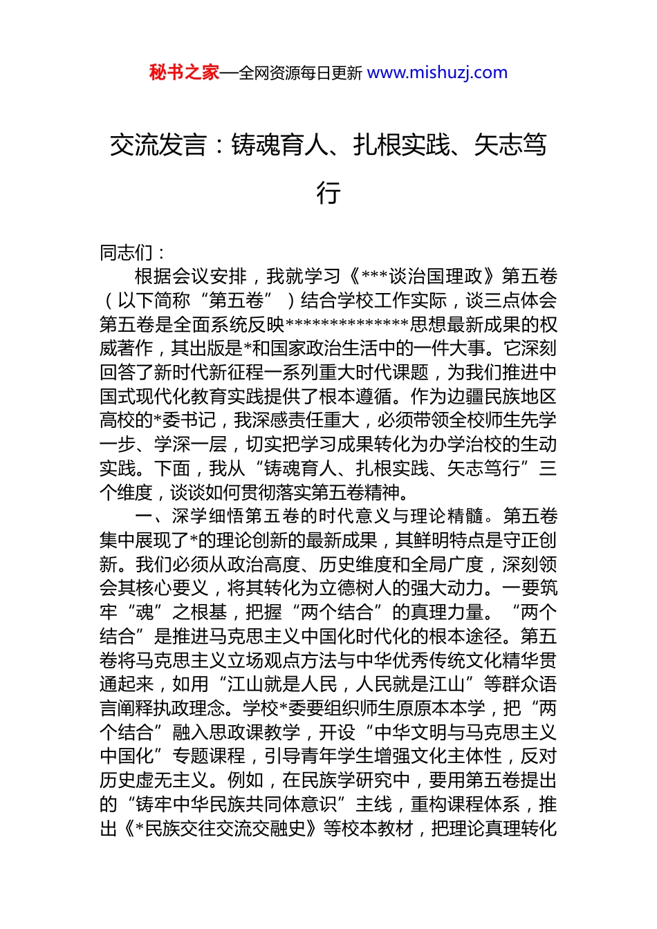 秘书之家—全网资源每日更新 www.mishuzj.com交流发言:铸魂育人、扎根实践、矢志笃行同志们:根据会议安排,我就学习《***谈治国理政》第五卷(以下简称“第五卷”)结合学校工作实际,谈三点体会第五卷是全面系统反映**************思想最新成果的权威著作,其出版是*和国家政治生活中的一件大事。它深刻回答了新时代新征程一系列重大时代课题,为我们推进中国式现代化教育实践提供了根本遵循。作为边疆民族地区高校的*委书记,我深感责任重大,必须带领全校师生先学一步、学深一层,切实把学习成果转化为办学治校的生动实践。下面,我从“铸魂育人、扎根实践、矢志笃行”三个维度,谈谈如何贯彻落实第五卷精神。一、深学细悟第五卷的时代意义与理论精髓。第五卷集中展现了*的理论创新的最新成果,其鲜明特点是守正创新。我们必须从政治高度、历史维度和全局广度,深刻领会其核心要义,将其转化为立德树人的强大动力。一要筑牢“魂”之根基,把握“两个结合”的真理力量。“两个结合”是推进马克思主义中国化时代化的根本途径。第五卷将马克思主义立场观点方法与中华优秀传统文化精华贯通起来,如用“江山就是人民,人民就是江山”等群众语言阐释执政理念。学校*委要组织师生原原本本学,把“两个结合”融入思政课教学,开设“中华文明与马克思主义中国化”专题课程,引导青年学生增强文化主体性,反对历史虚无主义。例如,在民族学研究中,要用第五卷提出的“铸牢中华民族共同体意识”主线,重构课程体系,推出《*民族交往交流交融史》等校本教材,把理论真理转化秘书之家—全网资源每日更新 www.mishuzj.com为育人实效。二要明晰“路”之方向,服务中国式现代化大局。第五卷初步构建了中国式现代化的理论体系,强调教育、科技、人才的一体推进。我校作为自治区师范教育龙头,必须紧扣“五大任务”和“筑牢北方生态安全屏障”等******的嘱托,优化学科布局。比如,生态学学科要聚焦“美丽中国建设”,设立“草原生态修复”重点实验室;教育学学科要探索“新质生产力驱动下的教育变革”,培养适应数字化转型的师资。今年,学校将增设“边疆地区可持续发展”交叉学科平台,推动科研成果直接服务自治区生态文明建设。三要强化“本”之纯洁,推进*的自我革命。第五卷指出,*的自我革命是破解大*独有难题的关键。学校*委要对照“解决大*独有难题”的要求,开展“干部作风提升年”活动,推行二级学院*组织述职评议,对学术腐败、师德失范“零容忍”。近期,我们将修订《*委领导下的校长负责制实施细则》,把全面从严治*覆盖到每个*支部,让 dj 成为事业发展的“红色引擎”。二、推动第五卷精神融入办学治校全过程。学习的目的在于运用。第五卷既是世界观也是方法论,必须紧扣立德树人主责主业,找到切入点、转化点。一要以“点”带面,深化课堂教学改革。课堂教学是理论传播的“第一现场”。要推动第五卷进教案、进课堂,思政课教师采用“案例+研讨”模式,用“黄河几字弯治理”等本土案例讲清“人与自然和谐共生”;专业课教师需挖掘课程思政元素,如化学课融入“新能源材料研发”服务碳中和目标。学校将设立“金课”专项基金,对融合第五卷精神的课程优先立项,每年评选 10 门示范课程,给予每门课程 5 万元建设经费支持。二要以“线”贯通,优化学科生态布局。第五卷提出“因地制宜发展新质生产力”。我校要立足区域需求,打造“师范教育+生态文明+数字经济”学科集群。例如,联合*社科院设立“*文化传承创新基地”,用数字技术复原辽代壁画;理工学院与包头钢企共建“稀土材料秘书之家—全网资源每日更新 www.mishuzj.com中试平台”,把论文写在草原上。未来三年,学校计划投入 5000 万元,重点建设“蒙古高原生态安全”等 3 个交叉学科群,推动学科结构从“高原”向“高峰”跨越。三要以“面”覆盖,构建“大思政”育人格局。第五卷强调“全过程人民民主”。学校要健全“三全育人”机制,学工部牵头开展“*青年跟*走”实践营,组织学生赴*调研乡村振兴;宣传部用校园融媒体宣传“师德标兵”,把“民生为大”的理念转化为“助学暖心工程”,今年计划扩增30%勤工助学...
