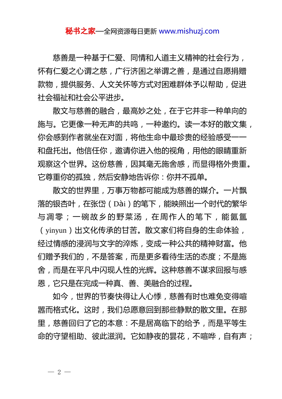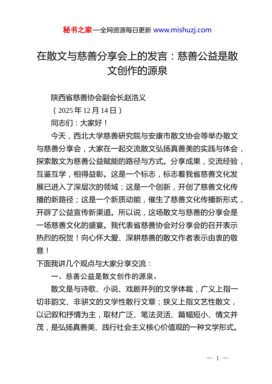 秘书之家—全网资源每日更新 www.mishuzj.com在散文与慈善分享会上的发言:慈善公益是散文创作的源泉陕西省慈善协会副会长赵浩义(2025 年 12 月 14 日)同志们:大家好!今天,西北大学慈善研究院与安康市散文协会等举办散文与慈善分享会,大家在一起交流散文弘扬真善美的实践与体会,探索散文为慈善公益赋能的路径与方式。分享成果,交流经验,互鉴互学,相得益彰。这是一个标志,标志着我省慈善文化发展已进入了深层次的领域;这是一个创新,开创了慈善文化传播的新路径;这是一个新质动能,催生了慈善文化传播新形式,开辟了公益宣传新渠道。所以说,这场散文与慈善的分享会是一场慈善文化的盛宴。我代表省慈善协会对分享会的召开表示热烈的祝贺!向心怀大爱、深耕慈善的散文作者表示由衷的敬意!下面我讲几个观点与大家分享交流:一、慈善公益是散文创作的源泉。散文是与诗歌、小说、戏剧并列的文学体裁,广义上指一切非韵文、非骈文的文学性散行文章;狭义上指文艺性散文,以记叙和抒情为主,取材广泛、笔法灵活、篇幅短小、情文并茂,是弘扬真善美、践行社会主义核心价值观的一种文学形式。— 1 —秘书之家—全网资源每日更新 www.mishuzj.com慈善是一种基于仁爱、同情和人道主义精神的社会行为,怀有仁爱之心谓之慈,广行济困之举谓之善,是通过自愿捐赠款物,提供服务、人文关怀等方式对困难群体予以帮助,促进社会福祉和社会公平进步。散文与慈善的融合,最高妙之处,在于它并非一种单向的施与。它更像一种无声的共鸣,一种邀约。读一本好的散文集,你会感到作者就坐在对面,将他生命中最珍贵的经验感受一一和盘托出。他信任你,邀请你进入他的视角,用他的眼睛重新观察这个世界。这份慈善,因其毫无施舍感,而显得格外贵重。它尊重你的孤独,然后安静地告诉你:你并不孤单。散文的世界里,万事万物都可能成为慈善的媒介。一片飘落的银杏叶,在张岱(Dài)的笔下,能映照出一个时代的繁华与 凋 零 ; 一 碗 故 乡 的 野 菜 汤 , 在 周 作 人 的 笔 下 , 能 氤 氲(yinyun)出文化传承的甘苦。散文家们将自身的生命体验,经过情感的浸润与文字的淬炼,变成一种公共的精神财富。他们赠予我们的,不是答案,而是更多看待生活的态度;不是施舍,而是在平凡中闪现人性的光辉。这种慈善不谋求回报与感恩,它只是在完成一种真、善、美融合的过程。如今,世界的节奏快得让人心悸,慈善有时也难免变得喧嚣而格式化。这时,我们总愿意回到那些静默的散文里。在那里,慈善回归了它的本意:不是居高临下的给予,而是平等生命的守望相助、彼此滋润。它如静夜的昙花,不喧哗,自有声;— 2 —秘书之家—全网资源每日更新 www.mishuzj.com它如滑润的细流,不澎湃,力千钧。这应该是散文所能给予我们这个时代,最深沉、最持久的一份慈善——它教会我们在奔腾的时代里,如何保持凝视的耐心,如何涵养一颗能被他人的故事所触动、也能理解自身悲欢的,柔软而丰沛的心。慈善的功效远超物质转移本身,它既是社会问题的“修复器”,也是文明进步的“催化器”。在当代社会,慈善正从传统的救济模式转向物质救助与人文关怀的赋能,不仅救急解难,更致力于心灵慰藉、激发人的潜能、塑造共享共善文化,促进共同富裕。一个健康的社会,必然拥有蓬勃而理性的慈善力量,在效率与温情之间寻找平衡,让发展更具人性化。因此,散文是弘扬真善美的文学形式,慈善是创造真善美的公益事业,慈善是散文创作的源泉。陕西慈善事业是散文创作的丰富宝藏。省慈善协会诞生于国家改革开放大潮之中,发展于社会扶贫力量崛起之时,创新于中国特色社会主义建设高质量发展阶段。二十九年来,徐山林、刘维隆、吴前进三任会长带领协会心怀“国”之大者,情系“民”之大事,与时俱进、守正创新、追求卓越、砥砺奋进。不断创新慈善工作的路径与方式,历经创业奠基、创新拓展、高质量发展三个阶段,进行了艰辛的探索,积淀了丰富的公益实践,创造了宝贵的经验。创立奠基阶段(1996 年到 2011 年):创立组建,创业奠基,高举“善”的大旗,开创陕西慈善大业。— 3 —秘书之家—全...
