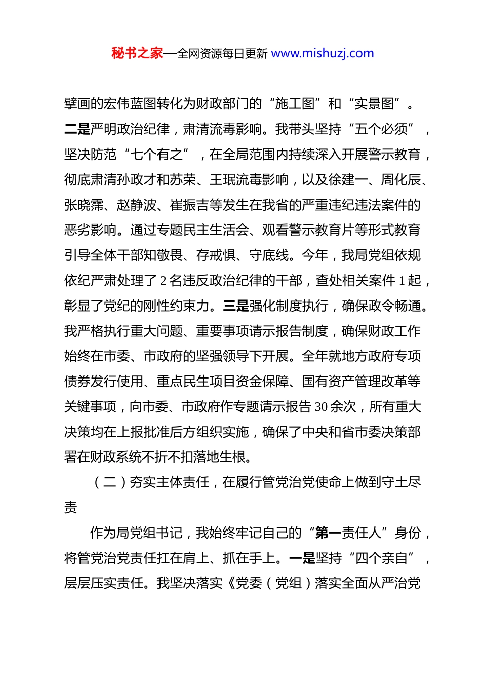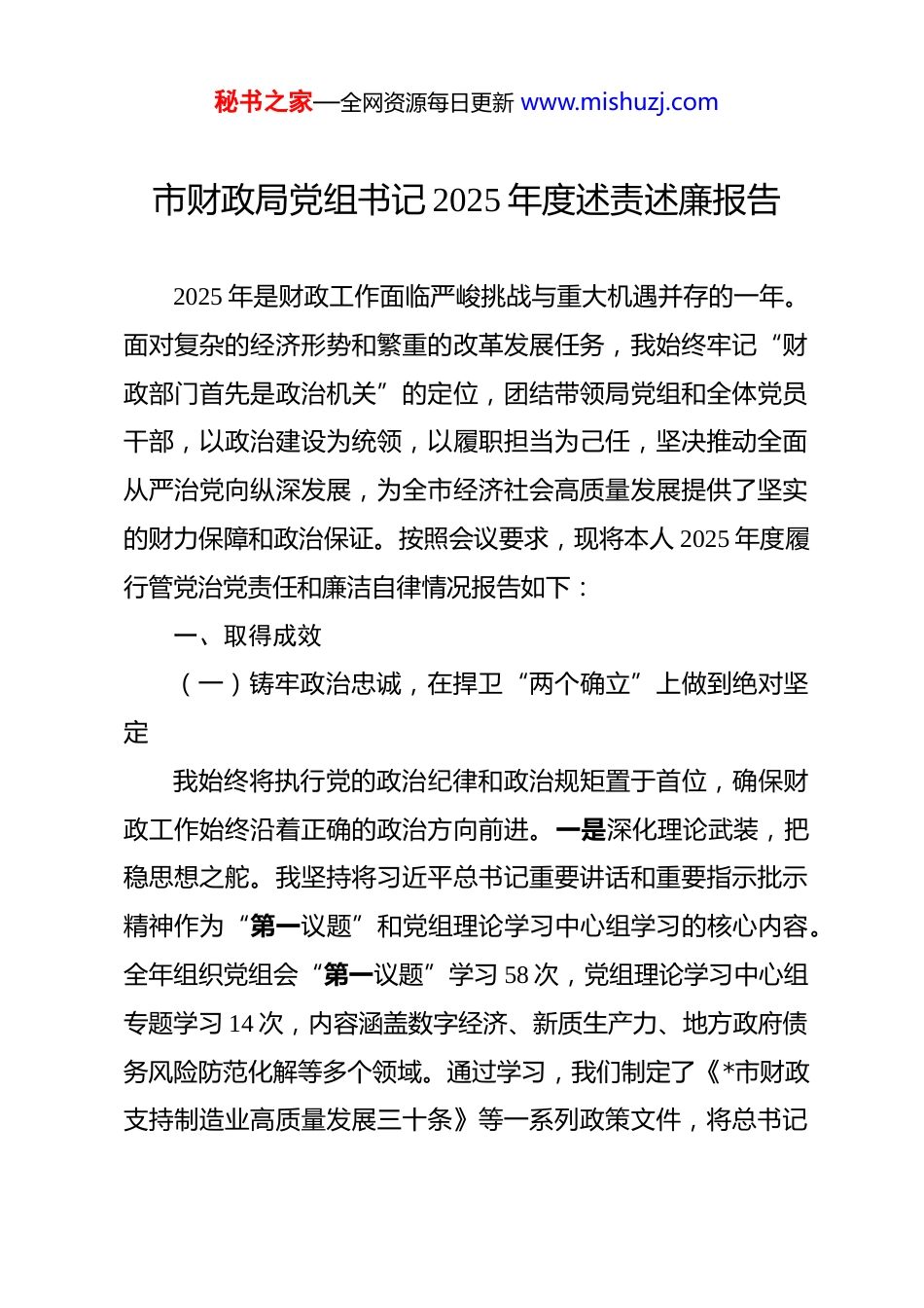 秘书之家—全网资源每日更新 www.mishuzj.com市财政局党组书记 2025 年度述责述廉报告 2025 年是财政工作面临严峻挑战与重大机遇并存的一年。面对复杂的经济形势和繁重的改革发展任务,我始终牢记“财政部门首先是政治机关”的定位,团结带领局党组和全体党员干部,以政治建设为统领,以履职担当为己任,坚决推动全面从严治党向纵深发展,为全市经济社会高质量发展提供了坚实的财力保障和政治保证。按照会议要求,现将本人 2025 年度履行管党治党责任和廉洁自律情况报告如下:一、取得成效(一)铸牢政治忠诚,在捍卫“两个确立”上做到绝对坚定我始终将执行党的政治纪律和政治规矩置于首位,确保财政工作始终沿着正确的政治方向前进。一是深化理论武装,把稳思想之舵。我坚持将习近平总书记重要讲话和重要指示批示精神作为“第一议题”和党组理论学习中心组学习的核心内容。全年组织党组会“第一议题”学习 58 次,党组理论学习中心组专题学习 14 次,内容涵盖数字经济、新质生产力、地方政府债务风险防范化解等多个领域。通过学习,我们制定了《*市财政支持制造业高质量发展三十条》等一系列政策文件,将总书记秘书之家—全网资源每日更新 www.mishuzj.com擘画的宏伟蓝图转化为财政部门的“施工图”和“实景图”。二是严明政治纪律,肃清流毒影响。我带头坚持“五个必须”,坚决防范“七个有之”,在全局范围内持续深入开展警示教育,彻底肃清孙政才和苏荣、王珉流毒影响,以及徐建一、周化辰、张晓霈、赵静波、崔振吉等发生在我省的严重违纪违法案件的恶劣影响。通过专题民主生活会、观看警示教育片等形式教育引导全体干部知敬畏、存戒惧、守底线。今年,我局党组依规依纪严肃处理了 2 名违反政治纪律的干部,查处相关案件 1 起,彰显了党纪的刚性约束力。三是强化制度执行,确保政令畅通。我严格执行重大问题、重要事项请示报告制度,确保财政工作始终在市委、市政府的坚强领导下开展。全年就地方政府专项债券发行使用、重点民生项目资金保障、国有资产管理改革等关键事项,向市委、市政府作专题请示报告 30 余次,所有重大决策均在上报批准后方组织实施,确保了中央和省市委决策部署在财政系统不折不扣落地生根。(二)夯实主体责任,在履行管党治党使命上做到守土尽责作为局党组书记,我始终牢记自己的“第一责任人”身份,将管党治党责任扛在肩上、抓在手上。一是坚持“四个亲自”,层层压实责任。我坚决落实《党委(党组)落实全面从严治党秘书之家—全网资源每日更新 www.mishuzj.com主体责任规定》,对党风廉政建设工作始终做到重要工作亲自部署、重大问题亲自过问、重点环节亲自协调、重要案件亲自督办。年初即主持制定《2025 年度局党组全面从严治党主体责任清单》,将 8 大类 52 项具体任务分解到每位班子成员,确保责任无盲区、压力全覆盖。二是强化班子建设,发挥“头雁效应”。我严格执行《关于加强对“一把手”和领导班子监督的意见》,带头管班子、带队伍。全年与班子成员开展严肃认真的谈心谈话 40 余人次,督促领导班子其他成员认真履行“一岗双责”,将业务工作与党风廉政建设同谋划、同部署、同考核。在我的带动下,班子成员主动深入分管领域开展廉政风险排查,形成了齐抓共管的良好局面。三是做实日常监督,严管厚爱干部。我高度重视对下级“一把手”的监督,将其作为管党治党的关键环节。全年对新提拔的 6 名科室负责人和下属单位负责人全部开展任职谈话和勤政廉政谈话签订《勤政廉政承诺书》。针对日常监督中发现的苗头性、倾向性问题,及时开展提醒谈话 20 余人次,运用“咬耳扯袖、红脸出汗”的方式,防止小问题演变成大错误,真正做到抓早抓小、防微杜渐。(三)深化正风肃纪,在推进反腐倡廉工作上做到常抓不懈我始终坚持严的主基调不动摇,以“零容忍”态度惩治腐秘书之家—全网资源每日更新 www.mishuzj.com败,一体推进不敢腐、不能腐、不想腐。一是铁腕惩治腐败,形成有力震慑。今年,我局先后有两名前任局长因严重违纪违法问题被市纪委监委立案审查调查,并最终被开除党籍和公职。这一发生在身边的惨痛教训,对...