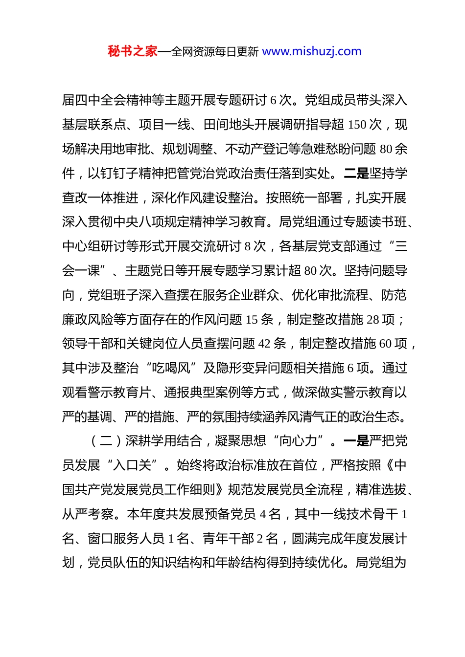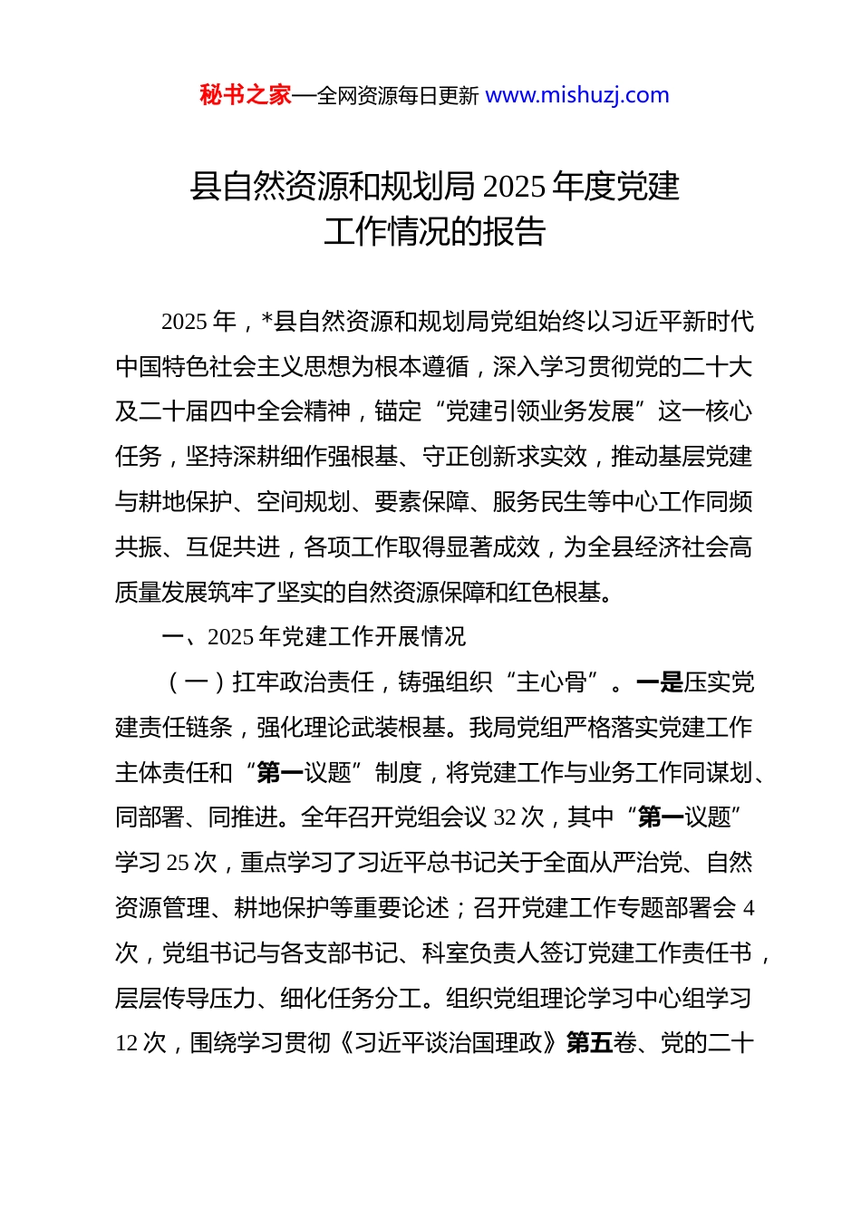 秘书之家—全网资源每日更新 www.mishuzj.com县自然资源和规划局 2025 年度党建工作情况的报告 2025 年,*县自然资源和规划局党组始终以习近平新时代中国特色社会主义思想为根本遵循,深入学习贯彻党的二十大及二十届四中全会精神,锚定“党建引领业务发展”这一核心任务,坚持深耕细作强根基、守正创新求实效,推动基层党建与耕地保护、空间规划、要素保障、服务民生等中心工作同频共振、互促共进,各项工作取得显著成效,为全县经济社会高质量发展筑牢了坚实的自然资源保障和红色根基。一、2025 年党建工作开展情况(一)扛牢政治责任,铸强组织“主心骨”。一是压实党建责任链条,强化理论武装根基。我局党组严格落实党建工作主体责任和“第一议题”制度,将党建工作与业务工作同谋划、同部署、同推进。全年召开党组会议 32 次,其中“第一议题”学习 25 次,重点学习了习近平总书记关于全面从严治党、自然资源管理、耕地保护等重要论述;召开党建工作专题部署会 4次,党组书记与各支部书记、科室负责人签订党建工作责任书,层层传导压力、细化任务分工。组织党组理论学习中心组学习12 次,围绕学习贯彻《习近平谈治国理政》第五卷、党的二十秘书之家—全网资源每日更新 www.mishuzj.com届四中全会精神等主题开展专题研讨 6 次。党组成员带头深入基层联系点、项目一线、田间地头开展调研指导超 150 次,现场解决用地审批、规划调整、不动产登记等急难愁盼问题 80 余件,以钉钉子精神把管党治党政治责任落到实处。二是坚持学查改一体推进,深化作风建设整治。按照统一部署,扎实开展深入贯彻中央八项规定精神学习教育。局党组通过专题读书班、中心组研讨等形式开展交流研讨 8 次,各基层党支部通过“三会一课”、主题党日等开展专题学习累计超 80 次。坚持问题导向,党组班子深入查摆在服务企业群众、优化审批流程、防范廉政风险等方面存在的作风问题 15 条,制定整改措施 28 项;领导干部和关键岗位人员查摆问题 42 条,制定整改措施 60 项,其中涉及整治“吃喝风”及隐形变异问题相关措施 6 项。通过观看警示教育片、通报典型案例等方式,做深做实警示教育以严的基调、严的措施、严的氛围持续涵养风清气正的政治生态。(二)深耕学用结合,凝聚思想“向心力”。一是严把党员发展“入口关”。始终将政治标准放在首位,严格按照《中国共产党发展党员工作细则》规范发展党员全流程,精准选拔、从严考察。本年度共发展预备党员 4 名,其中一线技术骨干 1名、窗口服务人员 1 名、青年干部 2 名,圆满完成年度发展计划,党员队伍的知识结构和年龄结构得到持续优化。局党组为秘书之家—全网资源每日更新 www.mishuzj.com新发展党员和青年党员量身定制“导师帮带”成长计划,助力其尽快成长为业务精、作风正的复合型人才。二是拓宽理论宣讲“覆盖面”。成立由局党组书记牵头的党的二十届四中全会精神宣讲工作领导小组,组建由局领导、业务骨干、退休老党员组成的 8 支“四规政策”宣讲队,深入田间地头、项目现场、服务企业,围绕耕地保护政策、国土空间规划、地质灾害防治等内容,开展分众化、互动式宣讲 50 余场,将党的创新理论与群众最关心的土地问题、规划愿景相结合,实现政策宣传和理论武装的“双覆盖、双提升”。局官方微信公众号开设“学习进行时”“四中全会精神解读”等 5 个特色学习专栏,推送学习资料、政策解读、工作动态等信息 120 余条,让党的声音和专业知识直达基层一线。三是创新学习载体“活形式”。深刻把握自然资源工作特点,构建“线上+线下”立体化学习矩阵。线上依托“学习强国”平台和局内网打造“云端课堂”,定期推送《习近平谈治国理政》第五卷等权威著作的有声书和解读文章,累计阅读量超 2 万次;线下擦亮“支部书记讲党课”“业务骨干上讲台”等品牌,将理论学习与不动产登记历史遗留问题化解、重点项目用地报批攻坚等实践案例深度融合,让学习教育既有理论“深度”更有实践“温度”。秘书之家—全网资源每日更新 www.mishuzj.com(三)建强战斗堡垒,激活支部“新动能”。一是推进支部建设标准...