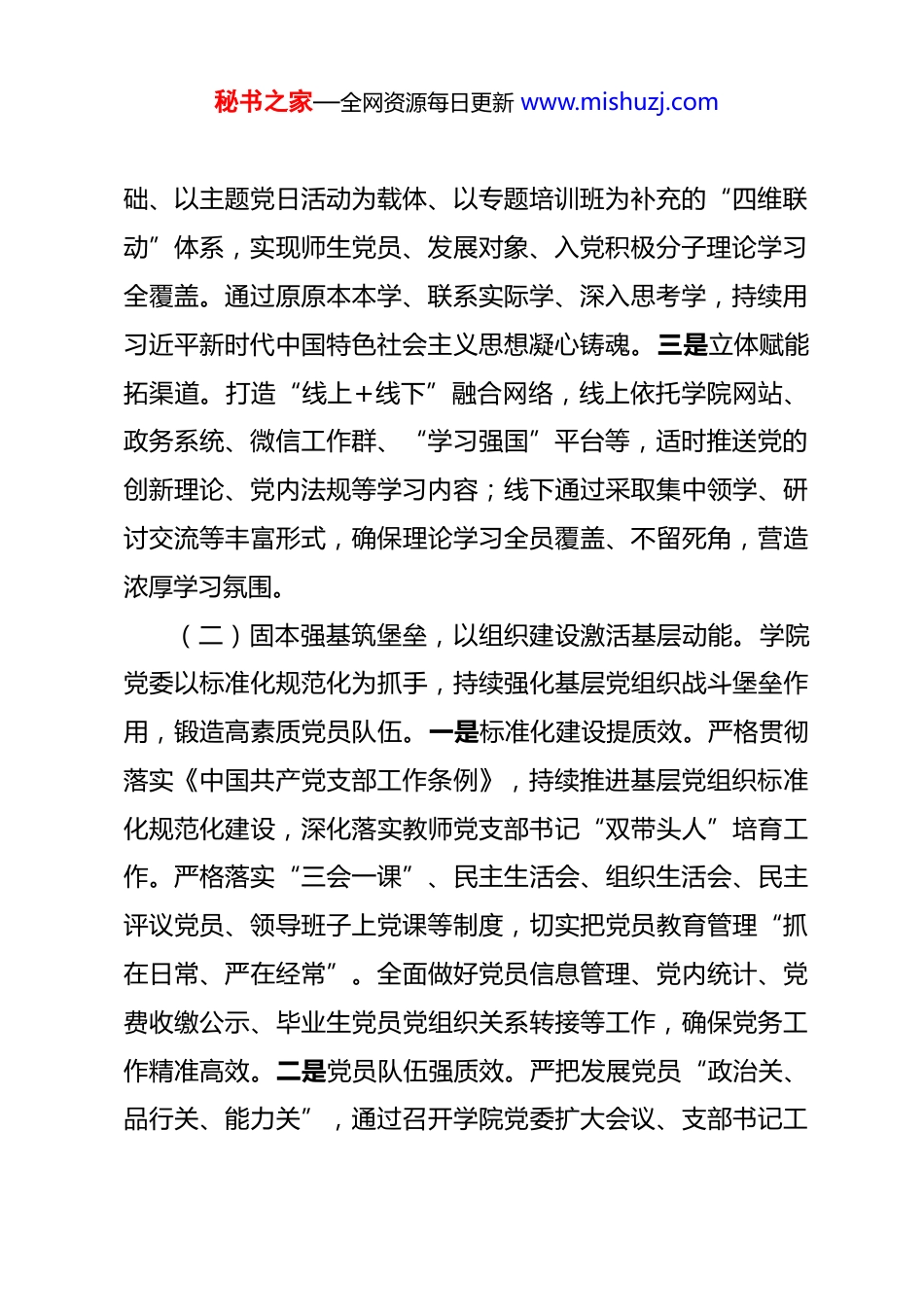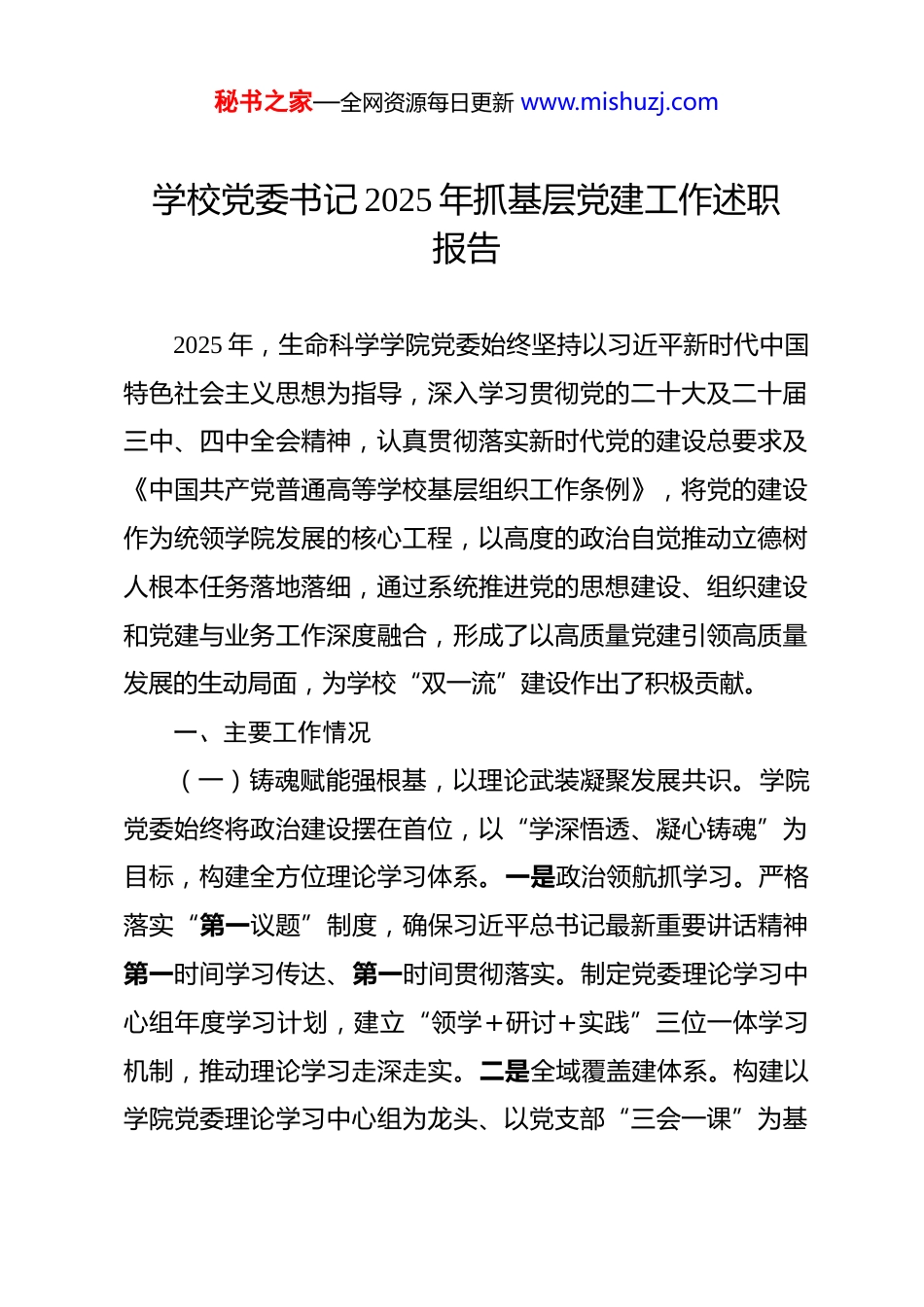 秘书之家—全网资源每日更新 www.mishuzj.com学校党委书记 2025 年抓基层党建工作述职报告 2025 年,生命科学学院党委始终坚持以习近平新时代中国特色社会主义思想为指导,深入学习贯彻党的二十大及二十届三中、四中全会精神,认真贯彻落实新时代党的建设总要求及《中国共产党普通高等学校基层组织工作条例》,将党的建设作为统领学院发展的核心工程,以高度的政治自觉推动立德树人根本任务落地落细,通过系统推进党的思想建设、组织建设和党建与业务工作深度融合,形成了以高质量党建引领高质量发展的生动局面,为学校“双一流”建设作出了积极贡献。一、主要工作情况(一)铸魂赋能强根基,以理论武装凝聚发展共识。学院党委始终将政治建设摆在首位,以“学深悟透、凝心铸魂”为目标,构建全方位理论学习体系。一是政治领航抓学习。严格落实“第一议题”制度,确保习近平总书记最新重要讲话精神第一时间学习传达、第一时间贯彻落实。制定党委理论学习中心组年度学习计划,建立“领学+研讨+实践”三位一体学习机制,推动理论学习走深走实。二是全域覆盖建体系。构建以学院党委理论学习中心组为龙头、以党支部“三会一课”为基秘书之家—全网资源每日更新 www.mishuzj.com础、以主题党日活动为载体、以专题培训班为补充的“四维联动”体系,实现师生党员、发展对象、入党积极分子理论学习全覆盖。通过原原本本学、联系实际学、深入思考学,持续用习近平新时代中国特色社会主义思想凝心铸魂。三是立体赋能拓渠道。打造“线上+线下”融合网络,线上依托学院网站、政务系统、微信工作群、“学习强国”平台等,适时推送党的创新理论、党内法规等学习内容;线下通过采取集中领学、研讨交流等丰富形式,确保理论学习全员覆盖、不留死角,营造浓厚学习氛围。(二)固本强基筑堡垒,以组织建设激活基层动能。学院党委以标准化规范化为抓手,持续强化基层党组织战斗堡垒作用,锻造高素质党员队伍。一是标准化建设提质效。严格贯彻落实《中国共产党支部工作条例》,持续推进基层党组织标准化规范化建设,深化落实教师党支部书记“双带头人”培育工作。严格落实“三会一课”、民主生活会、组织生活会、民主评议党员、领导班子上党课等制度,切实把党员教育管理“抓在日常、严在经常”。全面做好党员信息管理、党内统计、党费收缴公示、毕业生党员党组织关系转接等工作,确保党务工作精准高效。二是党员队伍强质效。严把发展党员“政治关、品行关、能力关”,通过召开学院党委扩大会议、支部书记工秘书之家—全网资源每日更新 www.mishuzj.com作会议,强调程序要规范,组织各支部开展自查与互查,确保发展工作环节规范透明可溯。采用“理论授课+个人自学+实践锻炼+结业考试”模式,全方位、多维度提升党员的理论水平与实践能力,夯实队伍基础。三是创先争优树标杆。深化“星级党支部”创建,培育创建三星级党支部 3 个、二星级党支部 5 个,形成“比学赶超”的良好态势。严格落实党支部书记抓党建述职评议考核制度,采用“现场述职+点评+评议”相结合的方式,实现党支部述职评议考核全覆盖,压实党建责任。四是典型培育作示范。大力推进党建品牌建设,持续深化建设成效。2025 年,学院获批校“三全育人”综合改革试点学院建设单位;生物科学系党支部入选第三批全省高校“双带头人”教师党支部书记工作室,树立全院党支部建设标杆。(三)正风肃纪扬正气,以严管厚爱营造优良生态。学院党委坚持严字当头,压实作风建设与思想政治工作责任,营造风清气正育人环境。压实党风廉政责任链。把严明党的政治纪律和政治规矩摆在首位,强化执纪监督,对“三重一大”事项,坚持“党政领导班子集体研究、共同决策”,不搞“一言堂”。严格落实“一岗双责”,推动党风廉政建设落地见效。强化纪委监督保公正。学院纪委全程监督审核制博士招生、硕士研究生录取、人才引进、干部选拔任用、年度考核、学生评奖评优秘书之家—全网资源每日更新 www.mishuzj.com等关键工作,确保“公开、公平、公正”,筑牢廉洁防线。守牢意识形态主阵地。坚持党管意识形态原则,定期研判意识形态领域风险和动态,加强...
