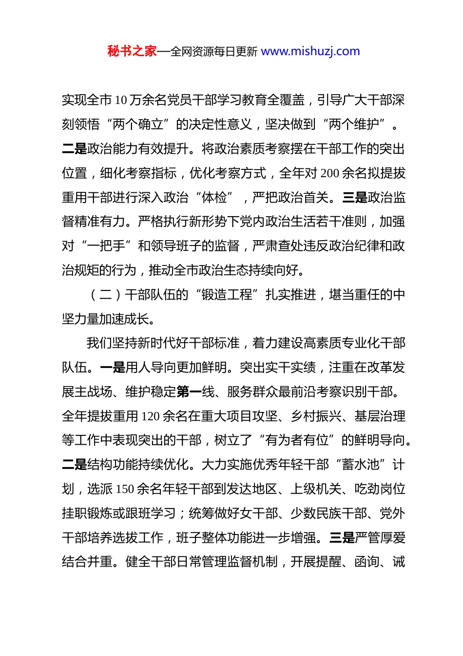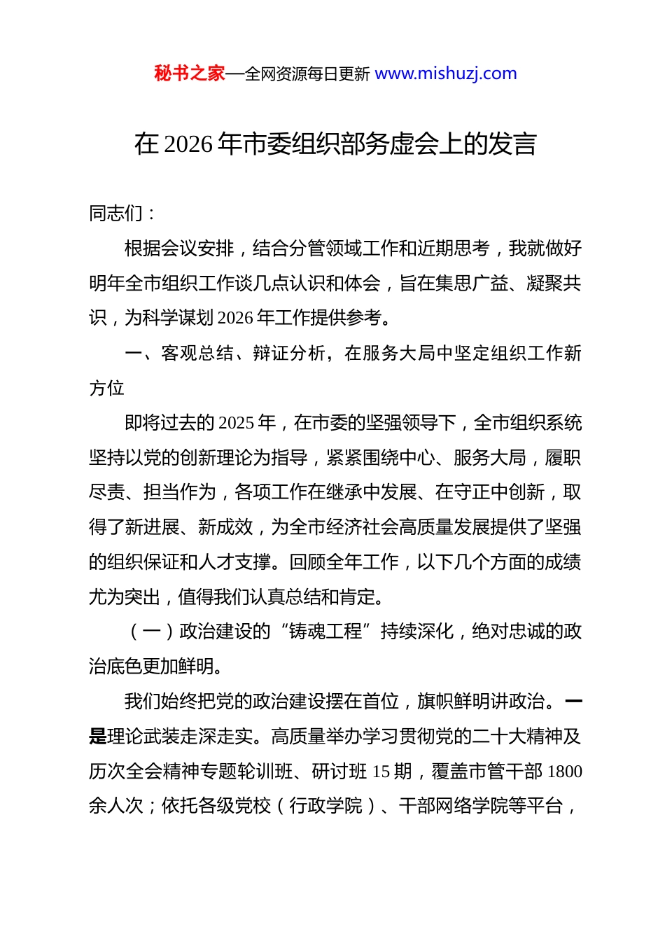 秘书之家—全网资源每日更新 www.mishuzj.com在 2026 年市委组织部务虚会上的发言 同志们:根据会议安排,结合分管领域工作和近期思考,我就做好明年全市组织工作谈几点认识和体会,旨在集思广益、凝聚共识,为科学谋划 2026 年工作提供参考。一、客观总结、辩证分析,在服务大局中坚定组织工作新方位即将过去的 2025 年,在市委的坚强领导下,全市组织系统坚持以党的创新理论为指导,紧紧围绕中心、服务大局,履职尽责、担当作为,各项工作在继承中发展、在守正中创新,取得了新进展、新成效,为全市经济社会高质量发展提供了坚强的组织保证和人才支撑。回顾全年工作,以下几个方面的成绩尤为突出,值得我们认真总结和肯定。(一)政治建设的“铸魂工程”持续深化,绝对忠诚的政治底色更加鲜明。我们始终把党的政治建设摆在首位,旗帜鲜明讲政治。一是理论武装走深走实。高质量举办学习贯彻党的二十大精神及历次全会精神专题轮训班、研讨班 15 期,覆盖市管干部 1800余人次;依托各级党校(行政学院)、干部网络学院等平台,秘书之家—全网资源每日更新 www.mishuzj.com实现全市 10 万余名党员干部学习教育全覆盖,引导广大干部深刻领悟“两个确立”的决定性意义,坚决做到“两个维护”。二是政治能力有效提升。将政治素质考察摆在干部工作的突出位置,细化考察指标,优化考察方式,全年对 200 余名拟提拔重用干部进行深入政治“体检”,严把政治首关。三是政治监督精准有力。严格执行新形势下党内政治生活若干准则,加强对“一把手”和领导班子的监督,严肃查处违反政治纪律和政治规矩的行为,推动全市政治生态持续向好。(二)干部队伍的“锻造工程”扎实推进,堪当重任的中坚力量加速成长。我们坚持新时代好干部标准,着力建设高素质专业化干部队伍。一是用人导向更加鲜明。突出实干实绩,注重在改革发展主战场、维护稳定第一线、服务群众最前沿考察识别干部。全年提拔重用 120 余名在重大项目攻坚、乡村振兴、基层治理等工作中表现突出的干部,树立了“有为者有位”的鲜明导向。二是结构功能持续优化。大力实施优秀年轻干部“蓄水池”计划,选派 150 余名年轻干部到发达地区、上级机关、吃劲岗位挂职锻炼或跟班学习;统筹做好女干部、少数民族干部、党外干部培养选拔工作,班子整体功能进一步增强。三是严管厚爱结合并重。健全干部日常管理监督机制,开展提醒、函询、诫秘书之家—全网资源每日更新 www.mishuzj.com勉 300 余人次;认真落实公务员职务与职级并行制度,稳妥推进事业单位管理岗位职员等级晋升工作,有效激发干部队伍活力。(三)人才强市的“聚智工程”成效初显,创新驱动的智力引擎更加强劲。我们深入实施人才优先发展战略,努力打造区域人才高地一是政策体系更加完善。迭代升级“XX 英才计划”及配套政策,在资金扶持、项目申报、住房保障、子女入学等方面推出更具竞争力的一揽子措施。全年新引进海内外高层次人才及团队 80 个,其中顶尖人才(团队)5 个。二是平台能级有效提升。推动与 3 所知名高校、科研院所共建产业技术研究院、联合实验室等创新平台;支持重点企业建设高水平研发中心,新增省级以上创新平台 8 个。三是服务生态持续优化。建成运行市级人才综合服务中心,推行人才服务“一窗受理、集成服务、一次办结”,人才满意度测评达到 98%以上。(四)基层党建的“强基工程”全面夯实,引领治理的战斗堡垒更加坚固。我们牢固树立大抓基层的鲜明导向,推动基层党组织全面进步、全面过硬。一是组织体系更加严密。优化农村、城市、机关、国企、学校、医院、“两新”组织等各领域党组织设置,秘书之家—全网资源每日更新 www.mishuzj.com党的组织和工作覆盖质量持续提升。新成立行业党委 2 个,新建“两新”党组织 50 个。二是带头人队伍建强培优。圆满完成村(社区)“两委”换届“回头看”,调整不胜任不尽职党组织书记 15 名;实施“头雁领航”计划,分级分类培训基层党组织书记 5000 余人次。三是引领作用充分发挥。深化党建引领乡村振兴,全市村级集体经济总收入突破 5 亿元,平均每村达到55 万元。深...