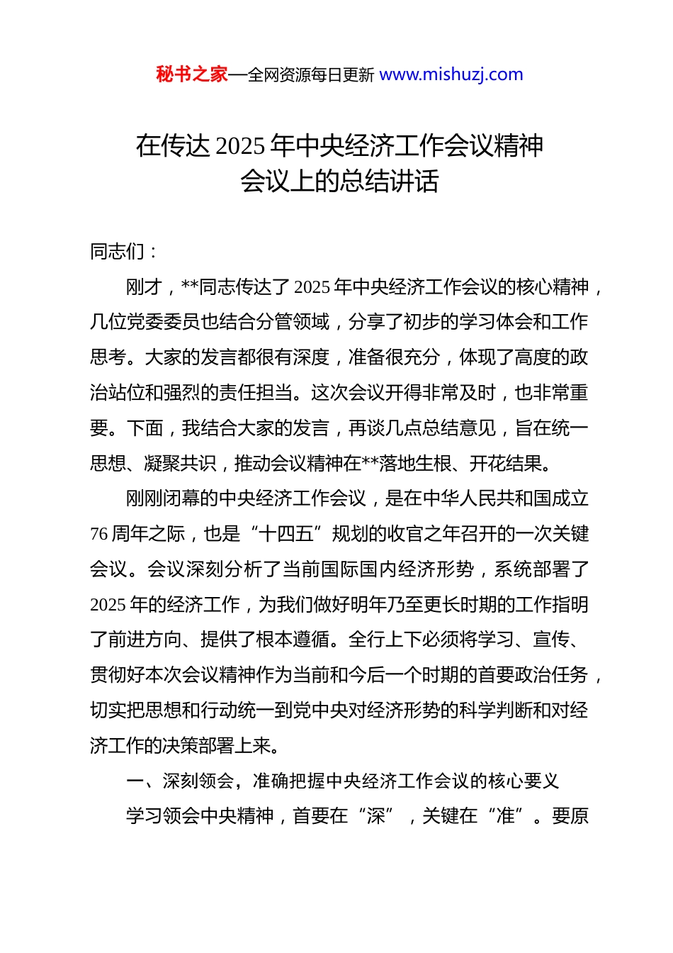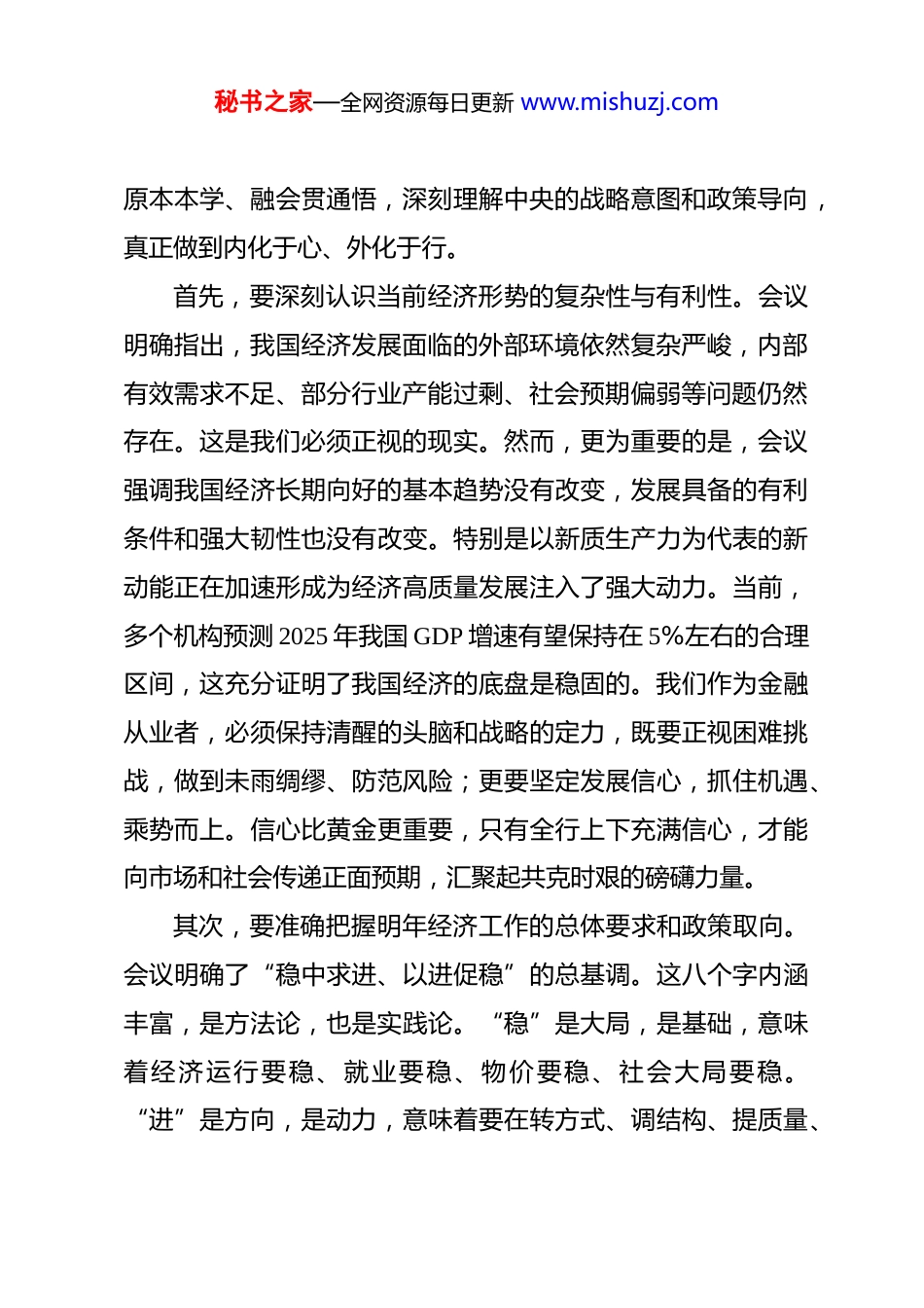 秘书之家—全网资源每日更新 www.mishuzj.com在传达 2025 年中央经济工作会议精神会议上的总结讲话 同志们:刚才,**同志传达了 2025 年中央经济工作会议的核心精神,几位党委委员也结合分管领域,分享了初步的学习体会和工作思考。大家的发言都很有深度,准备很充分,体现了高度的政治站位和强烈的责任担当。这次会议开得非常及时,也非常重要。下面,我结合大家的发言,再谈几点总结意见,旨在统一思想、凝聚共识,推动会议精神在**落地生根、开花结果。刚刚闭幕的中央经济工作会议,是在中华人民共和国成立76 周年之际,也是“十四五”规划的收官之年召开的一次关键会议。会议深刻分析了当前国际国内经济形势,系统部署了2025 年的经济工作,为我们做好明年乃至更长时期的工作指明了前进方向、提供了根本遵循。全行上下必须将学习、宣传、贯彻好本次会议精神作为当前和今后一个时期的首要政治任务,切实把思想和行动统一到党中央对经济形势的科学判断和对经济工作的决策部署上来。一、深刻领会,准确把握中央经济工作会议的核心要义学习领会中央精神,首要在“深”,关键在“准”。要原秘书之家—全网资源每日更新 www.mishuzj.com原本本学、融会贯通悟,深刻理解中央的战略意图和政策导向,真正做到内化于心、外化于行。首先,要深刻认识当前经济形势的复杂性与有利性。会议明确指出,我国经济发展面临的外部环境依然复杂严峻,内部有效需求不足、部分行业产能过剩、社会预期偏弱等问题仍然存在。这是我们必须正视的现实。然而,更为重要的是,会议强调我国经济长期向好的基本趋势没有改变,发展具备的有利条件和强大韧性也没有改变。特别是以新质生产力为代表的新动能正在加速形成为经济高质量发展注入了强大动力。当前,多个机构预测 2025 年我国 GDP 增速有望保持在 5%左右的合理区间,这充分证明了我国经济的底盘是稳固的。我们作为金融从业者,必须保持清醒的头脑和战略的定力,既要正视困难挑战,做到未雨绸缪、防范风险;更要坚定发展信心,抓住机遇、乘势而上。信心比黄金更重要,只有全行上下充满信心,才能向市场和社会传递正面预期,汇聚起共克时艰的磅礴力量。其次,要准确把握明年经济工作的总体要求和政策取向。会议明确了“稳中求进、以进促稳”的总基调。这八个字内涵丰富,是方法论,也是实践论。“稳”是大局,是基础,意味着经济运行要稳、就业要稳、物价要稳、社会大局要稳。“进”是方向,是动力,意味着要在转方式、调结构、提质量、秘书之家—全网资源每日更新 www.mishuzj.com增效益上积极进取。会议部署了“更加积极有为”的财政政策和“适度宽松”的货币政策。“更加积极有为”的财政政策,意味着要保持必要的支出强度,优化支出结构,重点支持民生、消费和关键基础设施建设。“适度宽松”的货币政策,则预示着降准降息等工具将灵活运用,旨在引导金融资源更有效地流向实体经济的重点领域和薄弱环节,如科技创新、中小微企业等。作为金融机构,我们必须深刻理解这一宏观政策组合的意图,主动调整我们的信贷政策和资产负债结构,确保与国家宏观调控同频共振,既要防止信贷“大水漫灌”,也要避免“惜贷惧贷”,真正做到精准滴灌、靶向支持。最后,要牢牢抓住明年经济工作的重点任务和战略部署。会议围绕推动高质量发展,部署了九项重点任务,其中,扩大内需、发展新质生产力、深化改革开放、防范化解风险是重中之重。将扩大内需作为首要任务,凸显了中央激活国内超大规模市场潜力的决心。大力推动以旧换新、发展服务消费和数字消费等新场景,将为金融服务提供广阔舞台。大力推进现代化产业体系建设,加快发展新质生产力,特别提到了人工智能、低空经济、商业航天等前沿领域这为我们的金融创新指明了主攻方向。同时,会议再次强调统筹发展和安全,要求有力有序有效防范化解重点领域风险。这既是对金融工作的要求,更是秘书之家—全网资源每日更新 www.mishuzj.com对金融机构的保护。我们必须把风险防控贯穿于业务发展的全过程,坚决守住不发生系统性金融风险的底线。二、对标看齐,明确服务国家战略的实践路径学习的目的全在于运用。...