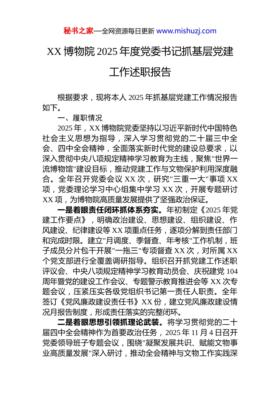 秘书之家—全网资源每日更新 www.mishuzj.comXX 博物院 2025 年度党委书记抓基层党建工作述职报告根据要求,现将本人 2025 年抓基层党建工作情况报告如下。一、履职情况2025 年,XX 博物院党委坚持以习近平新时代中国特色社会主义思想为指导,深入学习贯彻党的二十届三中全会、四中全会精神,全面落实新时代党的建设总要求,以深入贯彻中央八项规定精神学习教育为主线,聚焦"世界一流博物馆"建设目标,推动党建工作与文物保护利用深度融合。全年召开党委会议 XX 次,研究"三重一大"事项 XX项,党委理论学习中心组集中学习 XX 次,开展专题研讨XX 项,为博物院高质量发展提供了坚强政治保证。一是着眼责任闭环抓体系夯实。年初制定《2025 年党建工作要点》,明确政治建设、思想建设、组织建设、作风建设、纪律建设等 XX 项重点任务,逐项分解到责任部门和完成时限。建立"月调度、季督查、年考核"工作机制,班子成员分片包干开展"一拖三"专项督查 XX 次,对所属 XX个党支部进行全覆盖调研指导。组织召开抓党建工作述职评议会、中央八项规定精神学习教育动员会、庆祝建党 104周年暨党的建设工作会议、专题警示教育推进会等 XX 次专题会议,压紧压实各级党组织书记第一责任人职责。全年签订《党风廉政建设责任书》XX 份,建立党风廉政建设情况月报告制度,形成责任落实的完整闭环。二是着眼思想引领抓理论武装。将学习贯彻党的二十届四中全会精神作为首要政治任务,2025 年 11 月 4 日召开党委领导班子专题会议,围绕"凝聚发展共识、赋能文物事业高质量发展"深入研讨,推动全会精神与文物工作实践深秘书之家—全网资源每日更新 www.mishuzj.com度融合。党委理论学习中心组带头跟进学习习近平总书记重要讲话和指示批示精神,全年落实集中学习 XX 次,学习研讨内容 XX 项。分级分类组织党员教育培训,覆盖党员XX 人次,为全体党员配发学习资料 XX 册。依托"学习强国"平台、AAA 公众号、院内宣传栏等载体,推送党建信息XX 余篇,在人民日报等主流媒体发稿 XX 篇,构建线上线下融合的学习矩阵。巩固拓展党纪学习教育成果,开展"以案促改"专题警示教育,组织观看警示教育片 XX 场次,受教育党员干部达 XX 人次。三是着眼组织过硬抓基础提质。深化党支部标准化建设,对照"八个方面"标准完成对 XX 个党支部的考核验收,动态优化调整党组织设置,确保应建尽建。严格执行"三会一课"、组织生活会、民主评议党员等制度,党委委员以普通党员身份参加支部活动 XX 次,讲党课 XX 场次。实施"支部提升"行动,组织《中国共产党支部工作条例》专题培训,对党支部书记和党务干部进行全员轮训,培训 XX 余人。创新党建活动载体,开展"追寻红色足迹,传承革命精神"主题党日,组织党员赴延安等红色教育基地开展革命传统教育。设立"党员先锋队"XX 支、"党员示范岗"XX 个,在二号坑保护展示大厅改造、陶制文物库房基础设施改造等重点项目中发挥攻坚作用。四是着眼融合发展抓服务中心。坚持党建引领业务,将党的领导贯穿博物院工作全过程。2025 年预算明确推进馆陵路连接项目、供电工程、景观提升工程等 XX 项重点基建项目,总投资 XX 亿元,目前已完成 XX 项。深化"党建+业务"融合,创建"文博先锋"党建品牌,围绕文物保护、陈列展览、社会教育、安全保障等核心业务,设立 XX 个党员责任区。全年接待观众突破 XX 万人次,同比增长 XX%;完成考古发掘面积 XX 平方米,新出土文物 XX 件(组);举办专题展览 XX 个,开发文创产品 XX 款,实现营业收入 XX 亿元。在服务群众方面,开展"博物馆进校园"活动 XX 场次,秘书之家—全网资源每日更新 www.mishuzj.com覆盖学生 XX 万人次;线上教育视频播放量达 XX 万次,公众满意度达 95%以上。五是着眼正风肃纪抓作风转变。深入贯彻中央八项规定精神学习教育,开展为期 XX 个月的专项整治,围绕办公用房、公务用车、公务接待等 XX 个方面进行自查自纠,发现问题 XX 项,已全部整改到位。紧盯重要节点开展监督检查,组织作风排查 XX 次,查处形式主义、官僚主义问题XX 起。邀请...