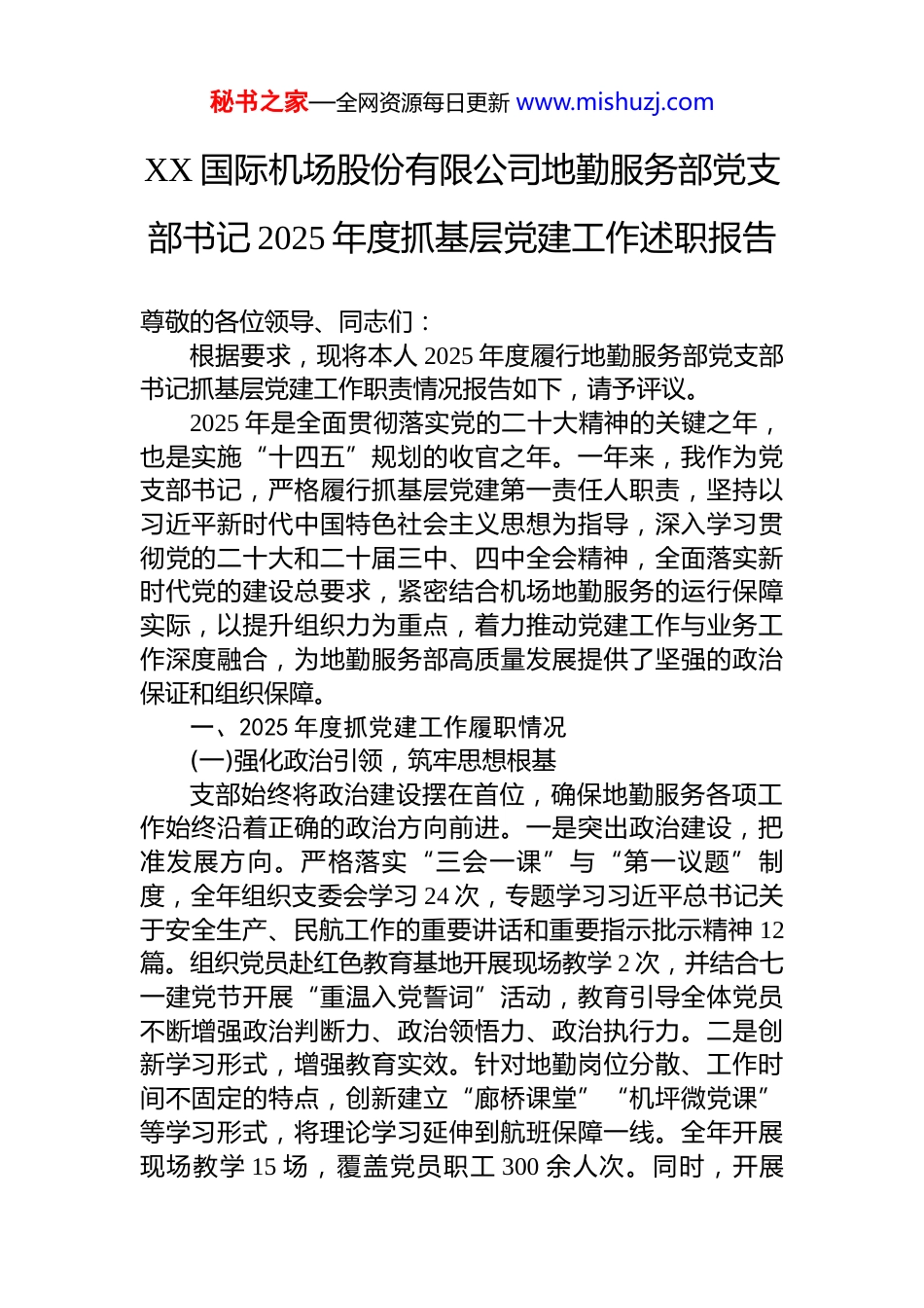 秘书之家—全网资源每日更新 www.mishuzj.comXX 国际机场股份有限公司地勤服务部党支部书记 2025 年度抓基层党建工作述职报告尊敬的各位领导、同志们:根据要求,现将本人 2025 年度履行地勤服务部党支部书记抓基层党建工作职责情况报告如下,请予评议。2025 年是全面贯彻落实党的二十大精神的关键之年,也是实施“十四五”规划的收官之年。一年来,我作为党支部书记,严格履行抓基层党建第一责任人职责,坚持以习近平新时代中国特色社会主义思想为指导,深入学习贯彻党的二十大和二十届三中、四中全会精神,全面落实新时代党的建设总要求,紧密结合机场地勤服务的运行保障实际,以提升组织力为重点,着力推动党建工作与业务工作深度融合,为地勤服务部高质量发展提供了坚强的政治保证和组织保障。一、2025 年度抓党建工作履职情况(一)强化政治引领,筑牢思想根基支部始终将政治建设摆在首位,确保地勤服务各项工作始终沿着正确的政治方向前进。一是突出政治建设,把准发展方向。严格落实“三会一课”与“第一议题”制度,全年组织支委会学习 24 次,专题学习习近平总书记关于安全生产、民航工作的重要讲话和重要指示批示精神 12篇。组织党员赴红色教育基地开展现场教学 2 次,并结合七一建党节开展“重温入党誓词”活动,教育引导全体党员不断增强政治判断力、政治领悟力、政治执行力。二是创新学习形式,增强教育实效。针对地勤岗位分散、工作时间不固定的特点,创新建立“廊桥课堂”“机坪微党课”等学习形式,将理论学习延伸到航班保障一线。全年开展现场教学 15 场,覆盖党员职工 300 余人次。同时,开展秘书之家—全网资源每日更新 www.mishuzj.com“岗位标兵讲理论”活动 10 次,组织政治理论线上测试 4次,全体党员合格率 100%,优秀率达到 95%。三是丰富教育载体,筑牢思想根基。制作并下发《地勤服务部理论学习手册》4 期,利用部门工作微信群开设“指尖微课堂”50期,累计推送学习资料 300 余篇。通过一系列举措,确保党的创新理论在地勤服务部入脑入心,为安全生产和服务保障工作把准了政治方向。(二)夯实组织基础,建强战斗堡垒支部着力优化组织设置,严格党员管理,建强一线战斗堡垒。一是将党小组建在航班保障关键节点上,实现党组织对行李分拣、站坪服务、客舱保障等所有一线班组的全覆盖。年内圆满完成支部换届选举,新一届支委中一线技术骨干占比达到 60%,平均年龄 35 岁,本科以上学历占比 80%,班子结构得到显著优化。二是严格党员管理,发挥模范作用。严格党员发展程序,重点从航班保障一线技术骨干中发展党员 4 名,培养入党积极分子 12 名。全面推行“党员先锋指数”考评,实施党员积分管理,设立党员责任区 15 个,党员示范岗 20 个,实现了关键岗位党员全覆盖,有效激励了党员在急难险重任务中发挥先锋模范作用。三是加强阵地建设,提升组织活力。全年召开党员大会 4 次、支委会 24 次、党小组会 48 次,高质量开展主题党日活动 12 次。支部成功获评集团“五星级党支部”荣誉称号,2 名党员获评公司“服务标兵”称号。同时,升级改造了党员活动室,购置学习书籍 300 余册,不断完善硬件设施,提升了组织生活质量。(三)深化党建融合,促进安全运行支部坚持围绕中心抓党建、抓好党建促业务,将党建工作深度融入安全生产和服务保障全过程。一是创新融合机制,增强发展动能。建立“党建+安全生产”双融机制,将党建工作要求嵌入地勤服务保障流程,制定融合任务清单 30 项。组织开展“安全生产党旗红”活动,成立党员技秘书之家—全网资源每日更新 www.mishuzj.com术攻关小组 3 个,围绕行李高效精准分拣、特种设备操作规范等课题,成功解决生产技术难题 8 项,有效降低了行李破损率和差错率。二是搭建活动平台,促进服务提升。深入开展“我为服务献一策”金点子征集活动,收集到关于优化登机流程、提升旅客中转体验等意见建议 45 条,采纳实施 28 条,旅客满意度显著提升。实施“党员带徒”计划,25 名党员业务骨干与青年员工结成师徒对子,成功培养技术能手 18 名,为地勤服务队伍储备了后...