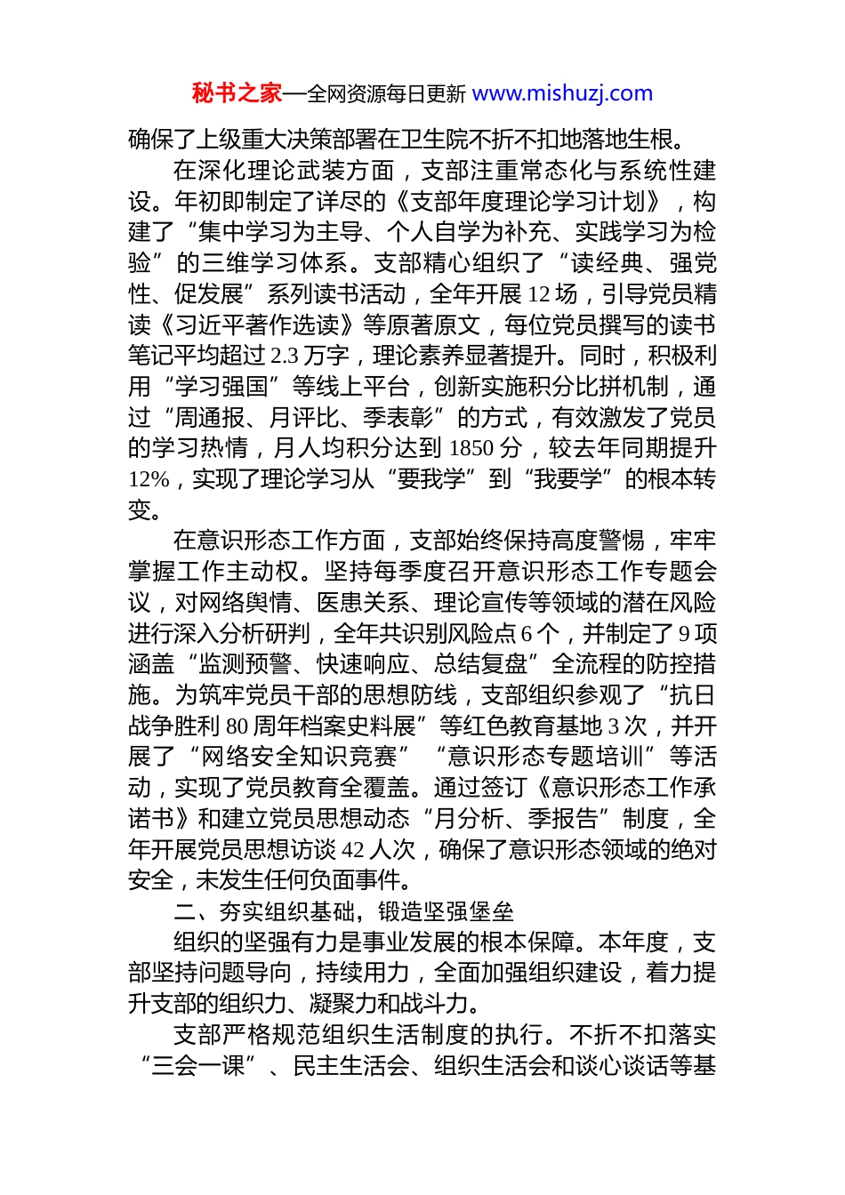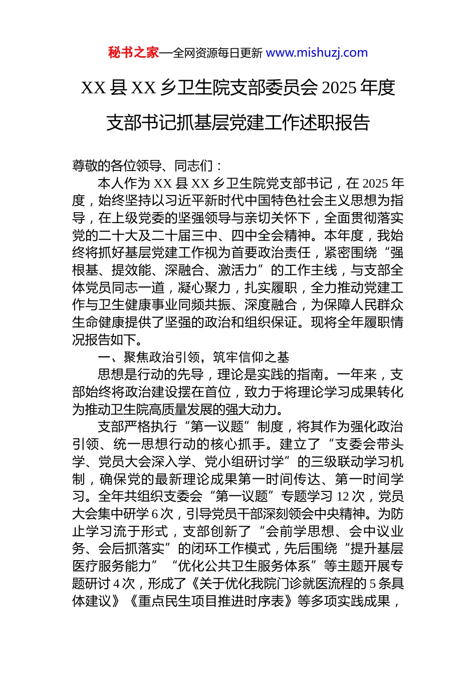 秘书之家—全网资源每日更新 www.mishuzj.comXX 县 XX 乡卫生院支部委员会 2025 年度支部书记抓基层党建工作述职报告尊敬的各位领导、同志们:本人作为 XX 县 XX 乡卫生院党支部书记,在 2025 年度,始终坚持以习近平新时代中国特色社会主义思想为指导,在上级党委的坚强领导与亲切关怀下,全面贯彻落实党的二十大及二十届三中、四中全会精神。本年度,我始终将抓好基层党建工作视为首要政治责任,紧密围绕“强根基、提效能、深融合、激活力”的工作主线,与支部全体党员同志一道,凝心聚力,扎实履职,全力推动党建工作与卫生健康事业同频共振、深度融合,为保障人民群众生命健康提供了坚强的政治和组织保证。现将全年履职情况报告如下。一、聚焦政治引领,筑牢信仰之基思想是行动的先导,理论是实践的指南。一年来,支部始终将政治建设摆在首位,致力于将理论学习成果转化为推动卫生院高质量发展的强大动力。支部严格执行“第一议题”制度,将其作为强化政治引领、统一思想行动的核心抓手。建立了“支委会带头学、党员大会深入学、党小组研讨学”的三级联动学习机制,确保党的最新理论成果第一时间传达、第一时间学习。全年共组织支委会“第一议题”专题学习 12 次,党员大会集中研学 6 次,引导党员干部深刻领会中央精神。为防止学习流于形式,支部创新了“会前学思想、会中议业务、会后抓落实”的闭环工作模式,先后围绕“提升基层医疗服务能力”“优化公共卫生服务体系”等主题开展专题研讨 4 次,形成了《关于优化我院门诊就医流程的 5 条具体建议》《重点民生项目推进时序表》等多项实践成果,秘书之家—全网资源每日更新 www.mishuzj.com确保了上级重大决策部署在卫生院不折不扣地落地生根。在深化理论武装方面,支部注重常态化与系统性建设。年初即制定了详尽的《支部年度理论学习计划》,构建了“集中学习为主导、个人自学为补充、实践学习为检验”的三维学习体系。支部精心组织了“读经典、强党性、促发展”系列读书活动,全年开展 12 场,引导党员精读《习近平著作选读》等原著原文,每位党员撰写的读书笔记平均超过 2.3 万字,理论素养显著提升。同时,积极利用“学习强国”等线上平台,创新实施积分比拼机制,通过“周通报、月评比、季表彰”的方式,有效激发了党员的学习热情,月人均积分达到 1850 分,较去年同期提升12%,实现了理论学习从“要我学”到“我要学”的根本转变。在意识形态工作方面,支部始终保持高度警惕,牢牢掌握工作主动权。坚持每季度召开意识形态工作专题会议,对网络舆情、医患关系、理论宣传等领域的潜在风险进行深入分析研判,全年共识别风险点 6 个,并制定了 9 项涵盖“监测预警、快速响应、总结复盘”全流程的防控措施。为筑牢党员干部的思想防线,支部组织参观了“抗日战争胜利 80 周年档案史料展”等红色教育基地 3 次,并开展了“网络安全知识竞赛”“意识形态专题培训”等活动,实现了党员教育全覆盖。通过签订《意识形态工作承诺书》和建立党员思想动态“月分析、季报告”制度,全年开展党员思想访谈 42 人次,确保了意识形态领域的绝对安全,未发生任何负面事件。二、夯实组织基础,锻造坚强堡垒组织的坚强有力是事业发展的根本保障。本年度,支部坚持问题导向,持续用力,全面加强组织建设,着力提升支部的组织力、凝聚力和战斗力。支部严格规范组织生活制度的执行。不折不扣落实“三会一课”、民主生活会、组织生活会和谈心谈话等基秘书之家—全网资源每日更新 www.mishuzj.com本制度,全年共召开支委会 12 次、党员大会 8 次,开展主题党日活动 12 次。为提升组织生活的吸引力和实效性,支部积极创新形式,着力打造“实景党课”品牌,组织党员赴革命纪念馆开展“重走初心路”沉浸式教学,并录制了《红色足迹中的初心》微党课视频 2 部,反响热烈。同时,开展“业务骨干上讲台”活动,将“传染病防控流程优化”“基本公共卫生服务政策解读”等业务知识融入组织生活,党员参与率由过去的 82%提升至 95%。作为支部书记,我带头讲授党课 4 次,班子成员均以普通党员身份参加双重...