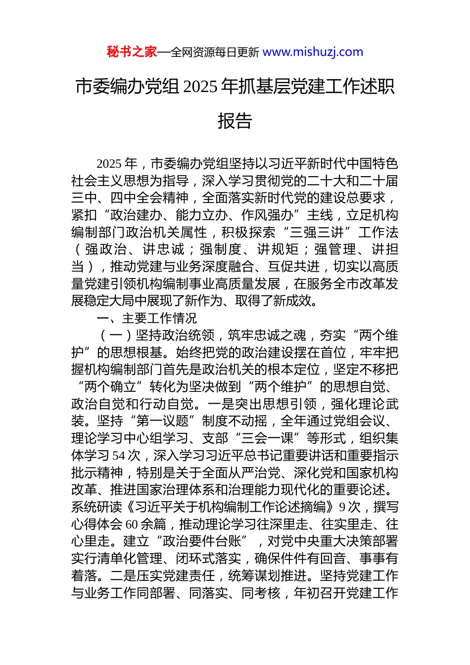 秘书之家—全网资源每日更新 www.mishuzj.com市委编办党组 2025 年抓基层党建工作述职报告2025 年,市委编办党组坚持以习近平新时代中国特色社会主义思想为指导,深入学习贯彻党的二十大和二十届三中、四中全会精神,全面落实新时代党的建设总要求,紧扣“政治建办、能力立办、作风强办”主线,立足机构编制部门政治机关属性,积极探索“三强三讲”工作法(强政治、讲忠诚;强制度、讲规矩;强管理、讲担当),推动党建与业务深度融合、互促共进,切实以高质量党建引领机构编制事业高质量发展,在服务全市改革发展稳定大局中展现了新作为、取得了新成效。一、主要工作情况(一)坚持政治统领,筑牢忠诚之魂,夯实“两个维护”的思想根基。始终把党的政治建设摆在首位,牢牢把握机构编制部门首先是政治机关的根本定位,坚定不移把“两个确立”转化为坚决做到“两个维护”的思想自觉、政治自觉和行动自觉。一是突出思想引领,强化理论武装。坚持“第一议题”制度不动摇,全年通过党组会议、理论学习中心组学习、支部“三会一课”等形式,组织集体学习 54 次,深入学习习近平总书记重要讲话和重要指示批示精神,特别是关于全面从严治党、深化党和国家机构改革、推进国家治理体系和治理能力现代化的重要论述。系统研读《习近平关于机构编制工作论述摘编》9 次,撰写心得体会 60 余篇,推动理论学习往深里走、往实里走、往心里走。建立“政治要件台账”,对党中央重大决策部署实行清单化管理、闭环式落实,确保件件有回音、事事有着落。二是压实党建责任,统筹谋划推进。坚持党建工作与业务工作同部署、同落实、同考核,年初召开党建工作秘书之家—全网资源每日更新 www.mishuzj.com专题会议 2 次,研究制定《市委编办 2025 年党建工作要点》《落实全面从严治党主体责任清单》,明确领导班子成员“一岗双责”任务分工,形成主要领导亲自抓、分管领导具体抓、各科室协同配合的工作格局。将党建工作纳入年度绩效考核体系,实行月调度、季通报、年考评机制,切实增强党员干部的政治责任感和履职主动性。三是注重学用结合,推动成果转化。坚持问题导向和实践导向,围绕贯彻落实中央关于优化基层管理体制、完善乡镇职责体系等重大改革任务,组织党员干部开展专题研讨 8次,提出对策建议 23 条。在推进县镇管理体制改革过程中,主动对标中央精神和省委部署,结合本地实际起草实施方案,确保改革方向不偏、政策落地见效。通过加强党的创新理论指导,有效破解了部分领域职能交叉、权责不清、运行不畅等难题,实现了党建引领下的制度创新和服务效能提升。(二)健全制度机制,严明纪律规矩,落实全面从严治党政治责任。坚持把制度建设贯穿于管党治党全过程,持续推进作风建设常态化长效化,着力营造风清气正、干事创业的良好政治生态。一是深化纪律教育,筑牢思想防线。扎实开展纪律规定精神再学习再教育活动,制定专项工作方案,细化学习安排、查摆问题、整改落实三个阶段任务。组织观看警示教育片 4 场,参观廉政教育基地 2 次,开展“以案说纪”专题讨论 3 次,引导党员干部知敬畏、存戒惧、守底线。针对巡察反馈指出的“支委会研究组织生活不够规范”“学习交流流于形式”等问题,逐项制定整改措施,明确整改时限和责任人,目前已全部完成整改并形成长效机制。二是完善议事规则,规范权力运行。修订《市委编办室务会会议议事规则》,进一步明确议事范围、决策程序和监督机制,严格执行“三重一大”事项集体研究制度,全年共审议重大事项 47 项,均做到依法依规、公开透明。加强对机构编制审批权限的监督管理,梳秘书之家—全网资源每日更新 www.mishuzj.com理近年来出台的政策法规 32 项,汇编成册发送至市直各部门主要负责人参阅,明确其在机构设置、编制使用等方面的职责边界,防止越权决策、违规操作。三是强化日常监督,提升管理效能。发挥支部纪检委员作用,构建“定期检查+随机抽查+重要节点督查”三位一体监督模式,全年开展考勤纪律、工作作风专项检查 12 次,发现并纠正迟到早退、工作拖沓等问题 15 个。印发《关于严肃机构编制纪律的通知》《关于...