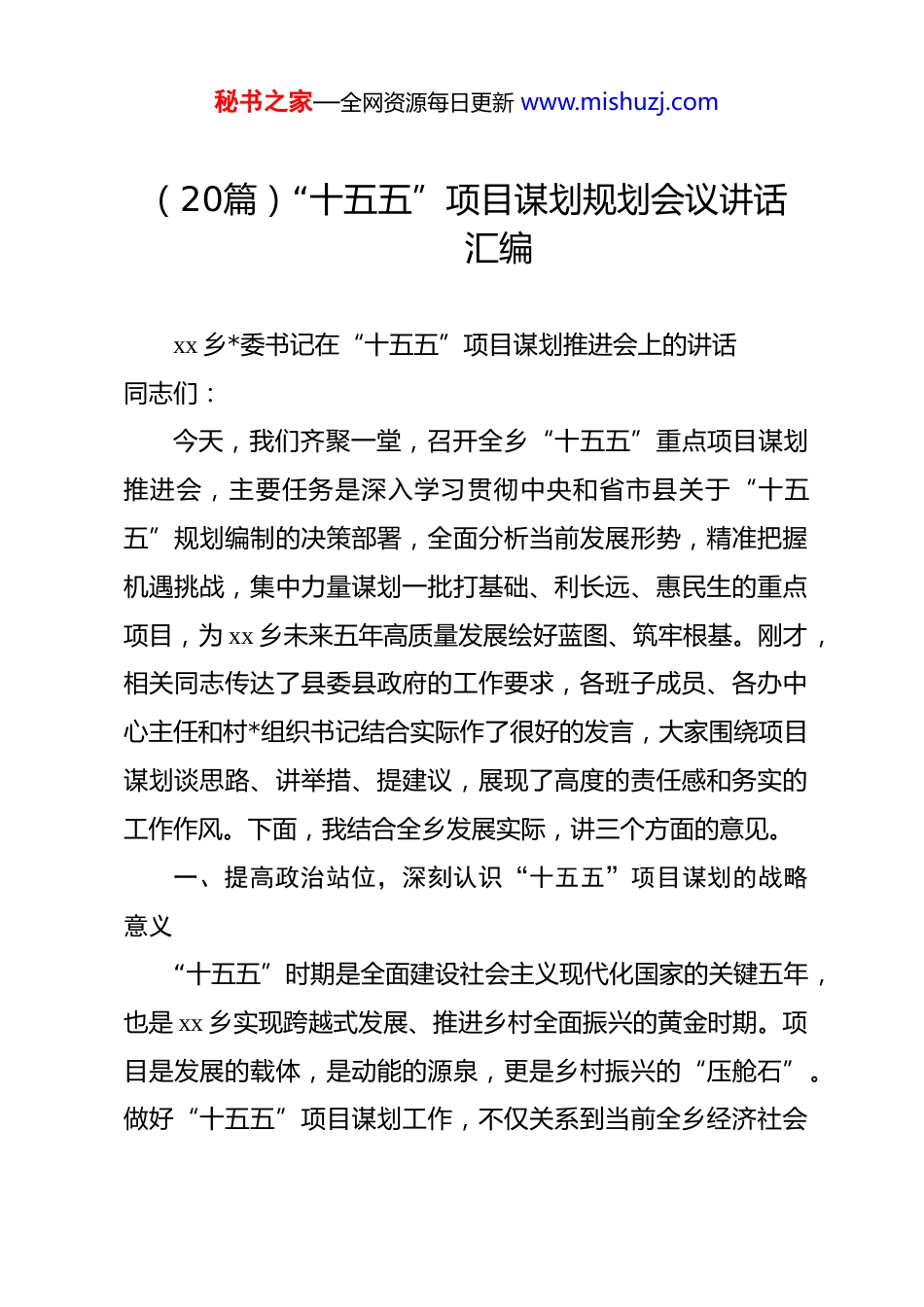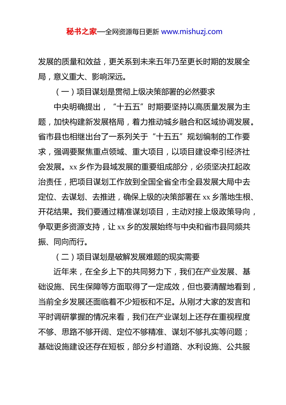秘书之家—全网资源每日更新 www.mishuzj.com(20篇)“十五五”项目谋划规划会议讲话汇编xx 乡*委书记在“十五五”项目谋划推进会上的讲话同志们:今天,我们齐聚一堂,召开全乡“十五五”重点项目谋划推进会,主要任务是深入学习贯彻中央和省市县关于“十五五”规划编制的决策部署,全面分析当前发展形势,精准把握机遇挑战,集中力量谋划一批打基础、利长远、惠民生的重点项目,为 xx 乡未来五年高质量发展绘好蓝图、筑牢根基。刚才,相关同志传达了县委县政府的工作要求,各班子成员、各办中心主任和村*组织书记结合实际作了很好的发言,大家围绕项目谋划谈思路、讲举措、提建议,展现了高度的责任感和务实的工作作风。下面,我结合全乡发展实际,讲三个方面的意见。一、提高政治站位,深刻认识“十五五”项目谋划的战略意义“十五五”时期是全面建设社会主义现代化国家的关键五年,也是 xx 乡实现跨越式发展、推进乡村全面振兴的黄金时期。项目是发展的载体,是动能的源泉,更是乡村振兴的“压舱石”。做好“十五五”项目谋划工作,不仅关系到当前全乡经济社会秘书之家—全网资源每日更新 www.mishuzj.com发展的质量和效益,更关系到未来五年乃至更长时期的发展全局,意义重大、影响深远。(一)项目谋划是贯彻上级决策部署的必然要求中央明确提出,“十五五”时期要坚持以高质量发展为主题,加快构建新发展格局,着力推动城乡融合和区域协调发展。省市县也相继出台了一系列关于“十五五”规划编制的工作要求,强调要聚焦重点领域、重大项目,以项目建设牵引经济社会发展。xx 乡作为县域发展的重要组成部分,必须坚决扛起政治责任,把项目谋划工作放到全国全省全市全县发展大局中去定位、去谋划、去推进,确保上级的决策部署在 xx 乡落地生根、开花结果。我们要通过精准谋划项目,主动对接上级政策导向,争取更多资源支持,让 xx 乡的发展始终与中央和省市县同频共振、同向而行。(二)项目谋划是破解发展难题的现实需要近年来,在全乡上下的共同努力下,我们在产业发展、基础设施、民生保障等方面取得了一定成效,但也要清醒地看到,当前全乡发展还面临着不少短板和不足。从刚才大家的发言和平时调研掌握的情况来看,我们在产业谋划上还存在重视程度不够、思路不够开阔、定位不够精准、谋划不够扎实等问题;基础设施建设还存在短板,部分乡村道路、水利设施、公共服秘书之家—全网资源每日更新 www.mishuzj.com务设施还不能满足群众日益增长的需求;产业结构还不够优化,一二三产融合发展水平不高,产业链条短、附加值低的问题较为突出;生态保护与经济发展的统筹协调还需要进一步加强。破解这些难题,根本出路在于项目建设。只有通过谋划实施一批高质量项目,才能补齐发展短板、增强发展后劲,推动全乡发展提质增效。(三)项目谋划是实现乡村全面振兴的关键支撑乡村全面振兴,产业振兴是核心,人才振兴是支撑,文化振兴是灵魂,生态振兴是底色,组织振兴是保障。这五个方面的振兴,都需要项目来承载和推动。没有项目的支撑,产业振兴就是空中楼阁,基础设施改善就无从谈起,民生福祉提升就缺乏保障。比如,我们要实现产业振兴,就需要谋划建设一批特色产业项目,培育壮大主导产业,带动群众增收致富;要实现生态振兴,就需要谋划实施一批生态治理、环境整治项目,改善农村人居环境;要实现民生振兴,就需要谋划建设一批教育、医疗、养老等公共服务项目,提升群众的幸福感和获得感。可以说,项目谋划的质量,直接决定了乡村全面振兴的成色和进度。我们必须把项目谋划作为推进乡村全面振兴的重中之重,以项目建设带动各项工作取得新突破。(四)项目谋划是抢抓发展机遇的重要举措秘书之家—全网资源每日更新 www.mishuzj.com当前,我们正面临着多重发展机遇。从政策层面看,中央持续加大对“三农”工作的支持力度,出台了一系列强农惠农富农政策,为我们争取项目资金提供了有利条件;从市场层面看,随着人们生活水平的提高,对优质农产品、乡村旅游产品的需求日益增长,为我们发展特色产业、乡村旅游提供了广阔市场;从区域发展层面看,县域经济的快速发展,为...