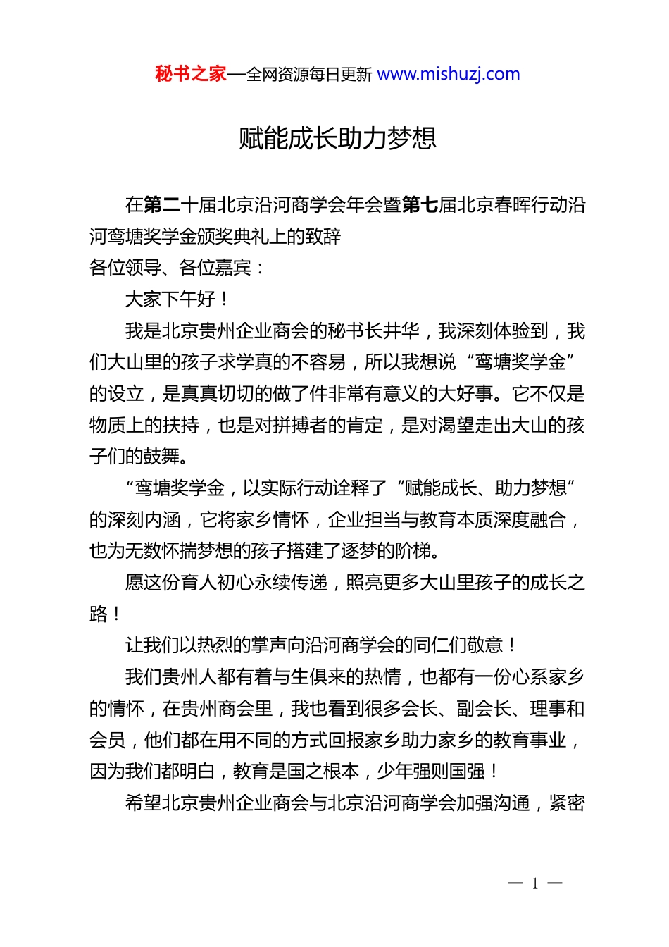 秘书之家—全网资源每日更新 www.mishuzj.com赋能成长助力梦想在第二十届北京沿河商学会年会暨第七届北京春晖行动沿河鸾塘奖学金颁奖典礼上的致辞各位领导、各位嘉宾:大家下午好!我是北京贵州企业商会的秘书长井华,我深刻体验到,我们大山里的孩子求学真的不容易,所以我想说“鸾塘奖学金”的设立,是真真切切的做了件非常有意义的大好事。它不仅是物质上的扶持,也是对拼搏者的肯定,是对渴望走出大山的孩子们的鼓舞。“鸾塘奖学金,以实际行动诠释了“赋能成长、助力梦想”的深刻内涵,它将家乡情怀,企业担当与教育本质深度融合,也为无数怀揣梦想的孩子搭建了逐梦的阶梯。愿这份育人初心永续传递,照亮更多大山里孩子的成长之路!让我们以热烈的掌声向沿河商学会的同仁们敬意!我们贵州人都有着与生俱来的热情,也都有一份心系家乡的情怀,在贵州商会里,我也看到很多会长、副会长、理事和会员,他们都在用不同的方式回报家乡助力家乡的教育事业,因为我们都明白,教育是国之根本,少年强则国强!希望北京贵州企业商会与北京沿河商学会加强沟通,紧密— 1 —秘书之家—全网资源每日更新 www.mishuzj.com协作,让我们一起携手,为反哺家乡,为建设贵州作更多力所能及的实事,能帮助到更多需要帮助的学子!最后,祝第二十届北京沿河商学会年会热热闹闹,圆满成功!谢谢大家!— 2 —
