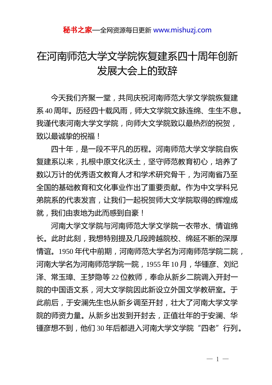 秘书之家—全网资源每日更新 www.mishuzj.com在河南师范大学文学院恢复建系四十周年创新发展大会上的致辞今天我们齐聚一堂,共同庆祝河南师范大学文学院恢复建系 40 周年。历经四十载风雨,师大文学院文脉连绵、生生不息。我谨代表河南大学文学院,向师大文学院致以最热烈的祝贺,致以最诚挚的祝福!四十年,是一段不平凡的历程。河南师范大学文学院自恢复建系以来,扎根中原文化沃土,坚守师范教育初心,培养了数以万计的优秀语文教育人才和学术研究骨干,为河南省乃至全国的基础教育和文化事业作出了重要贡献。作为中文学科兄弟院系的代表发言,让我们一起祝贺师大文学院取得的辉煌成就,我们由衷地为此而感到自豪!河南大学文学院与河南师范大学文学院一衣带水、情谊绵长。此时此刻,我想特别提及几段跨越院校、绵延不断的深厚情谊。1950 年代中前期,河南师范大学名为河南师范学院二院,河南大学名为河南师范学院一院,1955 年 10 月,华锺彦、刘纪泽、常玉璋、王梦隐等 22 位教师,奉命从新乡二院调入开封一院的中国语文系,河大文学院因此新设立外国文学教研室。于此前后,于安澜先生也从新乡调至开封,壮大了河南大学文学院的师资力量。从新乡出发到开封去,正值壮年的于安澜、华锺彦想不到,他们 30 年后都进入河南大学文学院“四老”行列。— 1 —秘书之家—全网资源每日更新 www.mishuzj.com还有我们德高望重的刘增杰老师,在河南师范大学这片沃土上度过了青春年少的大学时光,1955 年因院系调整到河南大学中文系就读,从此踏上了治学之路。目前两个学院现当代文学专业的中年骨干教师,有哪一位没有受过刘老师的教诲呢?还有,中国现当代文学教研室的刘涛老师,在这里度过了青涩而充实的学术起步阶段,从一名普通学子成长为著名学者。文脉相承的例子不胜枚举:河大中文系的王绍令老师 1991年任师大校长,2000 年退休;周铁项老师 2011 年任师大书记,2015 年退休;李慈健老师 1998 年至 2001 年师大党委副书记;孙先科老师 2008 至 2017 年任师大副校长,秦法跃老师现任师大党委副书记,他们将自己的心血与智慧倾注于学校建设与发展之中,同时拉近了两个学院的联系。师大文学院的王敏主任、曹书文院长、李永贤院长、赵黎波院长,也都是成长于开封,执教于新乡,引领学院发展与学科建设。还有许多中青年骨干教师,也都有着相似的“开封——新乡”两地的人生经历。河南大学文学院与河南师范大学文学院,是真正的你中有我、我中有你的兄弟院系。我们同处中原大地,共沐黄河文化润泽,水深土厚,文脉绵长,因此在学术传承、教育理念上也心有灵犀。多年来,两院交流频繁,分享教学科研心得,联合攻克学术难题,让优质教育资源、前沿学术成果惠及更多师生,合力为文脉传承注入强劲动力。中文,是我们的根,是我们的魂。它不仅是一门学科,更— 2 —秘书之家—全网资源每日更新 www.mishuzj.com是一种文化的传承,一种精神的延续。在当今数字技术与人工智能迅猛发展的时代,中文教育面临着前所未有的机遇与挑战,我们如何守正创新?如何传承发展?在数字中文建设方面,我们也希望河南各高校的文学院,能够展开更为务实更为有效的合作。未来的路,任重而道远,希望我们能够携手并进。在人才培养上互通有无,在学术研究上联合攻关,在社会服务上资源共享,共同为推动河南省中文教育高质量发展贡献智慧和力量!借此机会,也想谈谈我们共同的使命。我们地处中原,都肩负着传承中华优秀传统文化、服务区域基础教育、推动文化强省建设的重任。我们要面向时代发展与国家需求,培养具有扎实专业知识和教学能力的语文教师,培养具有文化理想、教育情怀和社会责任感的教育家,培养扎根地方而服务国家文化建设的“大先生”。我们要让更多青年学子感受汉语之美,理解社会之变,思考教育之道;我们要把文学教育从高校推向社会,向生活的每一个角落传递人文与审美的力量。各位同仁,四十年,是一个节点,更是一个新的起点。愿河南师范大学文学院以此为契机,继往开来,再谱华章!愿兄弟院系情谊长存,共襄中文教育之盛举!祝师大文学院在新的起点上奋勇向前,迈向新的高度!— 3 —