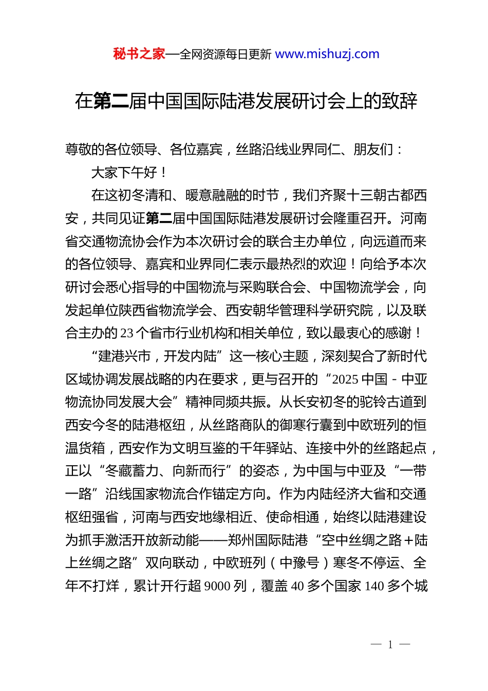 秘书之家—全网资源每日更新 www.mishuzj.com在第二届中国国际陆港发展研讨会上的致辞尊敬的各位领导、各位嘉宾,丝路沿线业界同仁、朋友们:大家下午好!在这初冬清和、暖意融融的时节,我们齐聚十三朝古都西安,共同见证第二届中国国际陆港发展研讨会隆重召开。河南省交通物流协会作为本次研讨会的联合主办单位,向远道而来的各位领导、嘉宾和业界同仁表示最热烈的欢迎!向给予本次研讨会悉心指导的中国物流与采购联合会、中国物流学会,向发起单位陕西省物流学会、西安朝华管理科学研究院,以及联合主办的 23 个省市行业机构和相关单位,致以最衷心的感谢!“建港兴市,开发内陆”这一核心主题,深刻契合了新时代区域协调发展战略的内在要求,更与召开的“2025 中国-中亚物流协同发展大会”精神同频共振。从长安初冬的驼铃古道到西安今冬的陆港枢纽,从丝路商队的御寒行囊到中欧班列的恒温货箱,西安作为文明互鉴的千年驿站、连接中外的丝路起点,正以“冬藏蓄力、向新而行”的姿态,为中国与中亚及“一带一路”沿线国家物流合作锚定方向。作为内陆经济大省和交通枢纽强省,河南与西安地缘相近、使命相通,始终以陆港建设为抓手激活开放新动能——郑州国际陆港“空中丝绸之路+陆上丝绸之路”双向联动,中欧班列(中豫号)寒冬不停运、全年不打烊,累计开行超 9000 列,覆盖 40 多个国家 140 多个城— 1 —秘书之家—全网资源每日更新 www.mishuzj.com市;洛阳、新乡、商丘等区域陆港协同发力,形成“一核多极”格局,让河南从“内陆腹地”跃升为开放“前沿高地”,生动诠释了“陆港兴则产业兴,产业兴则城市兴”的发展逻辑。当前,中国与中亚贸易往来日益紧密,中吉乌铁路等跨境基建加速推进,物流协同已成为区域合作的核心纽带。本届研讨会聚焦的中欧班列高效运营、多式联运、数字物流、低空物流等议题,精准把握了行业发展脉搏。河南始终积极投身其中:以“公转铁”“公转水”为抓手,攻克冬季运输难题,推动物流成本较五年前下降超 20%;以数字化转型为突破,构建智慧物流信息平台,实现通关时效提升 50%以上,让“冷冬”变“暖商”;以能源物流、跨境电商物流为重点,深化与中亚国家产业联动,为“十五五”规划开局积蓄动能。而西安作为封存历史的博物馆、涌动商机的枢纽城,更以陆港为桥、铁路为脉,让古老枢纽在初冬时节焕发新生,为我们提供了宝贵的实践样本。这些探索让我们深刻认识到,陆港不仅是物流节点,更是内陆地区抵御市场寒意、融入全球供应链的关键载体。作为丝路沿线重要省份,河南省交通物流协会始终致力于搭建行业交流合作桥梁,推动陆港资源共享、优势互补。此次研讨会的召开,为我们在初冬时节凝聚共识、共话合作提供了宝贵契机。期待各位嘉宾围绕陆港标准化建设、跨境通道联动、物流降本增效等关键议题,畅所欲言、凝聚共识。我们愿与各方一道,传承弘扬“中国-中亚精神”,共同推动陆港与产业、— 2 —秘书之家—全网资源每日更新 www.mishuzj.com城市深度融合,让西安、郑州等枢纽城市串联起更多“连接东西、贯通南北”的黄金通道,为内陆地区高质量发展和高水平对外开放注入冬日暖流,作出新的更大贡献!最后,预祝第二届中国国际陆港发展研讨会取得圆满成功!祝各位领导、各位嘉宾身体健康、工作顺利、万事如意!谢谢大家!— 3 —