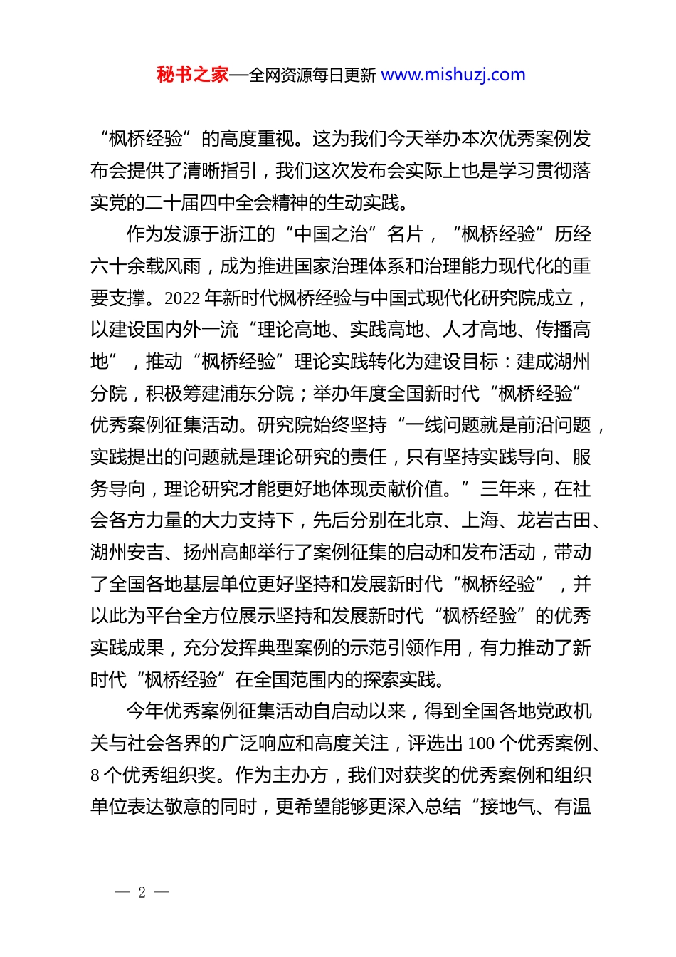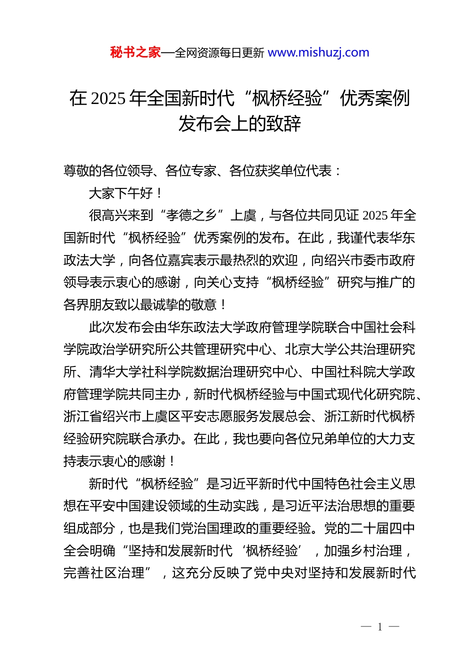 秘书之家—全网资源每日更新 www.mishuzj.com在 2025 年全国新时代“枫桥经验”优秀案例发布会上的致辞尊敬的各位领导、各位专家、各位获奖单位代表:大家下午好!很高兴来到“孝德之乡”上虞,与各位共同见证 2025 年全国新时代“枫桥经验”优秀案例的发布。在此,我谨代表华东政法大学,向各位嘉宾表示最热烈的欢迎,向绍兴市委市政府领导表示衷心的感谢,向关心支持“枫桥经验”研究与推广的各界朋友致以最诚挚的敬意!此次发布会由华东政法大学政府管理学院联合中国社会科学院政治学研究所公共管理研究中心、北京大学公共治理研究所、清华大学社科学院数据治理研究中心、中国社科院大学政府管理学院共同主办,新时代枫桥经验与中国式现代化研究院、浙江省绍兴市上虞区平安志愿服务发展总会、浙江新时代枫桥经验研究院联合承办。在此,我也要向各位兄弟单位的大力支持表示衷心的感谢!新时代“枫桥经验”是习近平新时代中国特色社会主义思想在平安中国建设领域的生动实践,是习近平法治思想的重要组成部分,也是我们党治国理政的重要经验。党的二十届四中全会明确“坚持和发展新时代‘枫桥经验’,加强乡村治理,完善社区治理”,这充分反映了党中央对坚持和发展新时代— 1 —秘书之家—全网资源每日更新 www.mishuzj.com“枫桥经验”的高度重视。这为我们今天举办本次优秀案例发布会提供了清晰指引,我们这次发布会实际上也是学习贯彻落实党的二十届四中全会精神的生动实践。作为发源于浙江的“中国之治”名片,“枫桥经验”历经六十余载风雨,成为推进国家治理体系和治理能力现代化的重要支撑。2022 年新时代枫桥经验与中国式现代化研究院成立,以建设国内外一流“理论高地、实践高地、人才高地、传播高地”,推动“枫桥经验”理论实践转化为建设目标:建成湖州分院,积极筹建浦东分院;举办年度全国新时代“枫桥经验”优秀案例征集活动。研究院始终坚持“一线问题就是前沿问题,实践提出的问题就是理论研究的责任,只有坚持实践导向、服务导向,理论研究才能更好地体现贡献价值。”三年来,在社会各方力量的大力支持下,先后分别在北京、上海、龙岩古田、湖州安吉、扬州高邮举行了案例征集的启动和发布活动,带动了全国各地基层单位更好坚持和发展新时代“枫桥经验”,并以此为平台全方位展示坚持和发展新时代“枫桥经验”的优秀实践成果,充分发挥典型案例的示范引领作用,有力推动了新时代“枫桥经验”在全国范围内的探索实践。今年优秀案例征集活动自启动以来,得到全国各地党政机关与社会各界的广泛响应和高度关注,评选出 100 个优秀案例、8 个优秀组织奖。作为主办方,我们对获奖的优秀案例和组织单位表达敬意的同时,更希望能够更深入总结“接地气、有温— 2 —秘书之家—全网资源每日更新 www.mishuzj.com度、可复制”的基层治理智慧,更好发挥示范引领作用,进一步推动将“预防在前、调解优先、运用法治、就地解决”落到实处,为推进强国建设贡献力量!推进以实践为导向的人才培养机制改革,是法学院校深入学习贯彻习近平法治思想的重要举措。根据上海市委市政府的部署,华政作为高校全面深化综合改革试点单位,围绕“重服务强贡献”,对接全面依法治国需求,聚焦涉外法治服务、法治政府建设服务、城市治理服务行业,培养高层次、实践型法治和社会治理人才。我们将推动“枫桥经验”深度融入社会治理人才培养全链条、理论研究新视角、基层服务新场景。为此我们诚挚邀请获奖单位推荐资深专家进校园、进课堂,共研人才培养方案、共建实务课程和案例库;同时拓展“校地协同”实习实践基地,一起组织学生进基层、进社区,在矛盾调解、平安巡防、法治宣传中淬炼本领,培养一批能扎根基层、善用法治、善解难题的“实战型”人才。再次感谢各位领导、专家对本次发布会的支持,祝愿新时代“枫桥经验”在全国范围内绽放更绚丽的光彩!祝各位身体健康、工作顺利、万事如意!谢谢!在教风学风建设表彰大会上的致辞:一所大学有没有灵魂看什么?州西亚斯学院理事长陈肖纯— 3 —秘书之家—全网资源每日更新 www.mishuzj.com(2025 年 12 月 1 日)各位老师...