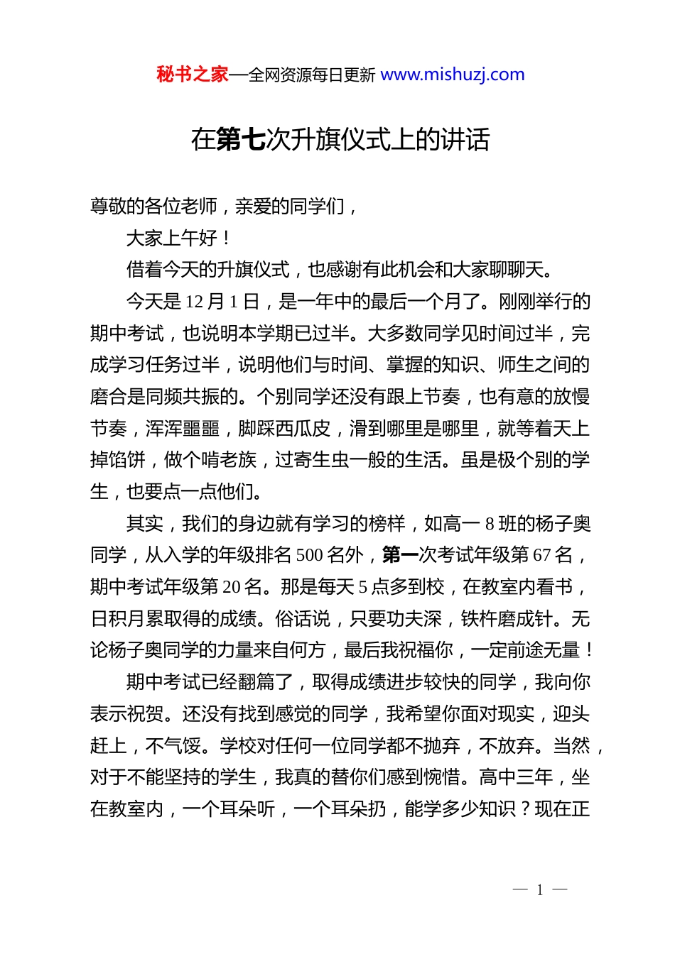 秘书之家—全网资源每日更新 www.mishuzj.com在第七次升旗仪式上的讲话尊敬的各位老师,亲爱的同学们,大家上午好!借着今天的升旗仪式,也感谢有此机会和大家聊聊天。今天是 12 月 1 日,是一年中的最后一个月了。刚刚举行的期中考试,也说明本学期已过半。大多数同学见时间过半,完成学习任务过半,说明他们与时间、掌握的知识、师生之间的磨合是同频共振的。个别同学还没有跟上节奏,也有意的放慢节奏,浑浑噩噩,脚踩西瓜皮,滑到哪里是哪里,就等着天上掉馅饼,做个啃老族,过寄生虫一般的生活。虽是极个别的学生,也要点一点他们。其实,我们的身边就有学习的榜样,如高一 8 班的杨子奥同学,从入学的年级排名 500 名外,第一次考试年级第 67 名,期中考试年级第 20 名。那是每天 5 点多到校,在教室内看书,日积月累取得的成绩。俗话说,只要功夫深,铁杵磨成针。无论杨子奥同学的力量来自何方,最后我祝福你,一定前途无量!期中考试已经翻篇了,取得成绩进步较快的同学,我向你表示祝贺。还没有找到感觉的同学,我希望你面对现实,迎头赶上,不气馁。学校对任何一位同学都不抛弃,不放弃。当然,对于不能坚持的学生,我真的替你们感到惋惜。高中三年,坐在教室内,一个耳朵听,一个耳朵扔,能学多少知识?现在正— 1 —秘书之家—全网资源每日更新 www.mishuzj.com是你们求知的年龄呀。同学们学有所成,出去聚会,会因为自己是民和高中的学生而感到骄傲、自豪。你争气,你在社会上就是民和人,别人就会对你刮目相看,尊敬你。你放弃自己,甚至做一些让人不齿的事,别人就会对你嗤之以鼻。孰是孰非,孰轻孰重,孰好孰坏,同学们也是知道的,看你自己的选择。咱们学生入校的时候,成绩都不是最拔尖的,基础差,学习肯定很吃力,但是你可以制定目标。先制定一个小目标,就先制定最近考试的目标,朝着目标迈进,就有奔头。一个小目标接着一个小目标的完成,小目标不就积累成大目标了吗?这就是做事的毅力!做事没有毅力,就等着天上掉馅饼,那是不可能的!真等到天上掉馅饼,重力加速度 9.8 米/秒,那会砸死人的,而电信诈骗就骗这类想便宜的人。“向雷锋同志学习”,是 1963 年 3 月 5 日,《人民日报》发表的毛泽东主席的题词。62 年过去了,雷锋的精神还是值得我们学习的,学习他的好思想、好作风、好品德,学习他长期一贯地做好事,而不做坏事,“雷锋出差一千里,好事做了一火车”。还有他的“钉子精神”,善于利用时间、刻苦学习,“挤”和“钻”的学习态度,这都是值得提倡的。他曾在日记中这样写道:“对待同志要像春天般的温暖,对待工作要像夏天一样火热,对待个人主义要像秋风扫落叶一样,对待敌人要像严冬一样残酷无情。”— 2 —秘书之家—全网资源每日更新 www.mishuzj.com在上个世纪八九十年代,党中央要求向张海迪同志学习。1955 年出生的张海迪,5 岁因?脊髓血管瘤导致胸部以下瘫痪,经历三次大手术摘除六块椎板,被医生预言活不过 27 岁,后来奇迹一个个出现,就是靠理想信念、靠坚持不懈的学习,做好事,做善事,创造生命的奇迹,她现在已经 70 多岁了。在残酷的命运挑战面前,张海迪没有沮丧和沉沦,她以顽强的毅力和恒心与疾病做斗争,经受了严峻的考验,身残志坚。而我们有些学生,正相反,身坚志残!这次讲话即将结束,我借用伟人毛泽东同志一生无数诗词中的几句来向同学们提出要求。第一首《七古咏蛙》:“独坐池塘如虎踞,绿荫树下养精神。春来我不先开口,哪个虫儿敢作声”,此诗显露出他血气方刚的赤子之心,还有初生牛犊不怕虎的勇气与霸气。还有《七律•长征》:“红军不怕远征难,万水千山只等闲。五岭逶迤腾寂浪,乌蒙磅礴走泥丸。金沙水拍云崖暖,大渡桥横铁索寒。更喜岷山千里雪,三军过后尽开颜”,展现红军藐视困难的革命乐观主义精神。《水调歌头游泳》中“更立西江石壁,截断巫山云雨,高峡出平湖”,毛主席在战争年代运筹帷幄,决胜千里。建国后,三峡大坝,南水北调,体现了党领导人经济建设的决心和勇气,也是领袖人物的浪漫主义的体现。《沁园春雪》中“惜秦皇汉武,略输文采;唐宗宋祖,稍逊...