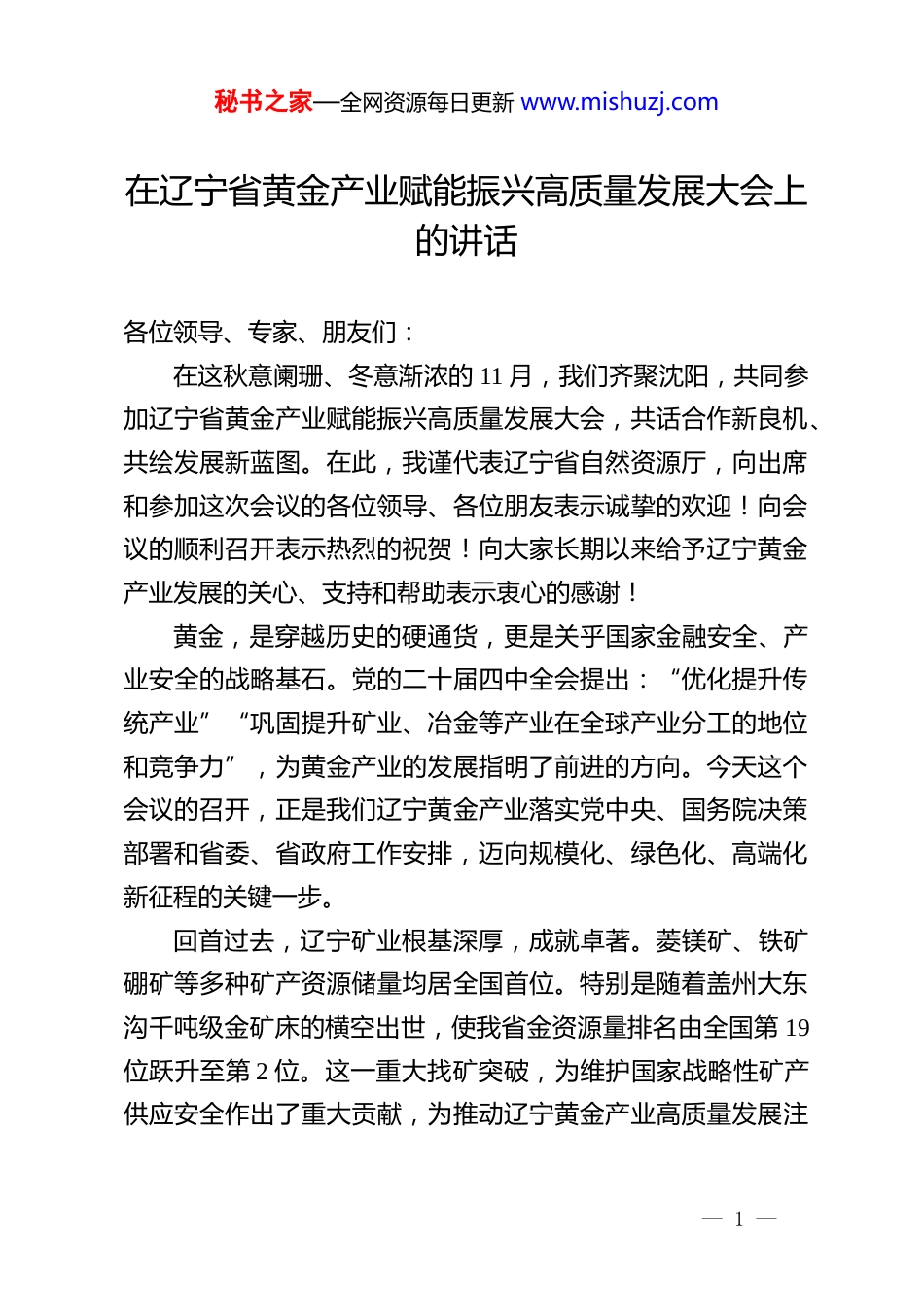 秘书之家—全网资源每日更新 www.mishuzj.com在辽宁省黄金产业赋能振兴高质量发展大会上的讲话各位领导、专家、朋友们:在这秋意阑珊、冬意渐浓的 11 月,我们齐聚沈阳,共同参加辽宁省黄金产业赋能振兴高质量发展大会,共话合作新良机、共绘发展新蓝图。在此,我谨代表辽宁省自然资源厅,向出席和参加这次会议的各位领导、各位朋友表示诚挚的欢迎!向会议的顺利召开表示热烈的祝贺!向大家长期以来给予辽宁黄金产业发展的关心、支持和帮助表示衷心的感谢!黄金,是穿越历史的硬通货,更是关乎国家金融安全、产业安全的战略基石。党的二十届四中全会提出:“优化提升传统产业”“巩固提升矿业、冶金等产业在全球产业分工的地位和竞争力”,为黄金产业的发展指明了前进的方向。今天这个会议的召开,正是我们辽宁黄金产业落实党中央、国务院决策部署和省委、省政府工作安排,迈向规模化、绿色化、高端化新征程的关键一步。回首过去,辽宁矿业根基深厚,成就卓著。菱镁矿、铁矿硼矿等多种矿产资源储量均居全国首位。特别是随着盖州大东沟千吨级金矿床的横空出世,使我省金资源量排名由全国第 19位跃升至第 2 位。这一重大找矿突破,为维护国家战略性矿产供应安全作出了重大贡献,为推动辽宁黄金产业高质量发展注— 1 —秘书之家—全网资源每日更新 www.mishuzj.com入了强劲的动力。展望未来,辽宁矿业蓝图绘就,动能澎湃。省委省政府已经明确提出,要依托大东沟金矿,打造集黄金“采选冶炼、珠宝贸易、文化旅游”三大板块为一体的产业集群。到“十五五”期末,建成国家级黄金基地,让黄金产业成为助力辽宁全面振兴的要引擎。辽宁的黄金产业正处于前所未有的发展机遇期,目标的实现,离不开脚踏实地的行动。借此机会,我提出几点希望:一是希望省黄金行业协会充分发挥桥梁纽带作用,推动构建开放共赢的产业生态。行业协会是连通政府与市场、串联产业链各环节的桥梁纽带。要做推动政策法规落地的参谋助手。主动参与行业政策和规划的拟定,为各级政府决策提供来自一线、富有见地的意见建议。要及时对宏观政策进行宣传和解读,“翻译”成企业能听懂、易操作的行业标准和行动指南,引导企业将法治、绿色、安全等理念,内化为日常经营的自觉行动。要做市场要素配置的协调员。面对“多、小、散”矿体整合和全产业链构建任务,积极搭建“资源整合、技术交流、市场开拓”公共服务平台。通过完善信息统计、供需对接、标准研制等服务,降低交易成本,促进要素高效流动。要做行业发展的引领者。密切跟踪国内外黄金价格变动、技术前沿和产业动向,为企业投资决策提供科学依据,避免盲目跟风。要主动发声,向社会展示辽宁黄金产业在绿色发展、社会责任等方面的进步— 2 —秘书之家—全网资源每日更新 www.mishuzj.com与担当,塑造产业的良好形象。通过构建一个信息透明、规则清晰、合作顺畅的产业生态,让每一位参与者都能在健康的土壤中茁壮成长。二是希望各相关部门加大对黄金产业的支持力度,为企业打造一流的营商环境。黄金产业的高质量发展,离不开肥沃的“政策土壤”和阳光雨露。各级自然资源部门、各相关部门要密切配合、同频共振,将《辽宁省自然资源系统打造最优营商环境行动方案》等一系列政策红利,精准滴灌到黄金产业发展的每一个环节。要强化“全生命周期”服务,做到“无事不扰、有求必应”。对于黄金产业集群建设这样的重大工程,要全面推行“项目管家”和“服务包”机制。从最初的规划调整、用地用林用矿保障,到建设期的各类行政许可,再到投产后的不动产登记、政策兑现,提供从“蓝图”到“竣工”的全流程、一站式服务。要深化要素保障改革,推动资源“精准配置、高效流转”。各级自然资源部门要带头落实“要素跟着项目走”,在国土空间规划中为黄金产业预留充足发展空间,积极运用“多审合一、多证合一”、混合产业用地供给、先租后让、弹性年期等创新政策,切实降低企业用地成本。要探索建立矿产资源风险勘查基金,激励社会资本投入“攻深找盲”,为产业持续发展储备后劲。要营造“法治化、可预期”的发展环境,让企业“安心经营、放心投资”。各相关部门要协同推进...