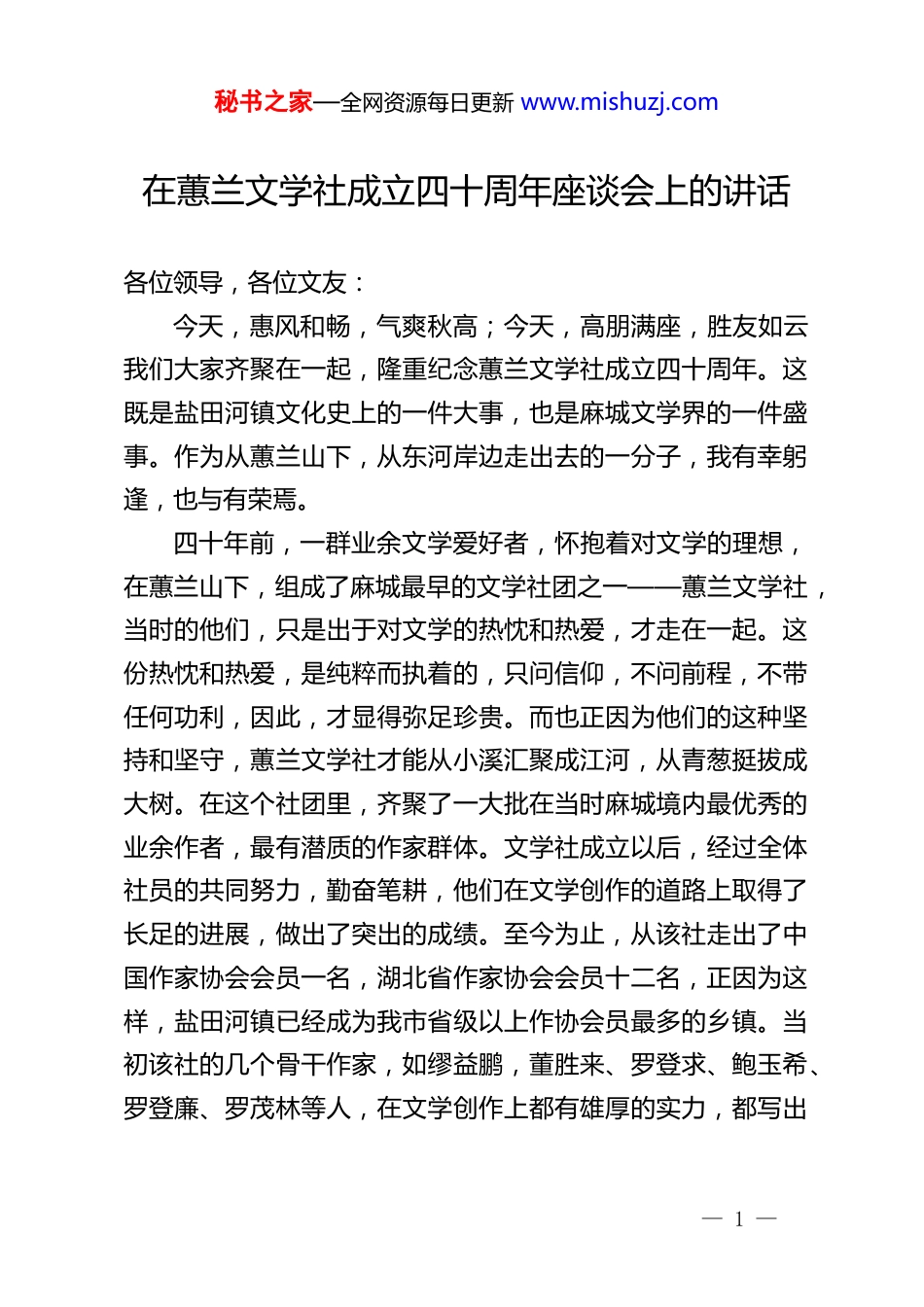 秘书之家—全网资源每日更新 www.mishuzj.com在蕙兰文学社成立四十周年座谈会上的讲话各位领导,各位文友:今天,惠风和畅,气爽秋高;今天,高朋满座,胜友如云我们大家齐聚在一起,隆重纪念蕙兰文学社成立四十周年。这既是盐田河镇文化史上的一件大事,也是麻城文学界的一件盛事。作为从蕙兰山下,从东河岸边走出去的一分子,我有幸躬逢,也与有荣焉。四十年前,一群业余文学爱好者,怀抱着对文学的理想,在蕙兰山下,组成了麻城最早的文学社团之一——蕙兰文学社,当时的他们,只是出于对文学的热忱和热爱,才走在一起。这份热忱和热爱,是纯粹而执着的,只问信仰,不问前程,不带任何功利,因此,才显得弥足珍贵。而也正因为他们的这种坚持和坚守,蕙兰文学社才能从小溪汇聚成江河,从青葱挺拔成大树。在这个社团里,齐聚了一大批在当时麻城境内最优秀的业余作者,最有潜质的作家群体。文学社成立以后,经过全体社员的共同努力,勤奋笔耕,他们在文学创作的道路上取得了长足的进展,做出了突出的成绩。至今为止,从该社走出了中国作家协会会员一名,湖北省作家协会会员十二名,正因为这样,盐田河镇已经成为我市省级以上作协会员最多的乡镇。当初该社的几个骨干作家,如缪益鹏,董胜来、罗登求、鲍玉希、罗登廉、罗茂林等人,在文学创作上都有雄厚的实力,都写出— 1 —秘书之家—全网资源每日更新 www.mishuzj.com了思想性与艺术性相统一,既有高度又有温度的文学作品。至今依然是我市最具代表性的作家群体,在市内外都具有广泛的影响力。而我作为这个时期的亲历者和见证者,由衷的为他们感到骄傲,感到自豪。文学的力量是无穷的,它是净化灵魂,启迪思想,奋发精神,歌颂美好的工具和武器。热爱文学,就是热爱高尚,崇尚文明,激励向上。进入新时代以来,党和国家把文化自信提高到一个从来没有的高度,因此,我们的作家,就应该自觉地为人民抒写,为人民抒情,为人民抒怀。今天,我们高兴地看到,盐田河镇党委和政府,对文化和文学工作高度重视,在蕙兰文学社成立四十周年之际,精心组织了这次座谈会,应该向他们致敬,我更感到高兴的是,新一届文学社的领导班子已经成立,蕙兰文学社后继有人,且又增添了很多新鲜血液。我衷心的希望,今后,蕙兰文学社能够在盐田河镇党委和政府的领导下,在全体领导班子成员的带动下,发扬老一辈蕙兰人那种辛勤耕耘,淡泊名利,坚韧不拔,勇攀高峰的蕙兰精神,在文学创作的征途上勇往直前,取得更新更大的成就。谢谢大家!— 2 —