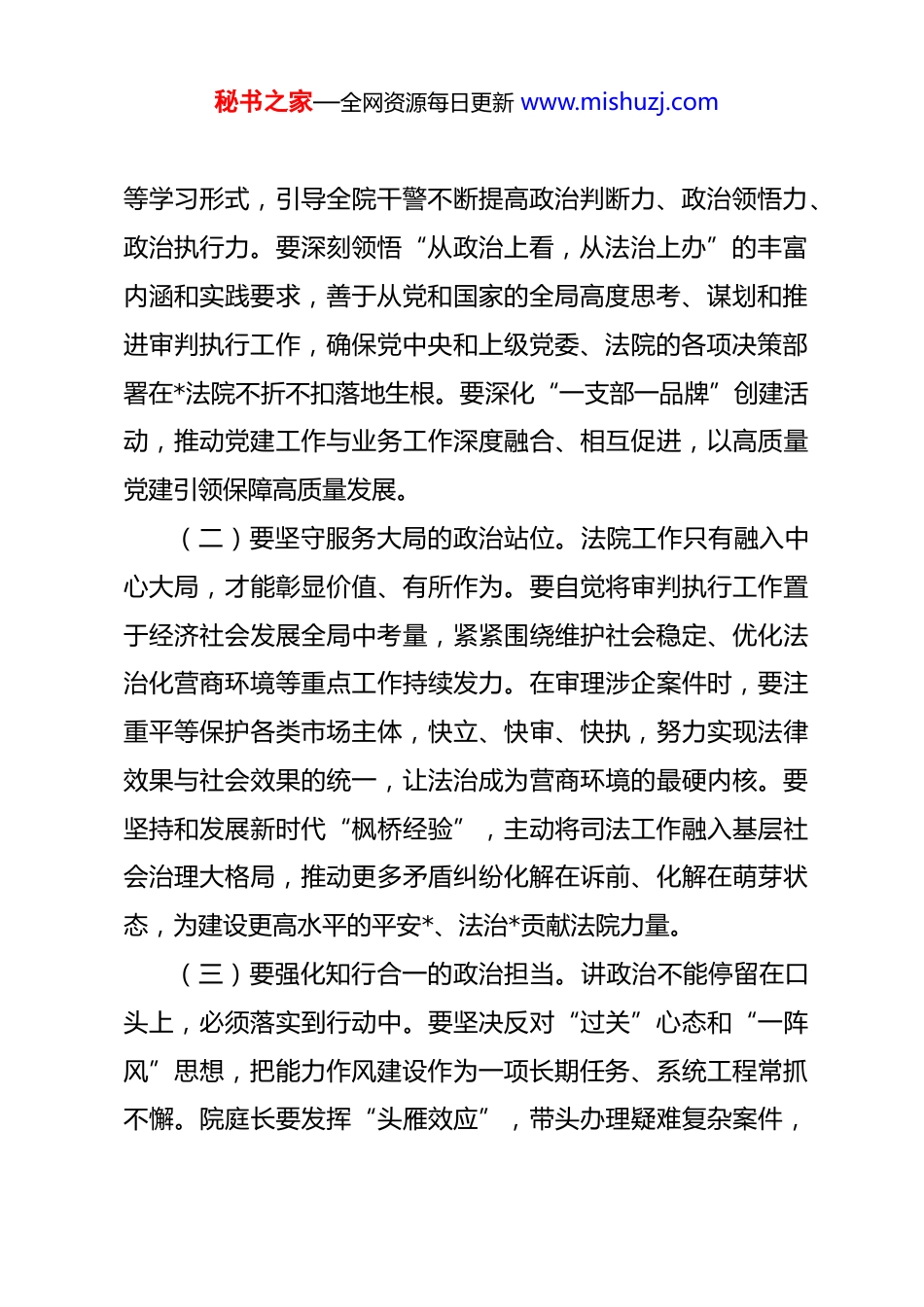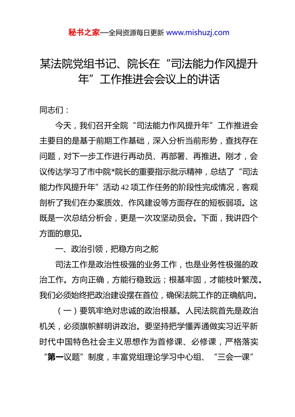 秘书之家—全网资源每日更新 www.mishuzj.com某法院党组书记、院长在“司法能力作风提升年”工作推进会会议上的讲话 同志们:今天,我们召开全院“司法能力作风提升年”工作推进会主要目的是基于前期工作基础,深入分析当前形势,查找存在问题,对下一步工作进行再动员、再部署、再推进。刚才,会议传达学习了市中院*院长的重要指示批示精神,总结了“司法能力作风提升年”活动 42 项工作任务的阶段性完成情况,客观剖析了我们在办案质效、作风建设等方面存在的短板弱项。这既是一次总结分析会,更是一次攻坚动员会。下面,我讲四个方面的意见。一、政治引领,把稳方向之舵司法工作是政治性极强的业务工作,也是业务性极强的政治工作。方向正确,方能行稳致远;根基牢固,才能枝叶繁茂。我们必须始终把政治建设摆在首位,确保法院工作的正确航向。(一)要筑牢绝对忠诚的政治根基。人民法院首先是政治机关,必须旗帜鲜明讲政治。要坚持把学懂弄通做实习近平新时代中国特色社会主义思想作为首修课、必修课,严格落实“第一议题”制度,丰富党组理论学习中心组、“三会一课”秘书之家—全网资源每日更新 www.mishuzj.com等学习形式,引导全院干警不断提高政治判断力、政治领悟力、政治执行力。要深刻领悟“从政治上看,从法治上办”的丰富内涵和实践要求,善于从党和国家的全局高度思考、谋划和推进审判执行工作,确保党中央和上级党委、法院的各项决策部署在*法院不折不扣落地生根。要深化“一支部一品牌”创建活动,推动党建工作与业务工作深度融合、相互促进,以高质量党建引领保障高质量发展。(二)要坚守服务大局的政治站位。法院工作只有融入中心大局,才能彰显价值、有所作为。要自觉将审判执行工作置于经济社会发展全局中考量,紧紧围绕维护社会稳定、优化法治化营商环境等重点工作持续发力。在审理涉企案件时,要注重平等保护各类市场主体,快立、快审、快执,努力实现法律效果与社会效果的统一,让法治成为营商环境的最硬内核。要坚持和发展新时代“枫桥经验”,主动将司法工作融入基层社会治理大格局,推动更多矛盾纠纷化解在诉前、化解在萌芽状态,为建设更高水平的平安*、法治*贡献法院力量。(三)要强化知行合一的政治担当。讲政治不能停留在口头上,必须落实到行动中。要坚决反对“过关”心态和“一阵风”思想,把能力作风建设作为一项长期任务、系统工程常抓不懈。院庭长要发挥“头雁效应”,带头办理疑难复杂案件,秘书之家—全网资源每日更新 www.mishuzj.com带头攻克审判执行难题,带头遵守各项纪律规矩,以“关键少数”的示范引领带动“绝大多数”的积极作为。要建立健全“从政治上看”的识别、评价、考核机制,在案件审理、文书制作、群众接待等具体工作中,自觉检视政治立场、政治方向、政治原则,确保每一项司法活动都经得起历史、人民和法律的检验。二、能力筑基,锻造履职之能能力是立身之本、成事之基。面对新形势新任务新要求,能力不足的危险现实存在。我们必须下大力气补齐能力短板,全面提升履职尽责所需的专业素养和综合本领。(一)要提升公正司法的专业能力。审判是法院的主业,专业能力是法官的看家本领。要聚焦主责主业,持续加强法律法规和司法解释的学习,深入开展“法官讲坛”、“案例研讨”等活动,鼓励干警钻研业务,争当审判业务专家、调解能手。要特别注重加强对发改案件的深度评查分析,找准问题根源,深刻反思总结,避免同类问题反复出现。要着力提升庭审驾驭能力和裁判文书制作水平,做到事实查明精准、法律适用正确、文书说理透彻,让每一起案件都成为经得起检验的“铁案”。(二)要提升司法为民的群众工作能力。司法的根基在人秘书之家—全网资源每日更新 www.mishuzj.com民,力量在人民。要牢固树立“如我在诉”的理念,经常进行换位思考,将心比心体会人民群众在诉讼中的所急所盼。在立案、审判、执行各环节,都要耐心倾听群众诉求,细心解答群众疑问,用群众听得懂的语言、看得明白的方式释法明理、化解纠纷。要持续优化诉讼服务,加强 12368 热线建设,推广使用诉讼文书示范文本,为人民群众提供更加普惠、精准、便...