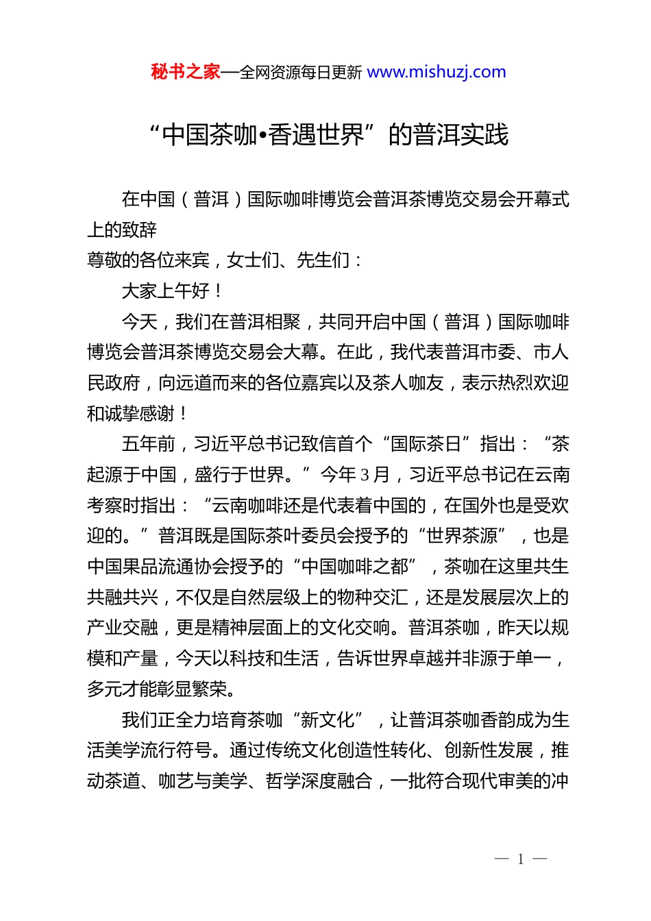 秘书之家—全网资源每日更新 www.mishuzj.com“中国茶咖•香遇世界”的普洱实践在中国(普洱)国际咖啡博览会普洱茶博览交易会开幕式上的致辞尊敬的各位来宾,女士们、先生们:大家上午好!今天,我们在普洱相聚,共同开启中国(普洱)国际咖啡博览会普洱茶博览交易会大幕。在此,我代表普洱市委、市人民政府,向远道而来的各位嘉宾以及茶人咖友,表示热烈欢迎和诚挚感谢!五年前,习近平总书记致信首个“国际茶日”指出:“茶起源于中国,盛行于世界。”今年 3 月,习近平总书记在云南考察时指出:“云南咖啡还是代表着中国的,在国外也是受欢迎的。”普洱既是国际茶叶委员会授予的“世界茶源”,也是中国果品流通协会授予的“中国咖啡之都”,茶咖在这里共生共融共兴,不仅是自然层级上的物种交汇,还是发展层次上的产业交融,更是精神层面上的文化交响。普洱茶咖,昨天以规模和产量,今天以科技和生活,告诉世界卓越并非源于单一,多元才能彰显繁荣。我们正全力培育茶咖“新文化”,让普洱茶咖香韵成为生活美学流行符号。通过传统文化创造性转化、创新性发展,推动茶道、咖艺与美学、哲学深度融合,一批符合现代审美的冲— 1 —秘书之家—全网资源每日更新 www.mishuzj.com煮仪式、消费空间、文创产品破茧成蝶,展现大国茶道风姿、演绎中国咖谷风彩,成为引领潮流新时尚。不断推陈出新的普洱茶咖文化,深深根植于 120 万茶人与 30 万咖农心中,成为234 万普洱各族人民摆脱贫困、创造价值、陶冶性情的生命之饮、精神之饮、灵魂之饮。我们正全面拥抱茶咖“新科技”,以创新驱动产业转型升级。坚持用现代科技改造传统产业,加快建设生态有机茶咖基地,构建数字溯源体系,不断从源头上确保品质安全。突破传统工艺局限,推行清洁化、标准化、智能化生产,萃取茶多酚、咖啡因等成分,开发茶咖食品、护肤品、功能性饮料,不断丰富产品形态。利用风味修饰和发酵技术,创造口感更丰富、层次更多元的新茶饮和特调咖啡,不断满足年轻化、个性化、定制化需求。茶叶和咖啡,正以全新的视角呈现丰富多样的消费场景、价值形态。我们正积极探索茶咖“新业态”,推动产业融合与价值链延伸。通过“茶咖+研学”,打造普洱咖啡师、茶艺师培训品牌,国内外研学团队纷至沓来、汇聚于此。通过“茶咖+康养”,规划建设茶咖疗愈基地、康养小镇,吸引各地游客到普洱感受茶咖健康生活。通过“茶咖+网络”,数字游民们正以电商直播、社群营销、私人订制等模式,把普洱茶咖从方寸之地联通世界。我们正精心打造茶咖“新场景”,重构新型茶咖消费体验— 2 —秘书之家—全网资源每日更新 www.mishuzj.com空间。第二茶世、火塘煮水、戴家巷等风格各异的茶咖空间,成为了游客体验消费的热门打卡地。60 个茶咖精品庄园、100个茶咖酒店民宿,拓展了“文旅目的地场景”。创新节庆赛事,举办高水平的咖啡师与新茶饮大赛,提升了产业的活跃度和影响力。我们正欣喜见证茶咖“新青年”,支撑起普洱茶咖产业的未来。在老一辈茶农咖农奠定的产业根基上,越来越多“新茶人”“咖二代”子承父业,积极投身茶咖事业新热潮。他们是“活态传承者”,正以茶咖主体“掌门人”姿态,把老一辈的坚守以现代的语言和方式讲述给世界。他们是“开拓创新者”,创立新锐品牌,玩转社交媒体,为传统产业注入全新思维。他们是“乡土振兴者”,满怀热情回归乡村、扎根庄园,为广阔农村注入最活跃、最可持续的动能。各位朋友,各位来宾!今日之普洱,左手捧着千年茶韵,右手端着百年咖香,值得被全世界看见、体验和铭记。让我们以本次博览会为新起点,尽情享受“茶咖双韵”之旅,共同探索“茶咖融合”无限可能,携手绘就交流互鉴、互利共赢的崭新画卷!谢谢大家!— 3 —