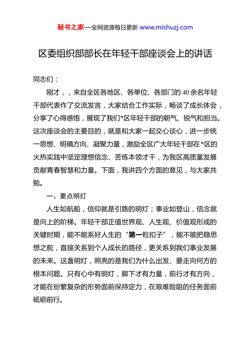 秘书之家—全网资源每日更新 www.mishuzj.com区委组织部部长在年轻干部座谈会上的讲话 同志们:刚才,,来自全区各地区、各单位、各部门的 40 余名年轻干部代表作了交流发言,大家结合工作实际,畅谈了成长体会,分享了心得感悟,展现了我们*区年轻干部的朝气、锐气和担当。这次座谈会的主要目的,就是和大家一起交心谈心,进一步统一思想、明确方向、凝聚力量,激励全区广大年轻干部在*区的火热实践中坚定理想信念、苦练本领才干,为我区高质量发展贡献青春智慧和力量。下面,我讲四个方面的意见,与大家共勉。一、要点明灯人生如航船,信仰就是引路的明灯;事业如登山,信念就是向上的阶梯。年轻干部正值世界观、人生观、价值观形成的关键时期,能不能系好人生的“第一粒扣子”,能不能把稳思想之舵,直接关系到个人成长的路径,更关系到我们事业发展的未来。这盏明灯,照亮的是我们为什么出发、要走向何方的根本问题。只有心中有明灯,脚下才有力量,前行才有方向,才能在纷繁复杂的形势面前保持定力,在艰难险阻的任务面前砥砺前行。秘书之家—全网资源每日更新 www.mishuzj.com(一)深化理论武装,补足精神之钙。理想信念的坚定,源自思想理论的清醒。马克思主义是共产党人的“真经”,习近平新时代中国特色社会主义思想是当代中国马克思主义、二十一世纪马克思主义,是我们做好一切工作的根本遵循。学习理论不是装点门面,更不能浅尝辄止。要像毛泽东同志研读《共产党宣言》那样,反复看、反复学,遇到问题就从里面找答案、找方法。年轻干部要把学习党的创新理论作为首要政治任务,坚持系统学、深入学、跟进学,读原著、学原文、悟原理,深刻把握其核心要义、精神实质、丰富内涵和实践要求。要紧密结合*区发展的实际,紧密结合本职工作,在学思践悟中融会贯通,在知行合一中提升境界,真正把学习成果转化为坚定的政治信仰、正确的思想方法和强大的工作动力。精神上缺“钙”,就会得“软骨病”。只有理论上的坚定,才能有政治上的坚定和行动上的自觉。(二)坚守政治忠诚,把稳前行之舵。对党忠诚,是年轻干部最基本的政治要求,是融入血脉、植入灵魂的本质属性。这种忠诚必须是纯粹的、具体的、无条件的。要深刻认识到,我们每个干部都有两次生命,一次是自然生命,是父母给的;一次是政治生命,是组织给的。年轻干部要时刻牢记自己的第一身份是共产党员,第一职责是为党工作,始终在政治立场、秘书之家—全网资源每日更新 www.mishuzj.com政治方向、政治原则、政治道路上同党中央保持高度一致。要把对党忠诚体现到贯彻落实党中央决策部署的实际行动上,体现到履职尽责、做好本职工作的实效上,体现到日常言行中。要严守党的政治纪律和政治规矩,决不能说一套做一套,不能搞任何形式的“低级红”、“高级黑”,要始终做政治上的明白人、老实人。(三)牢记初心使命,涵养为民之情。我们党的根本宗旨是全心全意为人民服务。年轻干部无论走多远,都不能忘记当初为什么出发。要始终把人民放在心中最高位置,胸怀“国之大者”,心系“区之要事”,但最终的落脚点是为人民服务。人社工作是重要的民生工作,其理念是围绕人、服务人、扶持人、成就人。这同样适用于我们*区的各项工作。年轻干部要主动深入群众,倾听群众呼声,了解群众期盼,把群众的急难愁盼问题作为我们工作的着力点。要树立正确的政绩观,多做打基础、利长远、惠民生的事情,用我们的“辛苦指数”换取群众的“幸福指数”。只有带着深厚的感情去做群众工作,才能真正赢得群众的信任和支持,我们的事业才能拥有不竭的力量源泉。二、要厚根基肌肉依附于骨骼,骨骼越强壮,所能承载的肌肉就越丰厚秘书之家—全网资源每日更新 www.mishuzj.com越结实。对于年轻干部而言,“骨骼”就是自身的能力素质,“肌肉”就是相应的岗位、荣誉和成就。先长骨头后长肉是永恒规律。根深才能叶茂,本固方可枝荣。能力的提升非一日之功,需要像竹子生长一样,前期默默扎根,积蓄力量,才能有日后破土而出的快速成长。当前,*区正处在转型升级、高质量发展的关键时期,任务重、挑战多,这对年轻干部的能力素质提出了更高要求。...