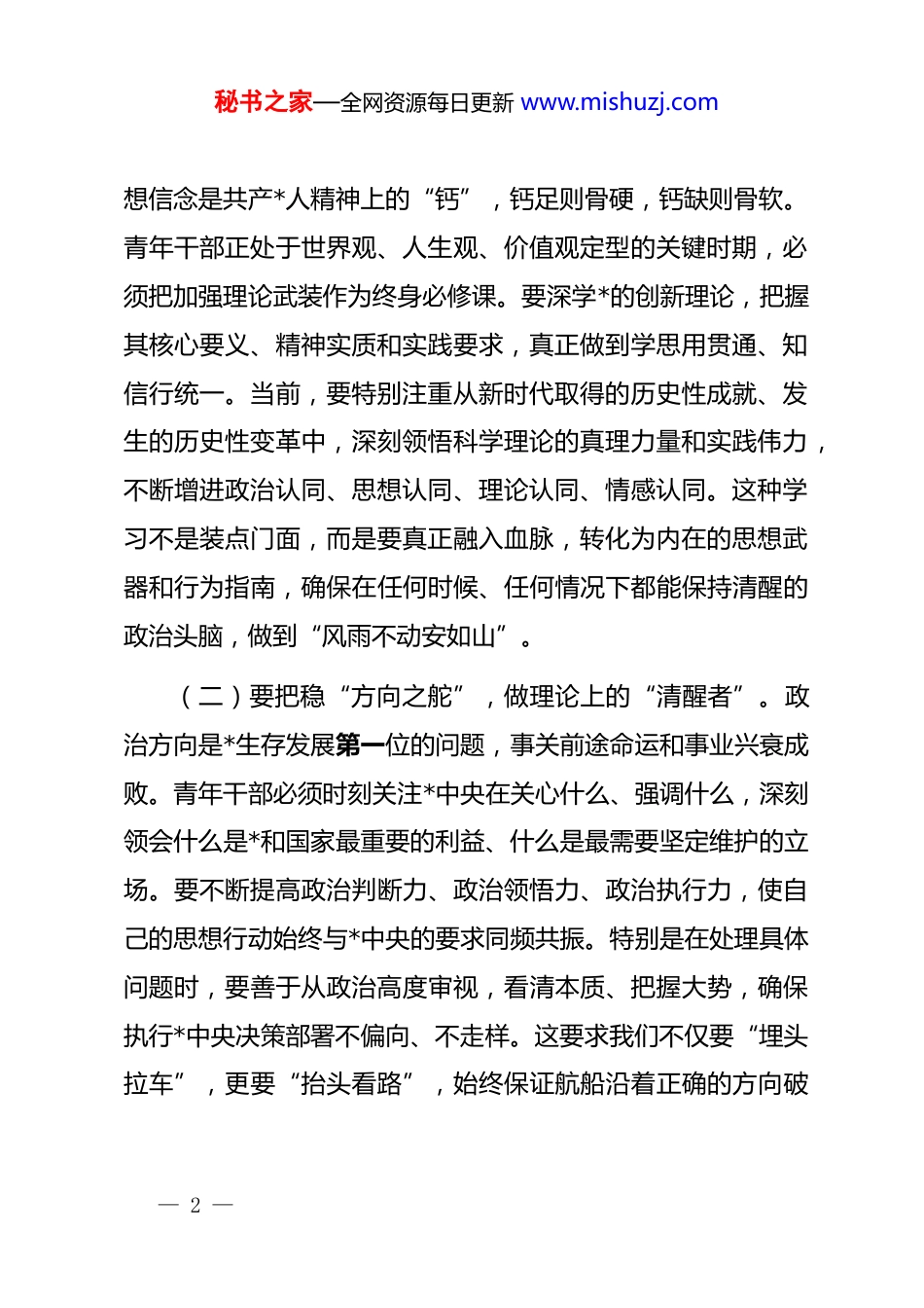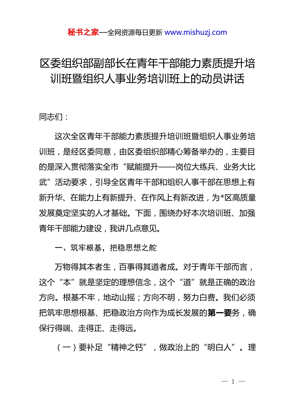 秘书之家—全网资源每日更新 www.mishuzj.com区委组织部副部长在青年干部能力素质提升培训班暨组织人事业务培训班上的动员讲话同志们:这次全区青年干部能力素质提升培训班暨组织人事业务培训班,是经区委同意,由区委组织部精心筹备举办的,主要目的是深入贯彻落实全市“赋能提升——岗位大练兵、业务大比武”活动要求,引导全区青年干部和组织人事干部在思想上有新升华、在能力上有新提升、在作风上有新改进,为*区高质量发展奠定坚实的人才基础。下面,围绕办好本次培训班、加强青年干部能力建设,我讲几点意见。一、筑牢根基,把稳思想之舵万物得其本者生,百事得其道者成。对于青年干部而言,这个“本”就是坚定的理想信念,这个“道”就是正确的政治方向。根基不牢,地动山摇;方向不明,努力白费。我们必须把筑牢思想根基、把稳政治方向作为成长发展的第一要务,确保行得端、走得正、走得远。(一)要补足“精神之钙”,做政治上的“明白人”。理— 1 —秘书之家—全网资源每日更新 www.mishuzj.com想信念是共产*人精神上的“钙”,钙足则骨硬,钙缺则骨软。青年干部正处于世界观、人生观、价值观定型的关键时期,必须把加强理论武装作为终身必修课。要深学*的创新理论,把握其核心要义、精神实质和实践要求,真正做到学思用贯通、知信行统一。当前,要特别注重从新时代取得的历史性成就、发生的历史性变革中,深刻领悟科学理论的真理力量和实践伟力,不断增进政治认同、思想认同、理论认同、情感认同。这种学习不是装点门面,而是要真正融入血脉,转化为内在的思想武器和行为指南,确保在任何时候、任何情况下都能保持清醒的政治头脑,做到“风雨不动安如山”。(二)要把稳“方向之舵”,做理论上的“清醒者”。政治方向是*生存发展第一位的问题,事关前途命运和事业兴衰成败。青年干部必须时刻关注*中央在关心什么、强调什么,深刻领会什么是*和国家最重要的利益、什么是最需要坚定维护的立场。要不断提高政治判断力、政治领悟力、政治执行力,使自己的思想行动始终与*中央的要求同频共振。特别是在处理具体问题时,要善于从政治高度审视,看清本质、把握大势,确保执行*中央决策部署不偏向、不走样。这要求我们不仅要“埋头拉车”,更要“抬头看路”,始终保证航船沿着正确的方向破— 2 —秘书之家—全网资源每日更新 www.mishuzj.com浪前行。(三)要夯实“信仰之基”,做事业上的“实干家”。坚定的理想信念,最终要落实到实际行动中,体现为对事业的无限忠诚和担当。青年干部要自觉将个人追求融入*和人民的事业之中,把对马克思主义的信仰、对中国特色社会主义的信念,转化为做好本职工作、推动区域发展的强大动力和实际成效。要经常对照*章*规 dj,检视自己的思想言行,不断锤炼*性修养。面对意识形态领域的复杂斗争,要敢于发声亮剑,坚决抵制各种错误思潮。夯实信仰之基,非一日之功,需要持之以恒的坚守和磨砺,才能在关键时刻靠得住、信得过、顶得上。二、锤炼本领,提升履职之能软肩膀挑不起硬担子。青年干部不仅要有担当的宽肩膀,还得有成事的真本领。当前,改革发展稳定任务艰巨繁重,新情况、新问题、新挑战层出不穷。如果能力跟不上,不仅个人成长受限,更会影响事业发展。我们必须时刻保持“本领恐慌”的危机感,在勤学苦练中掌握新知识、积累新经验、增长新才干。(一)要练就“铁肩膀”,提升专业素养。组织工作政治— 3 —秘书之家—全网资源每日更新 www.mishuzj.com性、政策性强,业务要求高。青年干部要沉下心来钻研业务,干什么学什么,缺什么补什么,努力成为本职工作的“行家里手”。这次培训设置了组织人事业务课程,大家要珍惜机会,熟练掌握干部选拔任用、人才培养教育、管理服务等方面的政策法规和工作流程。要秉持公正、公平、公开的原则,在工作中坚守 dj 国法,严格按程序规矩办事,坚决杜绝任人唯亲、任人唯钱的现象,确保经手的每一项工作都经得起检验。同时,要广泛学习经济、法律、科技、社会治理等各方面知识,不断优化知识结构,拓展思维视野,避免陷入“少知而迷、不知而盲、无知而乱”的困境。(二)要磨砺“金刚...