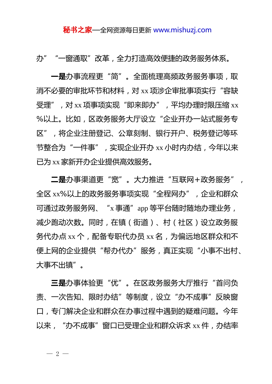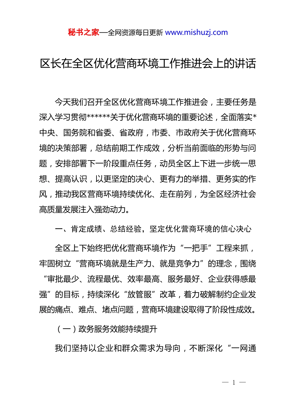 秘书之家—全网资源每日更新 www.mishuzj.com区长在全区优化营商环境工作推进会上的讲话今天我们召开全区优化营商环境工作推进会,主要任务是深入学习贯彻******关于优化营商环境的重要论述,全面落实*中央、国务院和省委、省政府,市委、市政府关于优化营商环境的决策部署,总结前期工作成效,分析当前面临的形势与问题,安排部署下一阶段重点任务,动员全区上下进一步统一思想、提高认识,以更坚定的决心、更有力的举措、更务实的作风,推动我区营商环境持续优化、走在前列,为全区经济社会高质量发展注入强劲动力。一、肯定成绩、总结经验,坚定优化营商环境的信心决心全区上下始终把优化营商环境作为“一把手”工程来抓,牢固树立“营商环境就是生产力、就是竞争力”的理念,围绕“审批最少、流程最优、效率最高、服务最好、企业获得感最强”的目标,持续深化“放管服”改革,着力破解制约企业发展的痛点、难点、堵点问题,营商环境建设取得了阶段性成效。(一)政务服务效能持续提升我们坚持以企业和群众需求为导向,不断深化“一网通— 1 —秘书之家—全网资源每日更新 www.mishuzj.com办”“一窗通取”改革,全力打造高效便捷的政务服务体系。一是办事流程更“简”。全面梳理高频政务服务事项,取消不必要的审批环节和材料,对 xx 项涉企审批事项实行“容缺受理”,对 xx 项事项实现“即来即办”,平均办理时限压缩 xx%以上。比如,区政务服务大厅设立“企业开办一站式服务专区”,将企业注册登记、公章刻制、银行开户、税务登记等环节整合为“一件事”,实现企业开办 xx 小时内办结,今年以来已为 xx 家新开办企业提供高效服务。二是办事渠道更“宽”。大力推进“互联网+政务服务”,全区 xx%以上的政务服务事项实现“全程网办”,企业和群众可通过政务服务网、“x 事通”app 等平台随时随地办理业务,减少跑动次数。同时,在镇(街道)、村(社区)设立政务服务代办点 xx 个,配备专职代办员 xx 名,为偏远地区群众和不便上网的企业提供“帮办代办”服务,真正实现“小事不出村、大事不出镇”。三是办事体验更“优”。在区政务服务大厅推行“首问负责、一次告知、限时办结”等制度,设立“办不成事”反映窗口,专门解决企业和群众在办事过程中遇到的疑难问题。今年以来,“办不成事”窗口已受理企业和群众诉求 xx 件,办结率— 2 —秘书之家—全网资源每日更新 www.mishuzj.com达 xx%,群众满意度达 xx%。此外,我们还开展“政务服务体验日”活动,邀请企业代表、人大代表、政协委员等走进政务服务大厅,亲身体验办事流程,提出意见建议,不断改进服务质量。(二)市场主体活力不断激发我们始终把培育和壮大市场主体作为优化营商环境的重要目标,着力营造公平竞争、宽松有序的市场环境。一是降本减负力度持续加大。全面落实国家和省、市出台的减税降费政策,通过“线上+线下”相结合的方式,广泛宣传政策内容,确保政策红利直达市场主体。今年以来,全区累计为市场主体减税降费 xx 亿元,其中增值税留抵退税 xx 亿元,惠及企业 xx 家。同时,降低企业要素成本,协调供电、供水、供气等部门出台优惠政策,对小微企业和个体工商户实行水电气价格优惠,预计全年可为企业节省要素成本 xx 万元。二是市场准入审批持续精简。全面实行市场准入负面清单制度,清单之外的领域,各类市场主体均可以依法平等进入。推进“证照分离”改革全覆盖,对 xx 项涉企经营许可事项实行分类改革,其中取消审批 xx 项、审批改备案 xx 项、实行告知— 3 —秘书之家—全网资源每日更新 www.mishuzj.com承诺 xx 项,进一步降低市场准入门槛。今年以来,全区新登记市场主体 xx 户,同比增长 xx%,其中企业 xx 户,个体工商户xx 户,市场主体数量和质量均实现稳步提升。三是市场竞争秩序持续优化。加强反不正当竞争执法,开展涉企收费专项检查,严厉查处乱收费、乱罚款、乱摊派等行为,今年以来已查处涉企违法违规案件 xx 起,罚没款 xx 万元。同时,推进社会信用体系建设,建立健全守信联合激励和失信联合惩戒机制,累计归集企业信用信息 x...
