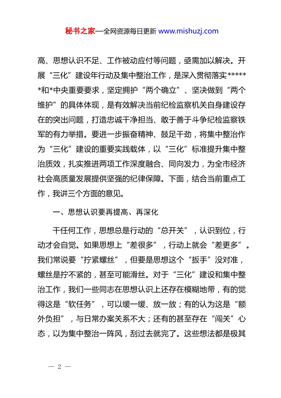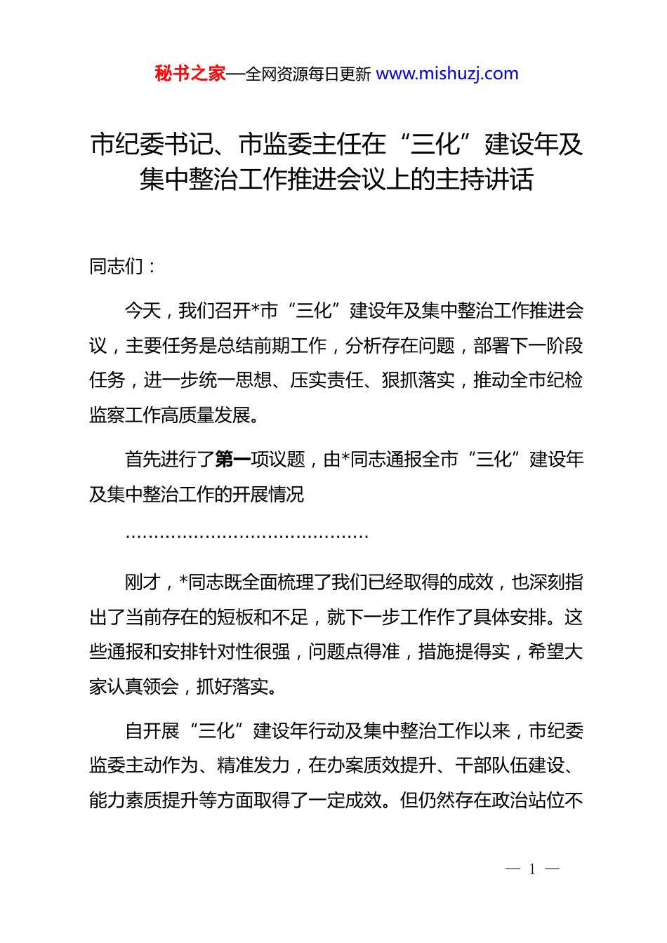 秘书之家—全网资源每日更新 www.mishuzj.com市纪委书记、市监委主任在“三化”建设年及集中整治工作推进会议上的主持讲话同志们:今天,我们召开*市“三化”建设年及集中整治工作推进会议,主要任务是总结前期工作,分析存在问题,部署下一阶段任务,进一步统一思想、压实责任、狠抓落实,推动全市纪检监察工作高质量发展。首先进行了第一项议题,由*同志通报全市“三化”建设年及集中整治工作的开展情况···········································刚才,*同志既全面梳理了我们已经取得的成效,也深刻指出了当前存在的短板和不足,就下一步工作作了具体安排。这些通报和安排针对性很强,问题点得准,措施提得实,希望大家认真领会,抓好落实。自开展“三化”建设年行动及集中整治工作以来,市纪委监委主动作为、精准发力,在办案质效提升、干部队伍建设、能力素质提升等方面取得了一定成效。但仍然存在政治站位不— 1 —秘书之家—全网资源每日更新 www.mishuzj.com高、思想认识不足、工作被动应付等问题,亟需加以解决。开展“三化”建设年行动及集中整治工作,是深入贯彻落实******和*中央重要要求,坚定拥护“两个确立”、坚决做到“两个维护”的具体体现,是有效解决当前纪检监察机关自身建设存在的突出问题,打造忠诚干净担当、敢于善于斗争纪检监察铁军的有力举措。要进一步振奋精神、鼓足干劲,将集中整治作为“三化”建设的重要实践载体,以“三化”标准提升集中整治质效,扎实推进两项工作深度融合、同向发力,为全市经济社会高质量发展提供坚强的纪律保障。下面,结合当前重点工作,我讲三个方面的意见。一、思想认识要再提高、再深化干任何工作,思想总是行动的“总开关”,认识到位,行动才会自觉。如果思想上“差很多”,行动上就会“差更多”。我们常说要“拧紧螺丝”,但要是思想这个“扳手”没对准,螺丝是拧不紧的,甚至可能滑丝。对于“三化”建设和集中整治工作,我们一些同志在思想认识上还存在模糊地带,有的觉得这是“软任务”,可以缓一缓、放一放;有的认为这是“额外负担”,与日常办案关系不大;还有的甚至存在“闯关”心态,以为集中整治一阵风,刮过去就完了。这些想法都是极其— 2 —秘书之家—全网资源每日更新 www.mishuzj.com有害的,必须坚决纠正。中央纪委国家监委**书记在动员部署会上深刻指出,开展“三化”建设年行动,是深入贯彻落实******和*中央重要要求,坚定拥护“两个确立”、坚决做到“两个维护”的具体体现;是推进新征程纪检监察工作高质量发展,打好反腐败斗争攻坚战持久战总体战的迫切需要;是进一步深化纪检监察体制改革,推动完善*的自我革命制度规范体系的重要途径。这“三个是”把“三化”建设的政治意义、现实意义和长远意义讲得非常透彻了。我们一定要从政治和全局的高度来审视这项工作,绝不能把它看轻了、看小了、看窄了。纪检监察机关是*的“纪律部队”,是推进*的自我革命的重要力量,我们在永葆*的先进纯洁、解决大*独有难题中肩负着特殊使命和重大责任。这就好比一座大厦的“承重墙”,如果承重墙本身不坚固、不规范,整座大厦的安全就无从谈起。我们的“三化”建设,就是要加固我们这支队伍自身的“承重墙”,确保我们能担得起重担、打得赢硬仗。自我革命是我们*跳出治乱兴衰历史周期率的第二个答案,而“三化”建设就是我们纪检监察机关进行自我革命的具体抓手和实战演练。它不是要我们另起炉灶,而是要求我们在原有的工作基础上,更加注重规矩、更加注重程序、更加注重规范,让每一项工作都能经得起历史、实践和人民的检验。这就像工匠打磨一件玉器,不仅要有好的— 3 —秘书之家—全网资源每日更新 www.mishuzj.com玉料(我们的初心使命),还要有标准的工艺流程(规范化)、精准的雕刻技法(法治化)和严谨的质量检验(正规化),缺一不可。前段时间,我们有的室组在办理一件涉及基层微权力的案件时,就因为调证程序上存在一个小小的瑕疵,虽然实体处理结果没问题,但还是被上级在评查中点了出来,差点影响了案件的整体效果。这就是规范化意识不强的一...