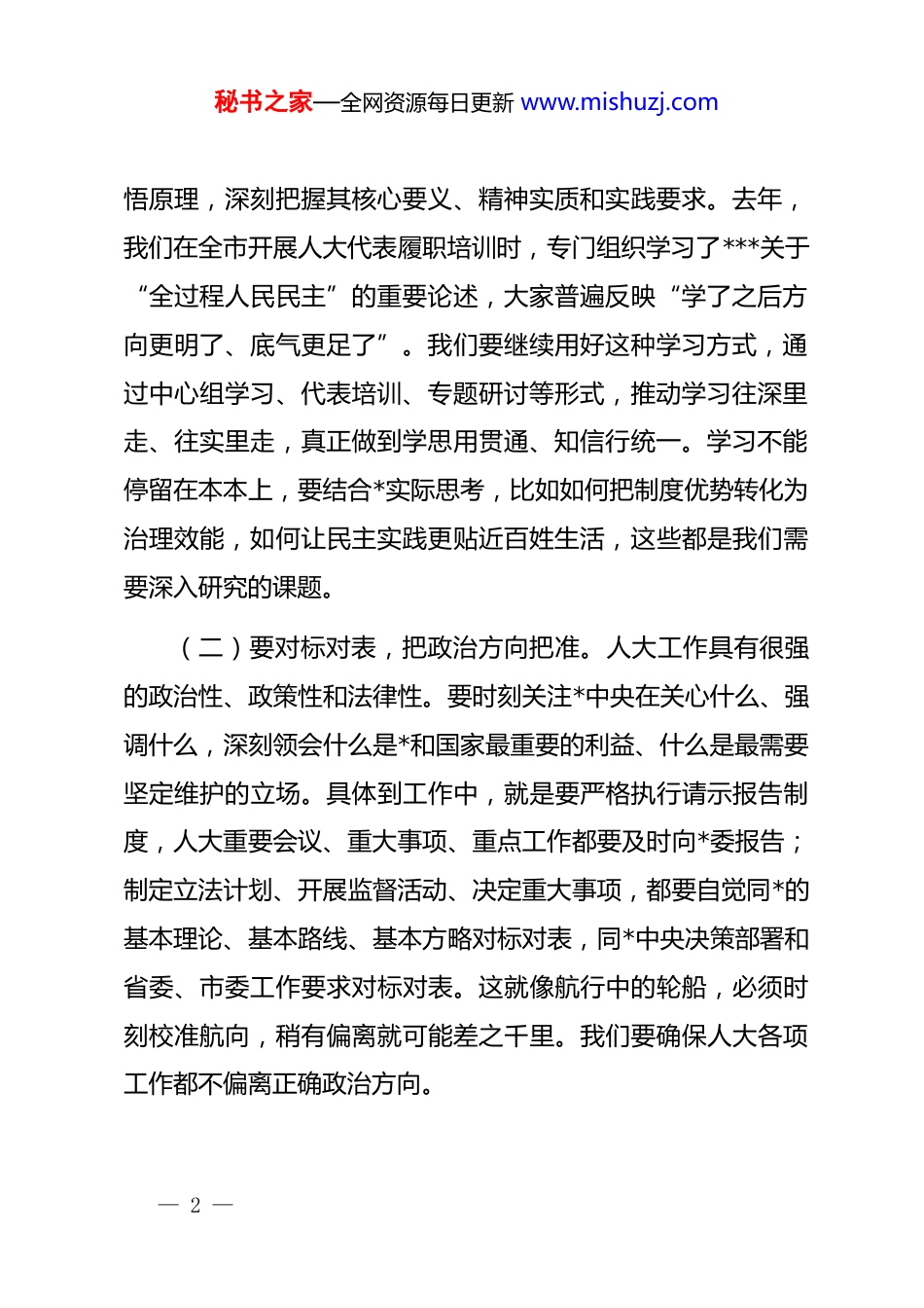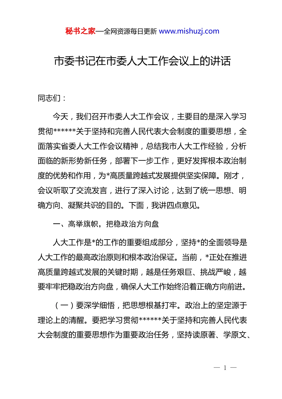 秘书之家—全网资源每日更新 www.mishuzj.com市委书记在市委人大工作会议上的讲话同志们:今天,我们召开市委人大工作会议,主要目的是深入学习贯彻******关于坚持和完善人民代表大会制度的重要思想,全面落实省委人大工作会议精神,总结我市人大工作经验,分析面临的新形势新任务,部署下一步工作,更好发挥根本政治制度的优势和作用,为*高质量跨越式发展提供坚实保障。刚才,会议听取了交流发言,进行了深入讨论,达到了统一思想、明确方向、凝聚共识的目的。下面,我讲四点意见。一、高举旗帜,把稳政治方向盘人大工作是*的工作的重要组成部分,坚持*的全面领导是人大工作的最高政治原则和根本政治保证。当前,*正处在推进高质量跨越式发展的关键时期,越是任务艰巨、挑战严峻,越要牢牢把稳政治方向盘,确保人大工作始终沿着正确方向前进。(一)要深学细悟,把思想根基打牢。政治上的坚定源于理论上的清醒。要把学习贯彻******关于坚持和完善人民代表大会制度的重要思想作为重要政治任务,坚持读原著、学原文、— 1 —秘书之家—全网资源每日更新 www.mishuzj.com悟原理,深刻把握其核心要义、精神实质和实践要求。去年,我们在全市开展人大代表履职培训时,专门组织学习了***关于“全过程人民民主”的重要论述,大家普遍反映“学了之后方向更明了、底气更足了”。我们要继续用好这种学习方式,通过中心组学习、代表培训、专题研讨等形式,推动学习往深里走、往实里走,真正做到学思用贯通、知信行统一。学习不能停留在本本上,要结合*实际思考,比如如何把制度优势转化为治理效能,如何让民主实践更贴近百姓生活,这些都是我们需要深入研究的课题。(二)要对标对表,把政治方向把准。人大工作具有很强的政治性、政策性和法律性。要时刻关注*中央在关心什么、强调什么,深刻领会什么是*和国家最重要的利益、什么是最需要坚定维护的立场。具体到工作中,就是要严格执行请示报告制度,人大重要会议、重大事项、重点工作都要及时向*委报告;制定立法计划、开展监督活动、决定重大事项,都要自觉同*的基本理论、基本路线、基本方略对标对表,同*中央决策部署和省委、市委工作要求对标对表。这就像航行中的轮船,必须时刻校准航向,稍有偏离就可能差之千里。我们要确保人大各项工作都不偏离正确政治方向。— 2 —秘书之家—全网资源每日更新 www.mishuzj.com(三)要融会贯通,把*的领导落实。坚持*的领导不是一句空话,要体现在行动上、落实到工作中。市委将一如既往重视和支持人大工作,定期听取人大常委会*组工作汇报,及时研究解决人大工作中的重大问题。各级人大要自觉维护*委总揽全局、协调各方的领导核心作用,善于通过法定程序将*的主张转化为人民共同意志。去年,市委作出“打造营商环境最优城市”部署后,市人大常委会迅速行动,开展专项监督,组织代表视察,推动了政策落地。这种围绕中心、服务大局的做法值得肯定。我们要继续坚持*委工作部署到哪里,人大工作就跟进到哪里,力量就汇聚到哪里,作用就发挥到哪里。二、服务大局,打出履职组合拳围绕中心、服务大局是人大工作的鲜明主题。人大依法行使立法权、监督权、决定权、任免权,这“四权”就像组合拳,要用得好、打得准,招招到位,切实为*高质量跨越式发展赋能助力。(一)要精准立法,立出特色立出实效。地方立法贵在精准、重在特色。要坚持“小切口、真管用”原则,聚焦经济社会发展中的突出问题、人民群众反映强烈的热点问题,开展创制性立法。比如,*作为成渝地区双城经济圈的重要节点城市,— 3 —秘书之家—全网资源每日更新 www.mishuzj.com可以围绕协同发展、产业协作等领域开展立法探索;作为生态宜居城市,可以在生态环境保护、城市治理等方面制定具有*特色的法规规章。立法过程要广泛听取意见,既要请专家“把脉”,也要让群众“吐槽”,确保每部法规都接地气、真管用。立法不是为立法而立法,而是要解决问题,就像看病开药,要对症下药,药到病除。(二)要有效监督,督到关键处监到点子上。监督是人大重要职权,但监督不是挑刺找茬,而是支持促进。要突出监督重点,紧紧围绕市委中心工...