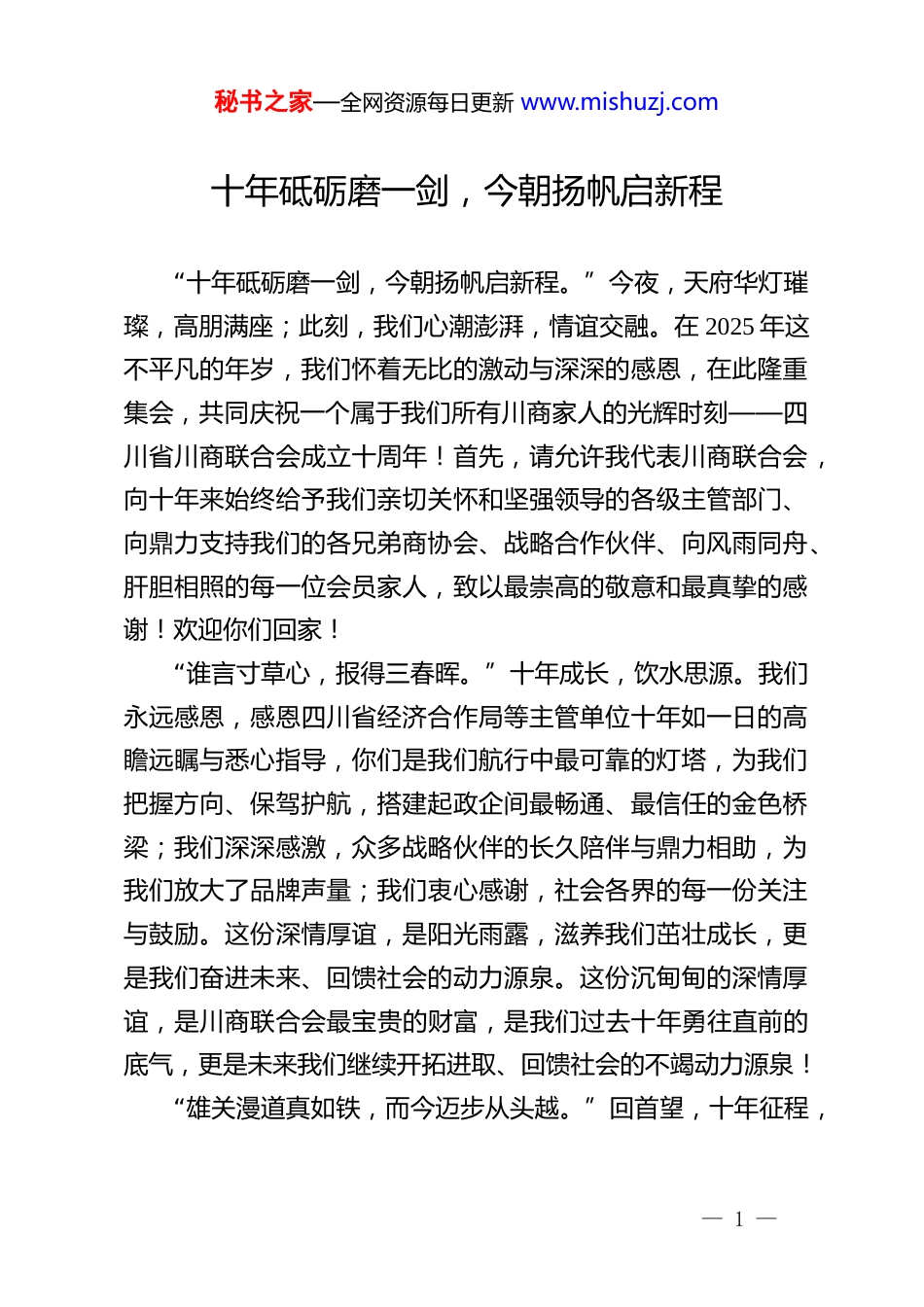 秘书之家—全网资源每日更新 www.mishuzj.com十年砥砺磨一剑,今朝扬帆启新程“十年砥砺磨一剑,今朝扬帆启新程。”今夜,天府华灯璀璨,高朋满座;此刻,我们心潮澎湃,情谊交融。在 2025 年这不平凡的年岁,我们怀着无比的激动与深深的感恩,在此隆重集会,共同庆祝一个属于我们所有川商家人的光辉时刻——四川省川商联合会成立十周年!首先,请允许我代表川商联合会,向十年来始终给予我们亲切关怀和坚强领导的各级主管部门、向鼎力支持我们的各兄弟商协会、战略合作伙伴、向风雨同舟、肝胆相照的每一位会员家人,致以最崇高的敬意和最真挚的感谢!欢迎你们回家!“谁言寸草心,报得三春晖。”十年成长,饮水思源。我们永远感恩,感恩四川省经济合作局等主管单位十年如一日的高瞻远瞩与悉心指导,你们是我们航行中最可靠的灯塔,为我们把握方向、保驾护航,搭建起政企间最畅通、最信任的金色桥梁;我们深深感激,众多战略伙伴的长久陪伴与鼎力相助,为我们放大了品牌声量;我们衷心感谢,社会各界的每一份关注与鼓励。这份深情厚谊,是阳光雨露,滋养我们茁壮成长,更是我们奋进未来、回馈社会的动力源泉。这份沉甸甸的深情厚谊,是川商联合会最宝贵的财富,是我们过去十年勇往直前的底气,更是未来我们继续开拓进取、回馈社会的不竭动力源泉!“雄关漫道真如铁,而今迈步从头越。”回首望,十年征程,— 1 —秘书之家—全网资源每日更新 www.mishuzj.com并非一路繁花,而是一部用汗水、智慧与情怀共同写就的奋斗史诗。十年间,我们的足迹覆盖四海,会员企业从涓涓细流汇聚成磅礴江河。这不仅仅是一个数字的增长,更是一个个鲜活的企业、一个个奋斗的川商人命运的联结。我们构建了从信息对接、金融赋能、法律护航到“招引-落地-孵化”的全链条服务平台,努力让“找到组织”的每一位家人,都能感受到实实在在的支撑与温暖。我们以“店小二”的姿态服务会员,以“桥头堡”的战略定位链接全球资源,逐渐擦亮了“四川省川商联合会”这块凝聚了无数信任与期待的金字招牌。2025 年川商联合会就迎来了 100 家新家人入会(含上市公司、专精特新企业、高新技术企业等 35 家,同时也含各级人大代表、政协委员等 18 位),重点吸纳新能源、数字经济、生物医药领域企业,会员产业匹配度显著提升。2025 年川商联合会也帮助地方政府落地招商引资 30 亿元,目前在推进优质意向落地项目超过 10个,合计投资金额过百亿元。2025 年川商联合会举办了各类活动 80 多场次,重点系列化举办了 5 期走进上市公司学习交流链接资源,5 期读书会启迪思维,与国内知名商学院长江商学院联合主办了近 300 人的 AI 创新大会和今天主办的超 500 人的2025 川商创新发展大会。每一次活动都是商会精心组织策划,为的就是给川商家人们带来更多视野、更多合作机会。这十年路上的每一个足迹、每一份成绩单的背后,都凝聚着在座每一位家人的拼搏身影,都闪烁着大家艰苦奋斗的汗水与光芒。今— 2 —秘书之家—全网资源每日更新 www.mishuzj.com夜,所有的掌声与荣耀,属于你们每一位!“同舟共济扬帆起,乘风破浪万里航。”十年间,最宝贵的收获,是我们共同构建了一个“有情有义、相互成就”的川商大家庭。困境中,我们雪中送炭,共渡难关;发展时,我们资源共享,合作共赢。这份“自己人”的温暖与信任,让我们穿越经济周期,行稳致远。今晚的宴会厅,就是一个最生动的缩影:这里有德高望重的创业前辈,有锐意进取的青年才俊,有稳如磐石的行业龙头,也有朝气蓬勃的科创新锐。老中青三代川商人济济一堂,传承的是精神,接力的是梦想,这本身就是我们川商事业生生不息、薪火相传的最有力证明!“看似寻常最奇崛,成如容易却艰辛。”站在十年的里程碑前,回望来路,我们满怀自豪;眺望前方,我们更感责任千钧。世界百年变局加速演进,科技发展一日千里,市场竞争愈发激烈,未来的道路绝非坦途。川商联合会也站在了自身发展的关键十字路口。变局之中,何为不变?我们的初心不变——“凝聚川商、服务川商、创新川商、成就川商”这十六个字,将永远是我们一切行动的出发点和落脚点:我们将...