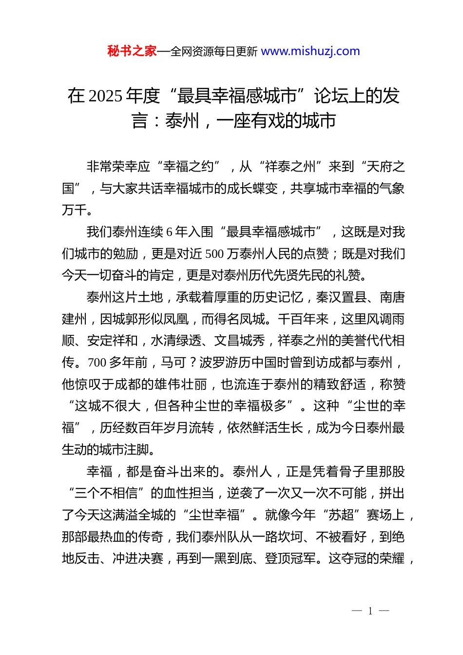 秘书之家—全网资源每日更新 www.mishuzj.com在 2025 年度“最具幸福感城市”论坛上的发言:泰州,一座有戏的城市非常荣幸应“幸福之约”,从“祥泰之州”来到“天府之国”,与大家共话幸福城市的成长蝶变,共享城市幸福的气象万千。我们泰州连续 6 年入围“最具幸福感城市”,这既是对我们城市的勉励,更是对近 500 万泰州人民的点赞;既是对我们今天一切奋斗的肯定,更是对泰州历代先贤先民的礼赞。泰州这片土地,承载着厚重的历史记忆,秦汉置县、南唐建州,因城郭形似凤凰,而得名凤城。千百年来,这里风调雨顺、安定祥和,水清绿透、文昌城秀,祥泰之州的美誉代代相传。700 多年前,马可?波罗游历中国时曾到访成都与泰州,他惊叹于成都的雄伟壮丽,也流连于泰州的精致舒适,称赞“这城不很大,但各种尘世的幸福极多”。这种“尘世的幸福”,历经数百年岁月流转,依然鲜活生长,成为今日泰州最生动的城市注脚。幸福,都是奋斗出来的。泰州人,正是凭着骨子里那股“三个不相信”的血性担当,逆袭了一次又一次不可能,拼出了今天这满溢全城的“尘世幸福”。就像今年“苏超”赛场上,那部最热血的传奇,我们泰州队从一路坎坷、不被看好,到绝地反击、冲进决赛,再到一黑到底、登顶冠军。这夺冠的荣耀,— 1 —秘书之家—全网资源每日更新 www.mishuzj.com如同一束夺目的光芒,不仅定格在领奖台上,更穿透夜空,照进每个泰州人的心底。积淀已久的幸福瞬间奔涌、沸腾,一句“这里是泰州,我们是冠军”,成为每个泰州人最自豪的幸福感言。事实上,泰州“逆袭而生”的幸福故事,远不止在绿茵场上。八百年前,泰州先民在溱湖之上勇抗金兵,上演了以弱胜强的壮举,历经岁月演变,化作今日千舟竞发、鼓荡山河的会船盛景,“天下会船数溱潼”的名号至今响彻四方。抗日战争时期,黄桥战役七千将士对决三万敌军,以信念为甲、以民心为盾,最终赢得胜利,一曲《黄桥烧饼歌》传唱至今,仍在诉说着“人心向背定胜负”的深刻真理。解放战争初期,人民军队在这里逆风而行、以少胜多,开创了“七战七捷”的辉煌战绩,彰显了“正义终将战胜强权”。渡江战役前夕,苏北行政公署在泰州成立,古老的泰州重获新生,率先升起了渡江“东线第一帆”。朝鲜战场上,面对气焰嚣张的强大敌人,泰州好儿女杨根思,发出了“不相信有完不成的任务,不相信有克服不了的困难,不相信有战胜不了的敌人”的“三个不相信”英雄宣言,以“钢少气多”力克“钢多气少”,谱写了感天动地的英雄壮歌、筑起了特级英雄的伟大丰碑。改革开放后,泰州作为江苏的计划单列市,在“规模经济”的助力下,1996 年破茧成蝶,升格为江苏最年轻的设区市,由此唱响了属于自己的“青春之歌”。进入新时代,泰州经济总量连续跨越 5 个千亿— 2 —秘书之家—全网资源每日更新 www.mishuzj.com级台阶,2024 年更是突破 7000 亿元,全国首个国家级医药高新区、全国最大的民营造船基地在此落地,两大国家先进制造业集群强势崛起,让泰州拥有了领跑全省的产业硬实力。而创造10 项世界纪录的常泰长江大桥,更如一道飞虹横跨天堑,将泰州“通江达海”的优势,实实在在转化为高质量发展的奔腾胜势。如果说,“逆袭”,是泰州幸福里最有力量的“硬气”,那么,水,则是泰州幸福当中最为动人的“温柔”。泰州的“泰”字,拆解开来便是“人在三水中”,这一字形,正是泰州,与水共生共荣的生动写照。早在 6000 多年前,长江、淮河、黄海三水在此交汇,不仅滋养出这片土地肥沃、物产丰饶的鱼米之乡,孕育出双水绕城、人水和谐的独特魅力,更激荡出“海潮喷于乾坤,江城入于泱漭”的雄浑大观。如今,十里溱湖烟波浩渺,百里长江奔涌向前,千年城河静水流深,万亩花海相映成趣,交织密布的水网,将泰州人的生活浸润得从容不迫。泰州人常说“早上皮包水,晚上水包皮”,道尽了“水城慢生活”的闲适。清晨,一壶清茶,一碟烫干丝,一笼蟹黄包,一碗鱼汤面,一天的诗意便从这升腾的热气中缓缓展开。烫干丝的嫩滑,蟹黄包的鲜香,鱼汤面的醇厚,每一口都是水城独有的风味,更是岁月沉淀下来的踏实幸福。除了“硬气”的奋斗与“温柔”...