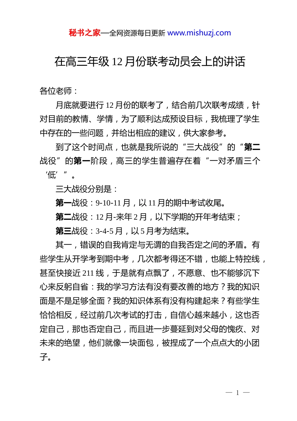 秘书之家—全网资源每日更新 www.mishuzj.com在高三年级 12 月份联考动员会上的讲话各位老师:月底就要进行 12 月份的联考了,结合前几次联考成绩,针对目前的教情、学情,为了顺利达成预设目标,我梳理了学生中存在的一些问题,并给出相应的建议,供大家参考。到了这个时间点,也就是我所说的“三大战役”的“第二战役”的第一阶段,高三的学生普遍存在着“一对矛盾三个‘低’”。三大战役分别是:第一战役:9-10-11 月,以 11 月的期中考试收尾。第二战役:12 月-来年 2 月,以下学期的开年考结束;第三战役:3-4-5 月,以 5 月考为结束。其一,错误的自我肯定与无谓的自我否定之间的矛盾。有些学生从开学考到期中考,几次都考得还不错,也能上特控线,甚至快接近 211 线,于是就有点飘了,不愿意、也不能够沉下心来反躬自省:我的学习方法有没有要改善的地方?我的知识面是不是足够全面?我的知识体系有没有构建起来?有些学生恰恰相反,经过前几次考试的打击,自信心越来越小,这也否定自己,那也否定自己,而且进一步蔓延到对父母的愧疚、对未来的绝望,他们就像一块面包,被捏成了一个点点大的小团子。— 1 —秘书之家—全网资源每日更新 www.mishuzj.com对我们老师来说,一方面要勉励学生肯定进步,绝不妄自尊大;一方面要鼓励学生放眼长远,绝不妄自菲薄。精准地对照每一个学生,精确地进行分析和引导,一定要对症施治。其二,低效能的“持久战”。冬天来了,白昼短、夜漫长一些学生陷入了低效的时间战,恨不得每天都干通宵,实际上,他们任务不明确,目标不具体,我们老师要指导学生将时间进行分割,积极进行限时训练。比如一旦老师不考试了,不讲题了,时间都归自己支配了,那就要马上思考:“接下来的一个小时我要做什么?做到什么程度?”可以做某个学科的某个单元的思维导图,一个小时到了,必须完工;可以做某个学科的某张试卷的哪些题。其三,低受益的“内卷战”。还有些学生困在低价值的消耗战中,大量的时间消耗在某个学科上,而这个学科往往是自己相对擅长的,知识掌握程度比较好的。他一旦开始自己学习,马上抽出一本资料或者一张试卷,从第一题开始做,做到不会的,就跳过,等题目做完了,把答案翻过来,对照着一看:“哦,这个我对了,开心!”“哦,这题答案给的是这个。”简单地改过来、看一遍,就将卷子收起来,觉得自己已经会了。这看起来是在用功,实际上是简单的重复劳动,会的还会,不会的还是不会。高三的时间太宝贵了,消耗战又是避免不了的,那就一定要“咬定青山不放松,任尔东西南北风”,历史类的学生死死— 2 —秘书之家—全网资源每日更新 www.mishuzj.com揪住数学不放,务必要追求质的突破,要过及格线,要上三位数,不达目标不罢休。物理类的学生要紧紧抓住英语,张开嘴,多背书,不能惯性思维:“我们理科生就是刷题。”其四,低续航的“消耗战”。还有些学生坠入无边的疲劳战中,每天不是趴在桌上背书,就是趴在桌上做题,一丁点运动都没有。这样不好,清早起来之后,做一套热身运动,打通任督二脉,血气自由贯通;傍晚时间再紧,也要抽空去操场走几圈,走着走着就跑起来,慢慢跑,坚持下去,不但身心得以调节,而且还能减肥。把这个道理讲给女同学们听,可能很有吸引力。“‘小镇做题家’恰恰是生活的强者,在现有资源条件约束下,他们拼尽全力攀登突围,展现出来的恰恰是‘奋斗’二字。”(P376),这段话说得真好。我们学生的每一分努力,都值得被看见、被肯定。让我们用更多的耐心、更科学的指导,去点燃他们的信心,优化他们的方法,调节他们的状态。期待通过我们共同的努力,在 12 月的联考中,能看到学生们芝麻开花节节高,打出“第二战役”的开门红!今天重点分析了学生层面,下次会议,我们将着重探讨老师层面如何优化教学、协同作战,共同迎接挑战。(引文出自之江轩编著《笔墨当随时代》,杭州:浙江人民出版社,2022.11)— 3 —