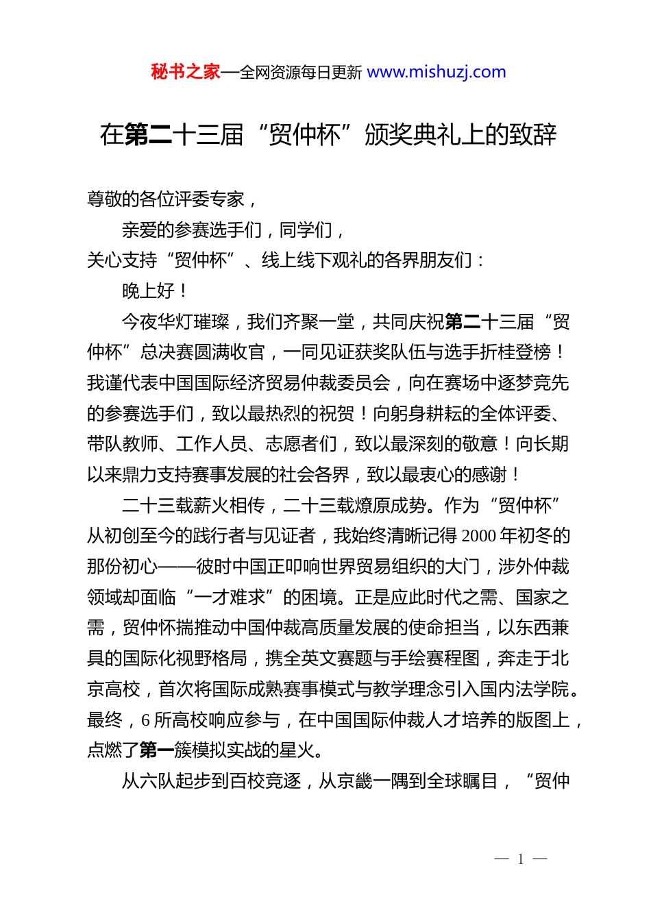 秘书之家—全网资源每日更新 www.mishuzj.com在第二十三届“贸仲杯”颁奖典礼上的致辞尊敬的各位评委专家,亲爱的参赛选手们,同学们,关心支持“贸仲杯”、线上线下观礼的各界朋友们:晚上好!今夜华灯璀璨,我们齐聚一堂,共同庆祝第二十三届“贸仲杯”总决赛圆满收官,一同见证获奖队伍与选手折桂登榜!我谨代表中国国际经济贸易仲裁委员会,向在赛场中逐梦竞先的参赛选手们,致以最热烈的祝贺!向躬身耕耘的全体评委、带队教师、工作人员、志愿者们,致以最深刻的敬意!向长期以来鼎力支持赛事发展的社会各界,致以最衷心的感谢!二十三载薪火相传,二十三载燎原成势。作为“贸仲杯”从初创至今的践行者与见证者,我始终清晰记得 2000 年初冬的那份初心——彼时中国正叩响世界贸易组织的大门,涉外仲裁领域却面临“一才难求”的困境。正是应此时代之需、国家之需,贸仲怀揣推动中国仲裁高质量发展的使命担当,以东西兼具的国际化视野格局,携全英文赛题与手绘赛程图,奔走于北京高校,首次将国际成熟赛事模式与教学理念引入国内法学院。最终,6 所高校响应参与,在中国国际仲裁人才培养的版图上,点燃了第一簇模拟实战的星火。从六队起步到百校竞逐,从京畿一隅到全球瞩目,“贸仲— 1 —秘书之家—全网资源每日更新 www.mishuzj.com杯”的二十三年,是中国仲裁事业从跟跑、并跑到领跑的缩影,更是国际视野法律人才培养的壮阔篇章:第二届贸仲杯便打破地域壁垒,14 所高校学子跨越神州相见;2012 年,贸仲规则适用国际 VisMoot 核心赛事,中国仲裁规则获世界认可;2021 年创新线上模式,吸引广大国际学子参赛,建造中外法治青年交锋交友殿堂;2021 年还设立“贸仲杯之友”平台,推出“贸仲杯之声”系列培训,汇聚全球专家才俊力量,做精做实“以赛促学”初心。本届赛事再攀新高:来自埃及、哈萨克斯坦、英国、匈牙利、中国香港、中国澳门等国家和地区的 103 所法学院校的 1000 余名选手同台竞技,“线上+线下”模式 221 场对决尽显风采,特别是,英国伦敦大学法学院(UCL)参赛队员不远万里来到北京参赛,今晚也在现场,欢迎你们;23 家国际仲裁机构联合支持,27 个国家和地区的 279 名专家评委躬身评判,9 期“贸仲杯之声”共九万人次参与,本届赛事线上直播总观看量超过 109 万人次,规模与国际化程度再创新高。二十三年间,超过 2 万名学子在此锤炼,佼佼者遍布国内外高校、顶尖律所、政府部门、仲裁机构及跨国企业,已成全球治理中坚力量!“贸仲杯”的意义,已远远不止于一场宏大且精细的国际赛事。它是国际仲裁人才培养的“主阵地”,二十三年输送数万专业力量,筑牢法治队伍根基;它是中国法学教育革新的“破冰者”,率先引领案例教学与实践育人模式融合,为高等院校— 2 —秘书之家—全网资源每日更新 www.mishuzj.com创新实践提供了可复制的有效路径;它是仲裁事业发展的“助推器”,开创性搭建起实务界与教育界联合育人的桥梁,如今各类仲裁赛事已在全国遍地开花、蔚然成风;它更是中国仲裁向世界发出的“邀请函”与“国际名片”,让中国青年人才走向世界舞台,让世界认识中国仲裁。我更想表达的是,这份成绩得来不易,是社会各界同心铸就的丰碑!感谢高校同仁深耕一线,全力支持,你们是人才之根;感谢全球评委公正严谨评判、精妙悉心点拨,你们是赛事之魂;感谢专家团组解析赛题、指导裁判、评选文书,你们是支撑之盾;感谢参赛选手以青春赴使命,打磨技艺、彰显风采,你们是传承之脉;感谢社会各界携手同心、鼎力相助,你们是护航之风;更感谢贸仲同仁和全体工作人员不计付出、兢兢业业、精益求精,你们是代际传承的核心力量!同仁们,朋友们,当前,中国“十五五”规划的宏伟蓝图已全面铺展。在经济全球化深入发展的今天,加快提升跨境法治服务能力,完善国际商事仲裁机制,既是中国自身高质量发展的内在需求,也是我们回应全球经贸合作诉求、共同维护国际经济秩序的重要责任。“贸仲杯”深耕二十三载,早已成为践行这份使命、扛起这份担当的关键平台。我有幸亲历中国仲裁事业从规模扩张到品质提升、从区域影响到全球瞩目的发展...