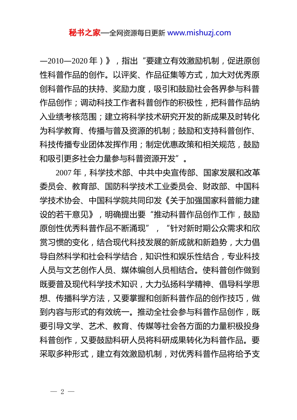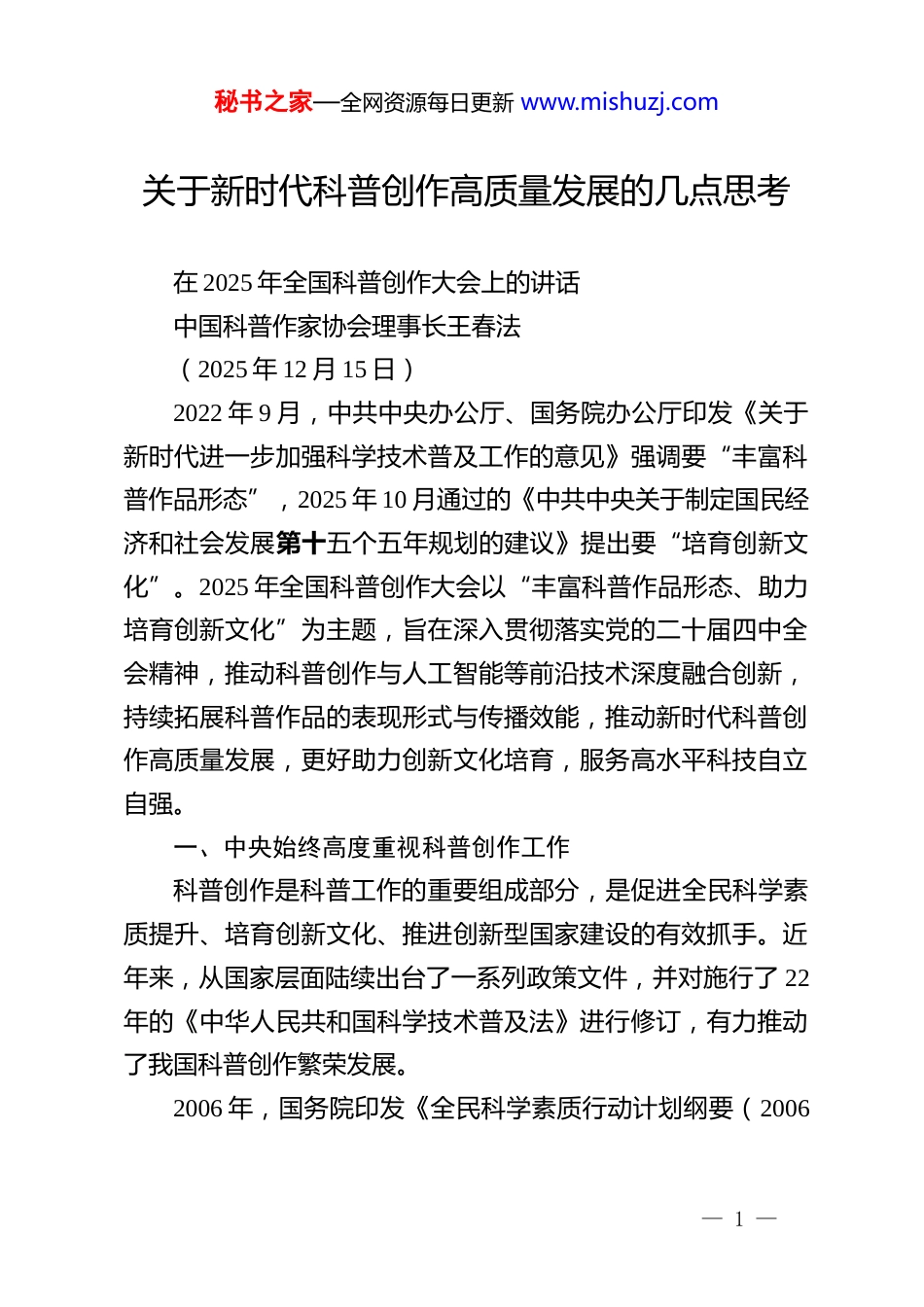 秘书之家—全网资源每日更新 www.mishuzj.com关于新时代科普创作高质量发展的几点思考在 2025 年全国科普创作大会上的讲话中国科普作家协会理事长王春法(2025 年 12 月 15 日)2022 年 9 月,中共中央办公厅、国务院办公厅印发《关于新时代进一步加强科学技术普及工作的意见》强调要“丰富科普作品形态”,2025 年 10 月通过的《中共中央关于制定国民经济和社会发展第十五个五年规划的建议》提出要“培育创新文化”。2025 年全国科普创作大会以“丰富科普作品形态、助力培育创新文化”为主题,旨在深入贯彻落实党的二十届四中全会精神,推动科普创作与人工智能等前沿技术深度融合创新,持续拓展科普作品的表现形式与传播效能,推动新时代科普创作高质量发展,更好助力创新文化培育,服务高水平科技自立自强。一、中央始终高度重视科普创作工作科普创作是科普工作的重要组成部分,是促进全民科学素质提升、培育创新文化、推进创新型国家建设的有效抓手。近年来,从国家层面陆续出台了一系列政策文件,并对施行了 22年的《中华人民共和国科学技术普及法》进行修订,有力推动了我国科普创作繁荣发展。2006 年,国务院印发《全民科学素质行动计划纲要(2006— 1 —秘书之家—全网资源每日更新 www.mishuzj.com—2010—2020 年)》,指出“要建立有效激励机制,促进原创性科普作品的创作。以评奖、作品征集等方式,加大对优秀原创科普作品的扶持、奖励力度,吸引和鼓励社会各界参与科普作品创作;调动科技工作者科普创作的积极性,把科普作品纳入业绩考核范围;建立将科学技术研究开发的新成果及时转化为科学教育、传播与普及资源的机制;鼓励和支持科普创作、科技传播专业团体发挥作用;制定优惠政策和相关规范,鼓励和吸引更多社会力量参与科普资源开发”。2007 年,科学技术部、中共中央宣传部、国家发展和改革委员会、教育部、国防科学技术工业委员会、财政部、中国科学技术协会、中国科学院共同印发《关于加强国家科普能力建设的若干意见》,明确提出要“推动科普作品创作工作,鼓励原创性优秀科普作品不断涌现”,“针对新时期公众需求和欣赏习惯的变化,结合现代科技发展的新成就和新趋势,大力倡导自然科学和社会科学结合,知识性和娱乐性结合,专业科技人员与文艺创作人员、媒体编创人员相结合。使科普创作做到既要普及现代科学技术知识,大力弘扬科学精神、倡导科学思想、传播科学方法,又要掌握和创新科普作品的创作技巧,做到内容与形式的有效统一。推动全社会参与科普作品创作,既要引导文学、艺术、教育、传媒等社会各方面的力量积极投身科普创作,又要鼓励科研人员将科研成果转化为科普作品。要采取多种形式,建立有效激励机制,对优秀科普作品将给予支— 2 —秘书之家—全网资源每日更新 www.mishuzj.com持和奖励”。2019 年,中共中央办公厅、国务院办公厅印发《关于进一步弘扬科学家精神加强作风和学风建设的意见》。文件强调,要“建立科技界与文艺界定期座谈交流、调研采风机制,引导支持文艺工作者运用影视剧、微视频、小说、诗歌、戏剧、漫画等多种艺术形式,讲好科技工作者科学报国故事”,“支持有条件的高等学校和中学编排创作演出反映科学家精神的文艺作品”。2021 年,国务院印发《全民科学素质行动规划纲要(2021—2035 年)》。文件明确提出,要“提升优质科普内容资源创作和传播能力,推动传统媒体与新媒体深度融合,建设即时、泛在、精准的信息化全媒体传播网络,服务数字社会建设”。文件要求,“实施繁荣科普创作资助计划,支持优秀科普原创作品。支持面向世界科技前沿、面向经济主战场、面向国家重大需求、面向人民生命健康等重大题材开展科普创作。大力开发动漫、短视频、游戏等多种形式科普作品。扶持科普创作人才成长,培养科普创作领军人物”。2022 年,中共中央办公厅、国务院办公厅印发《关于新时代进一步加强科学技术普及工作的意见》。文件强调,要“加强科普作品创作”,要“以满足公众需求为导向,持续提升科普作品原创能力。依托现有科研、教育、文化等力量,实施科普精品工程,聚焦‘四个面向’创作一批优...